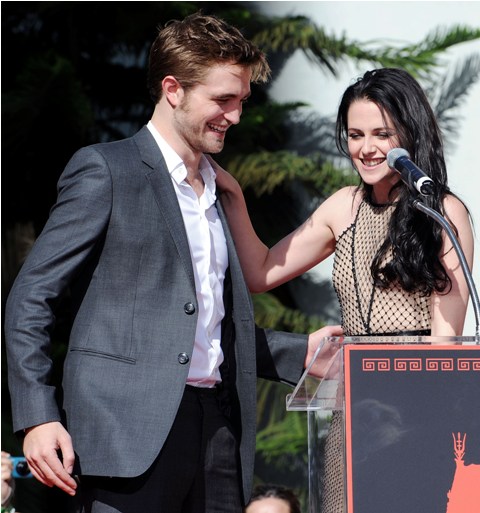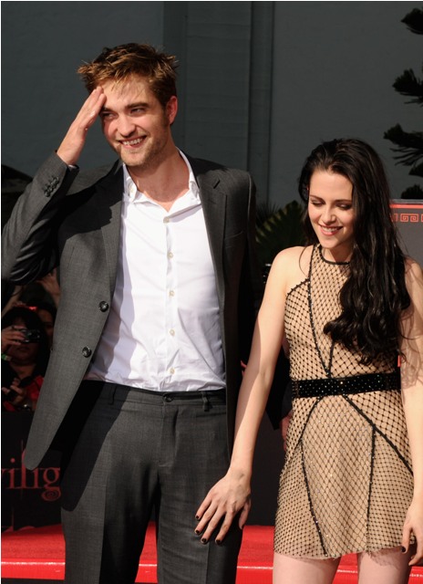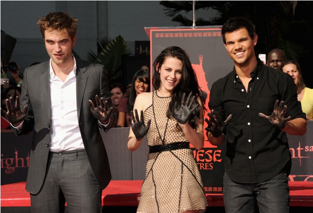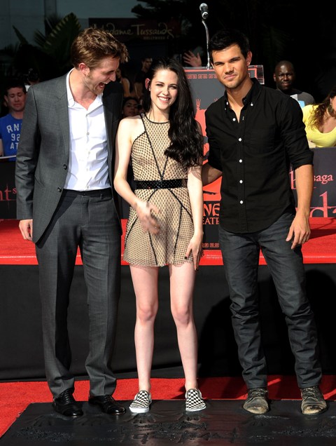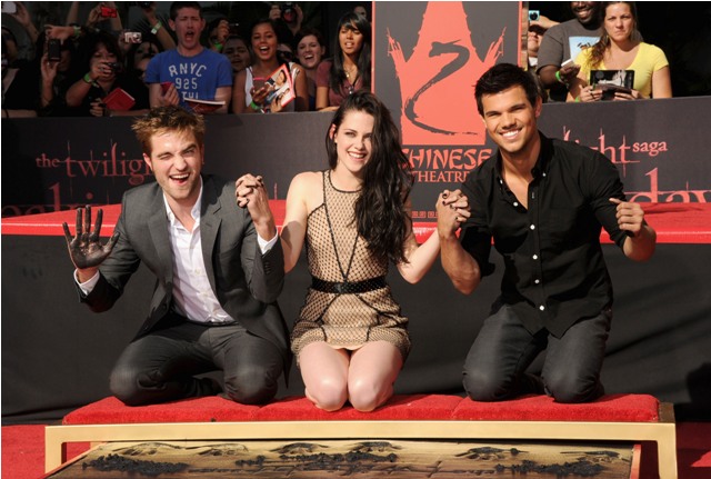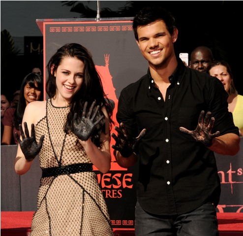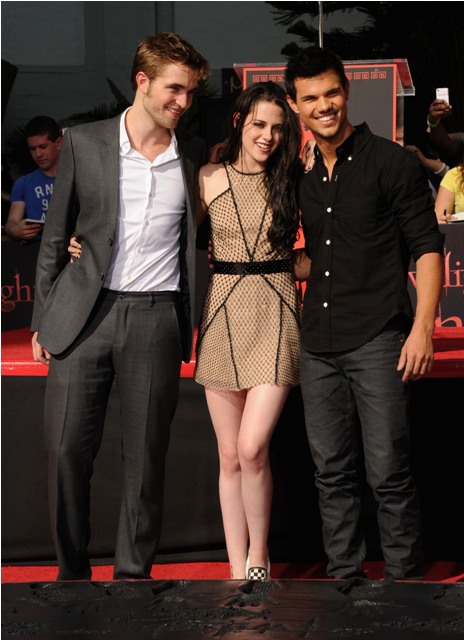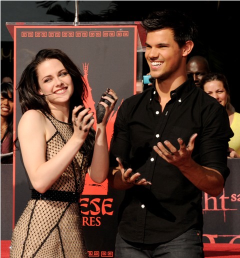 As noted yesterday in the Twi-Hard Immortal article, Kristen Stewart, Robert Pattinson, and Taylor Lautner had their hand and footprints cemented in Hollywood. It was worth it for the crazies in attendance. Not only because their beloved story was commemorated forever at the historic Grauman’s, but also because Stewart and Pattinson were very, very cute together, no longer as reticent, particularly on her part, to behave as a couple. Which they are. Still. And fine.