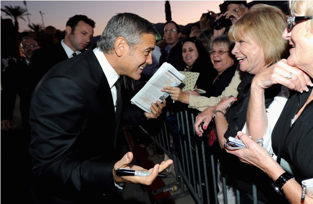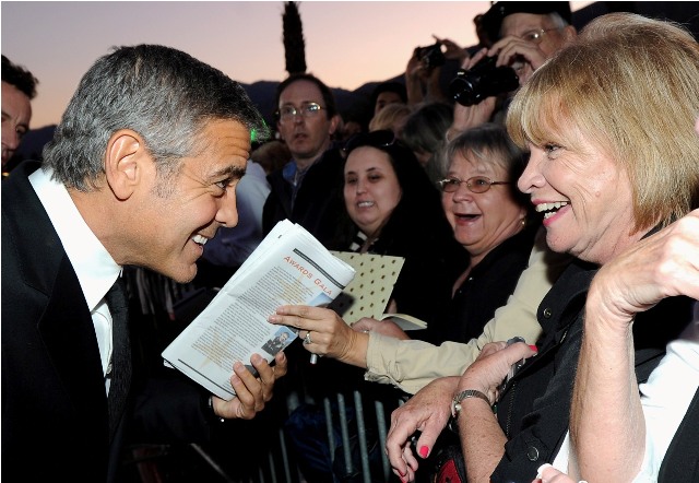 I want you to look at the first photo I’ve posted. Of Clooney stopping to sign autographs for that excited, mature lady. I spent the day in Palm Springs. There are a lot of Academy voters and influencers who live in Palm Springs. They look a lot like that lady. That’s exactly who he does it for. So every time you groan at his sh-t and wonder if it’s working? Remember her face. It’s working for her.