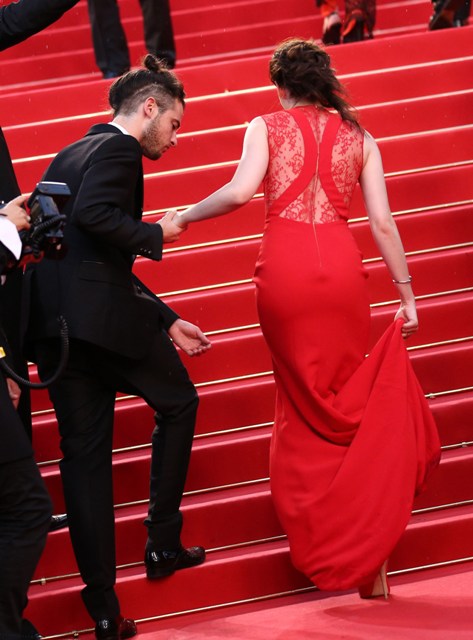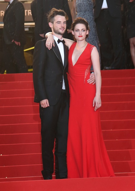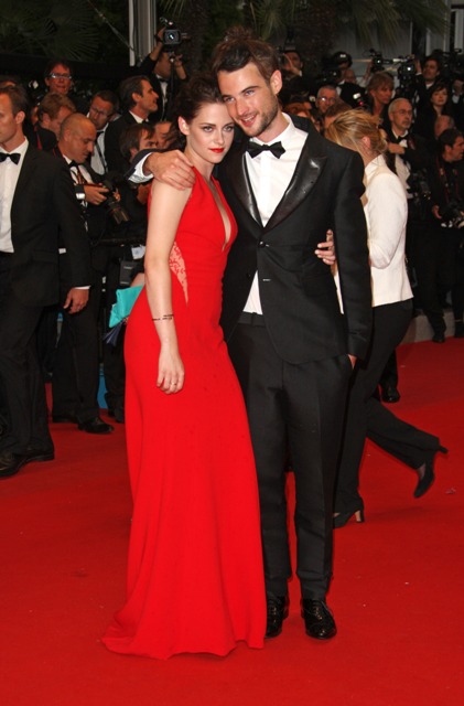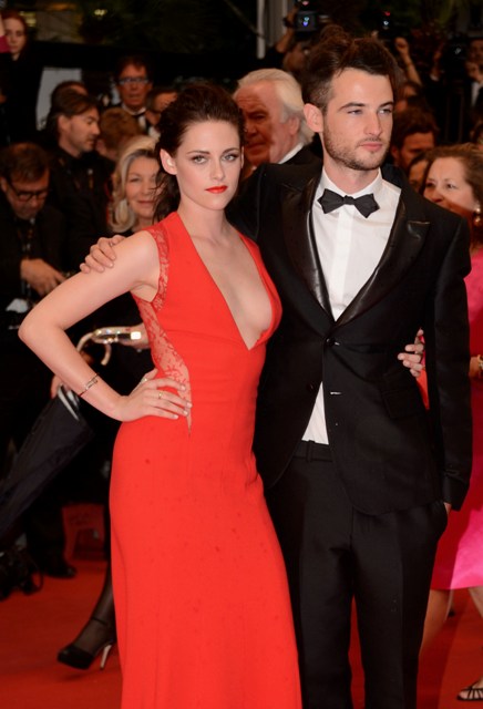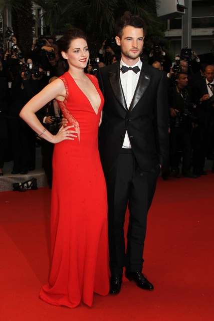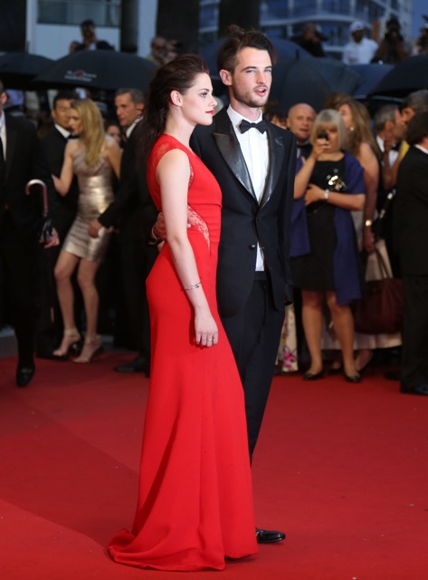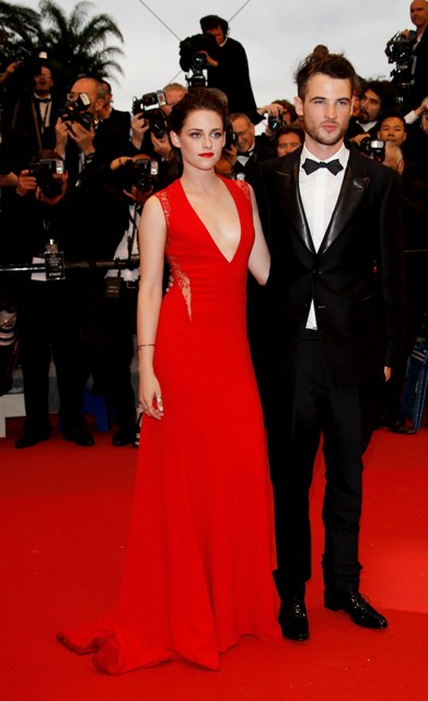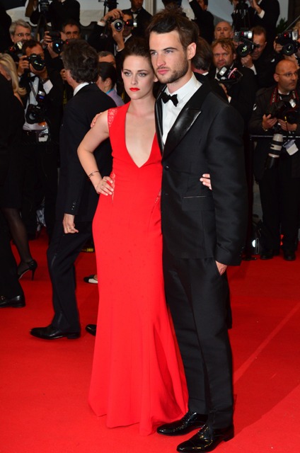 Kristen Stewart was rather vampy the other day on the carpet in Cannes for the premiere of her film On The Road. Tonight she took it to another level to support her boyfriend, seen here with his best friend Tom Sturridge, in red and side-breasty for Cosmopolis at the Palais, extending the stretch of bliss that Twi-Hards have been enjoying during Bella and Edward’s tour of the Croisette.