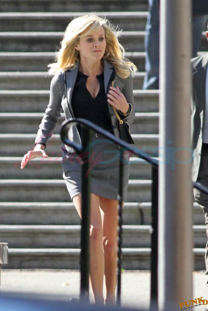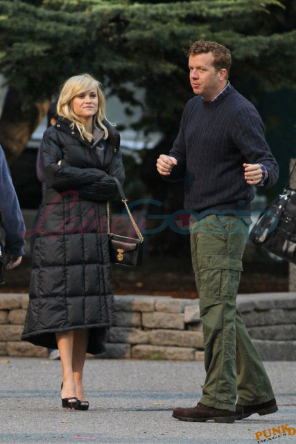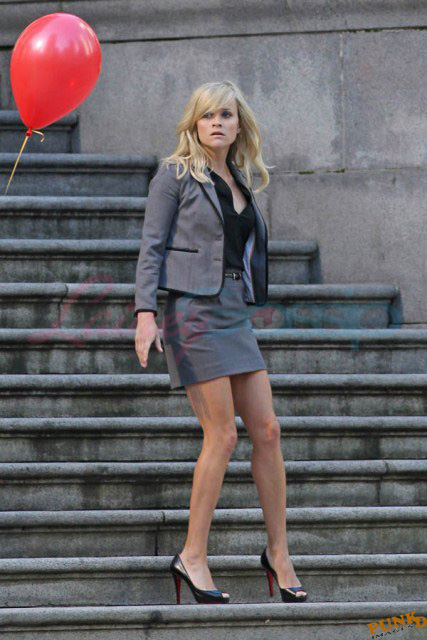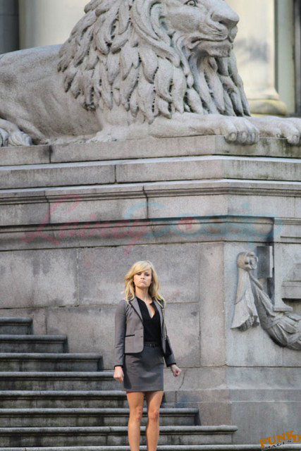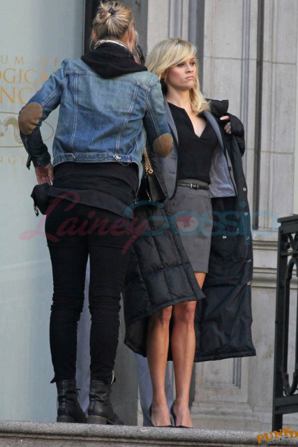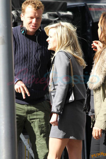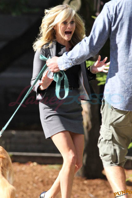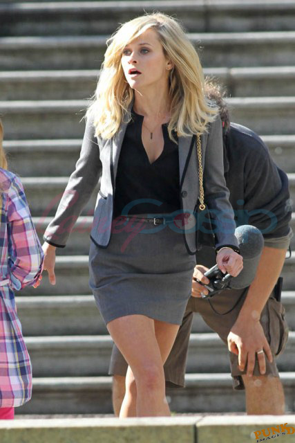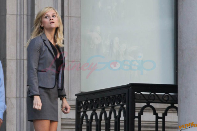 This is Reese Witherspoon shooting This Means War in Vancouver yesterday at the art gallery showing off a variety of facial expressions – zany! highjinks! goofy! Moviemaking is so bizarre sometimes.
