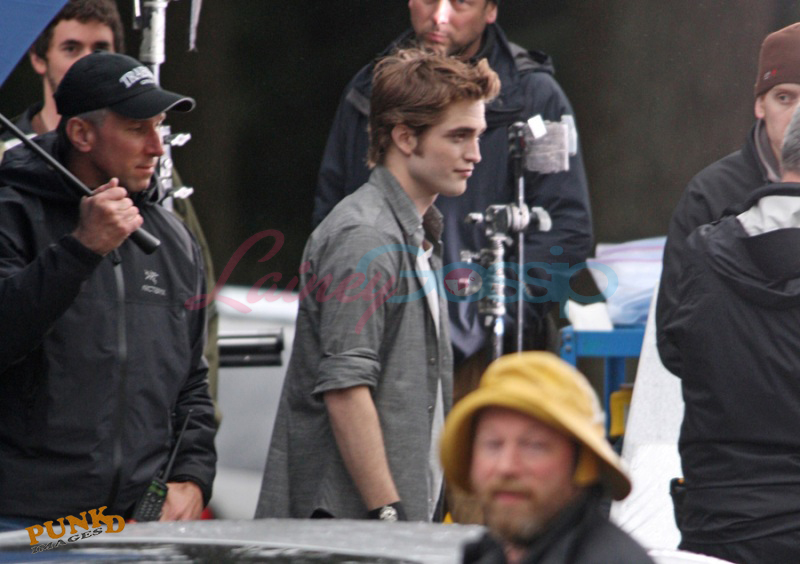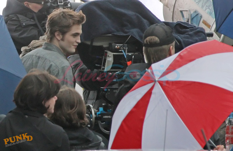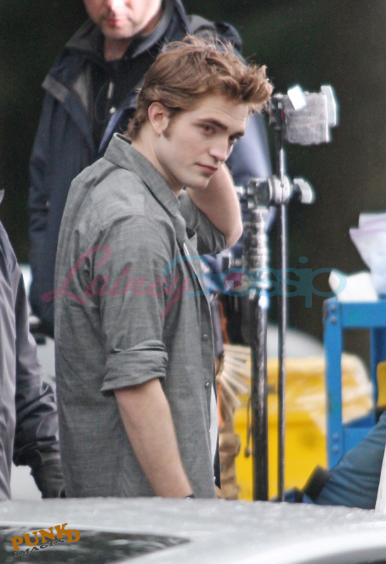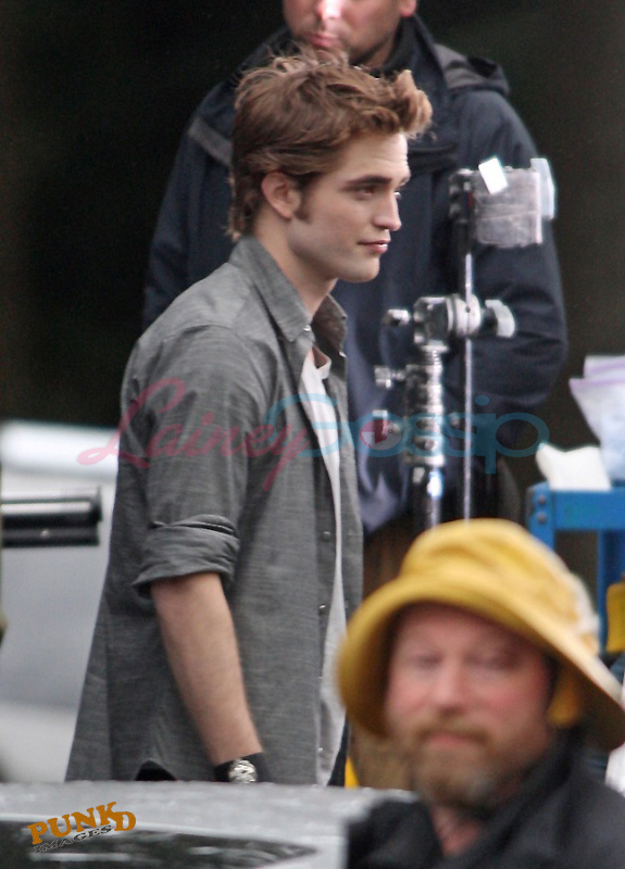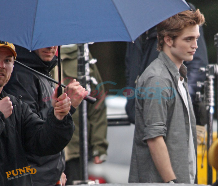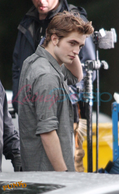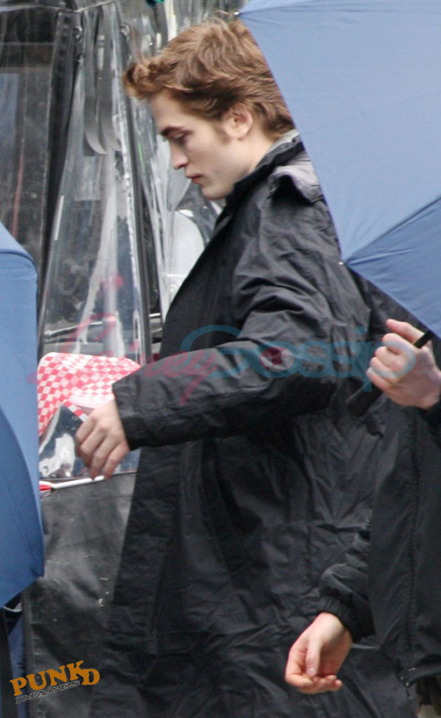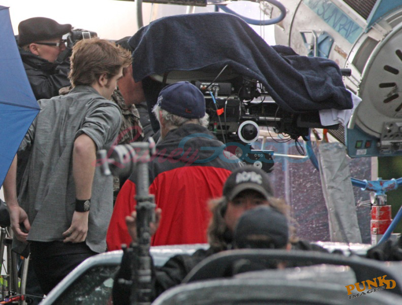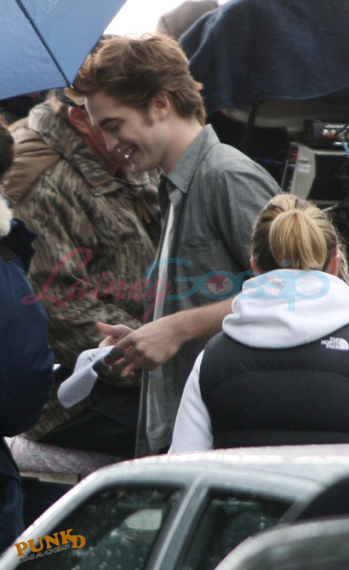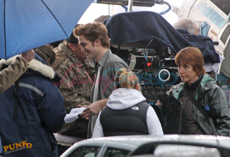 Exclusive photos: Robert Pattinson and Kristen Stewart shooting scenes for New Moon together today along with the high school crew and a glimpse of Tayor Lautner too. Looks like they’re doing a much, much better job with the makeup this time around especially Pattinson’s Edward. Very pretty. He is a beautiful, beautiful boy. The hair. The hair is working.