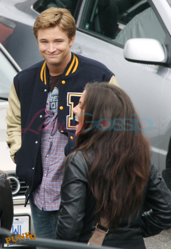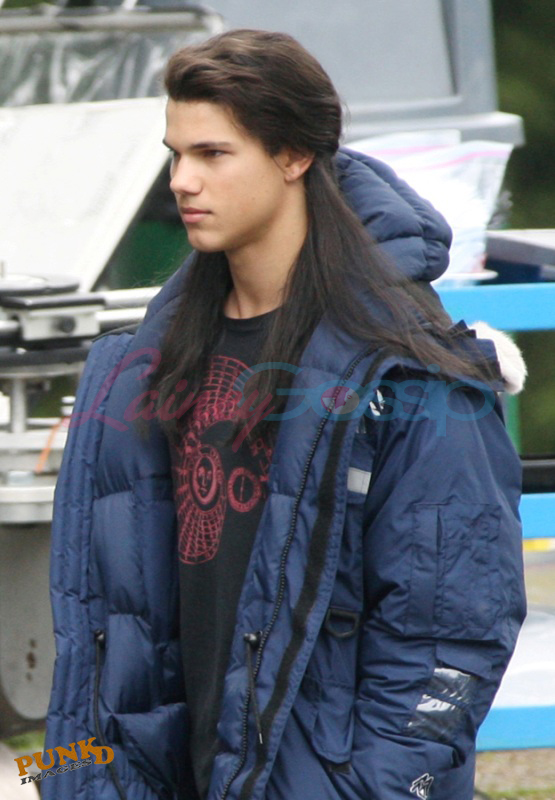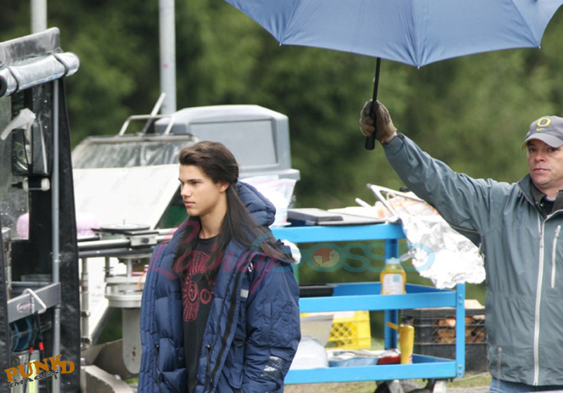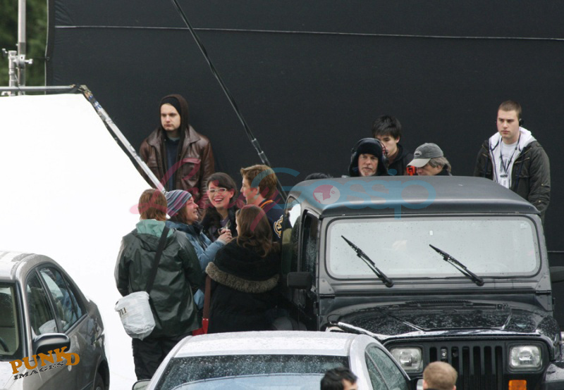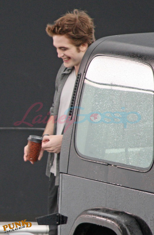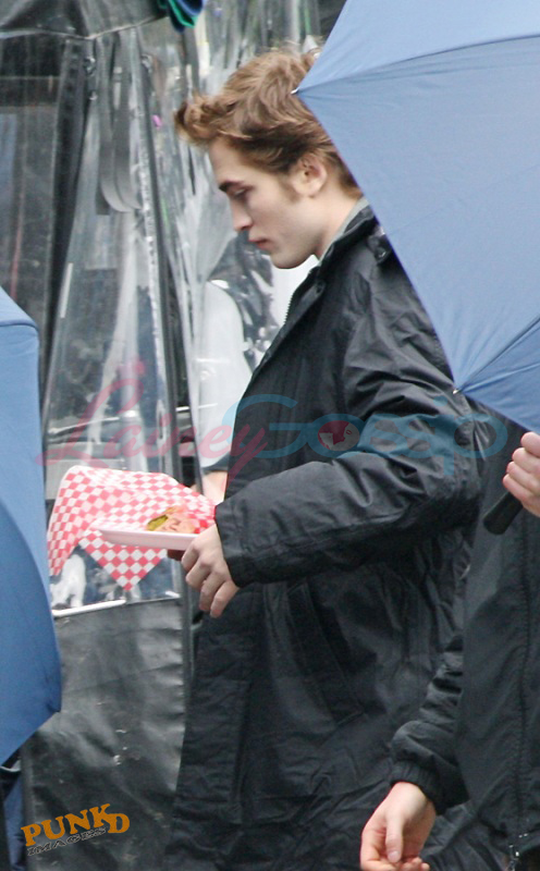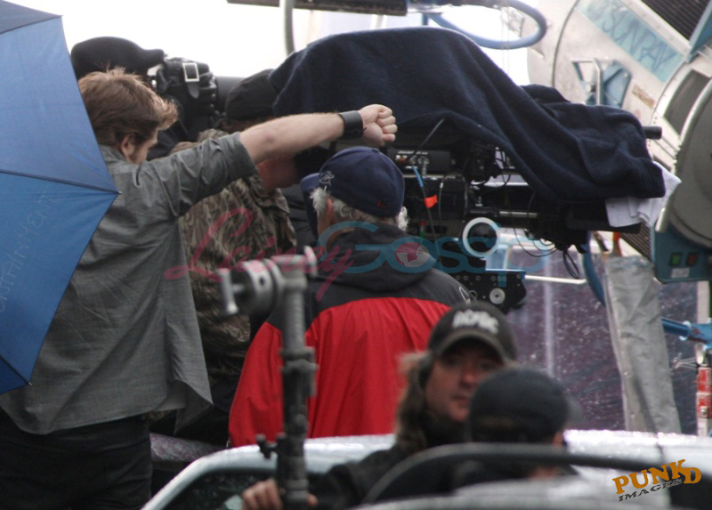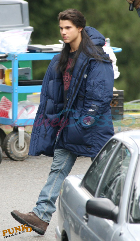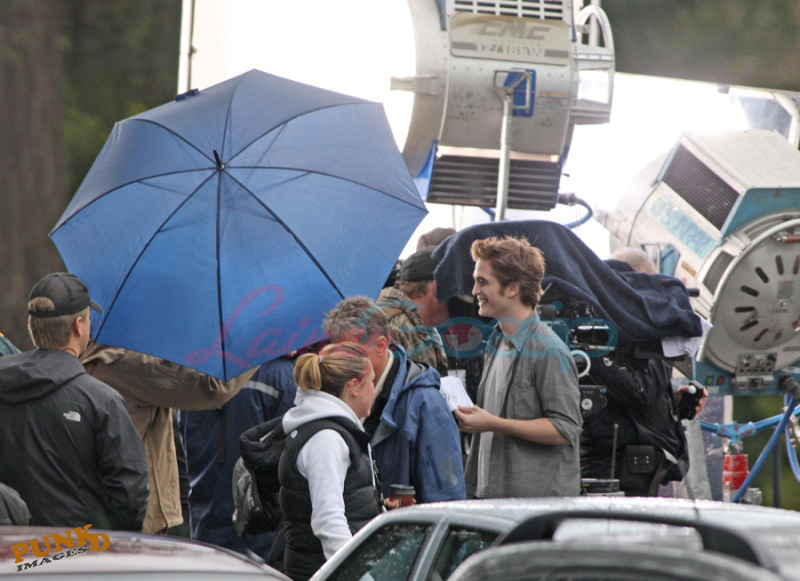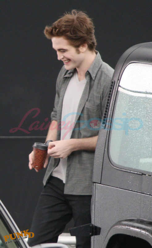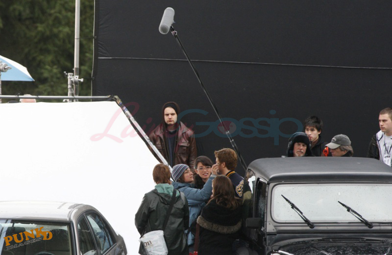 Exclusive photos: Robert Pattinson and Kristen Stewart shooting scenes for New Moon together today along with the high school crew and a glimpse of Tayor Lautner too. Looks like they’re doing a much, much better job with the makeup this time around especially Pattinson’s Edward. Very pretty. He is a beautiful, beautiful boy. The hair. The hair is working.