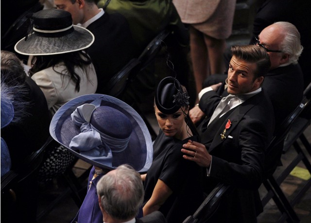 In fairness to her though, she did look pretty happy. She did smile several times. And David, he was positively overjoyed. And why not? Better that attitude, at having been invited to the Wedding of the Century, than playing off like they were too cool for it. And amazingly she only seemed slightly annoyed at being pregnant for the occasion. Now and again the camera would find her and a cloud would cross her face, as if she’d just remembered that she couldn’t boast of being skinnier than Princess Kate herself.