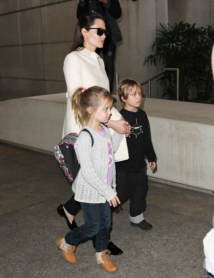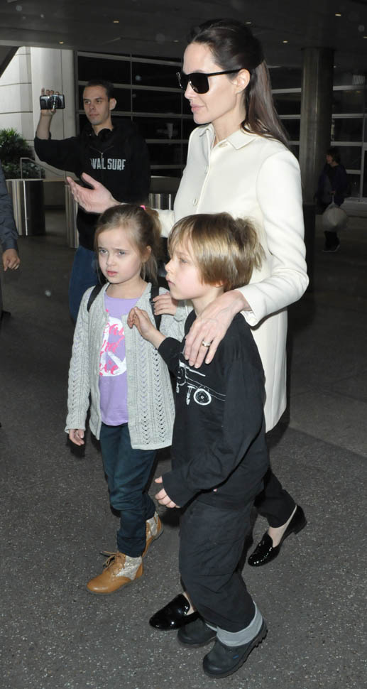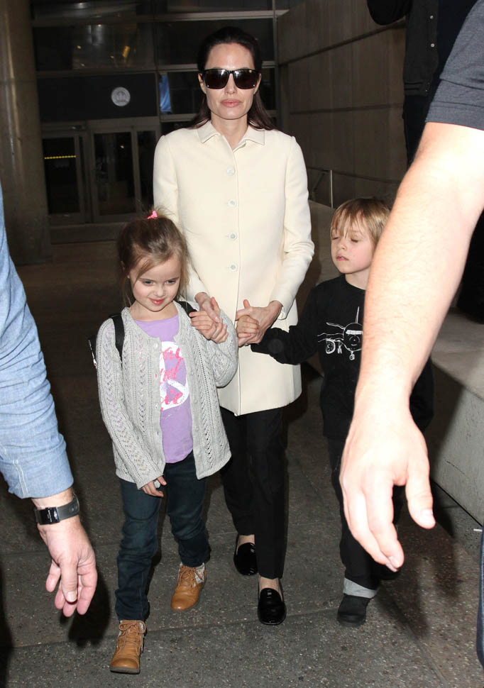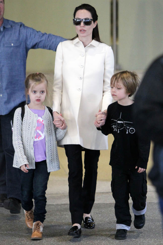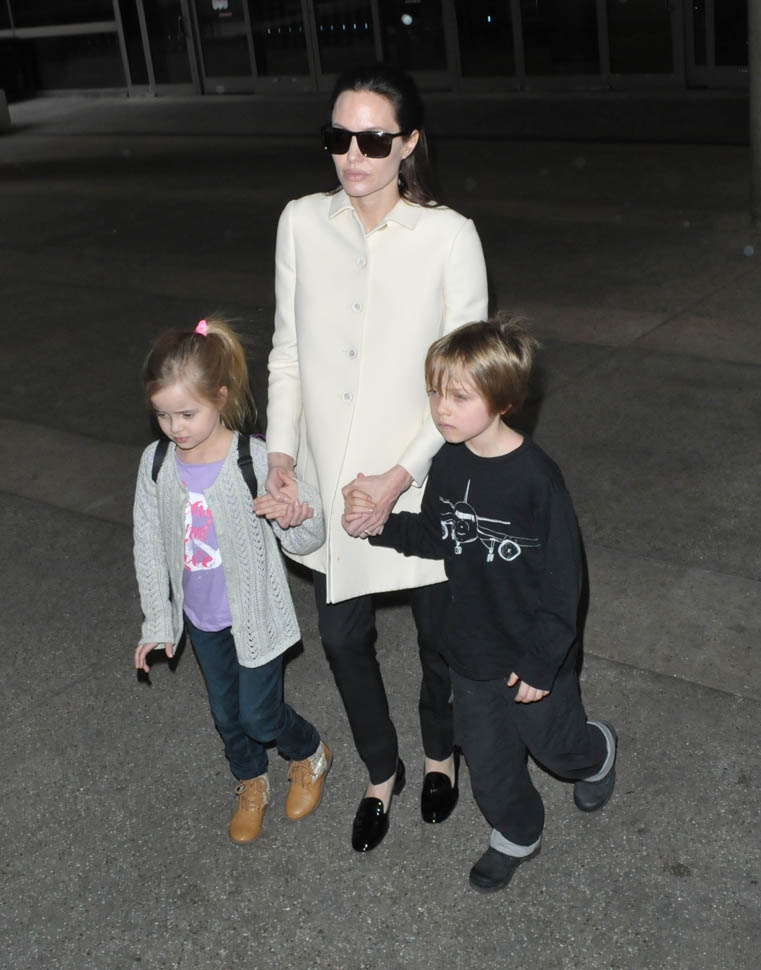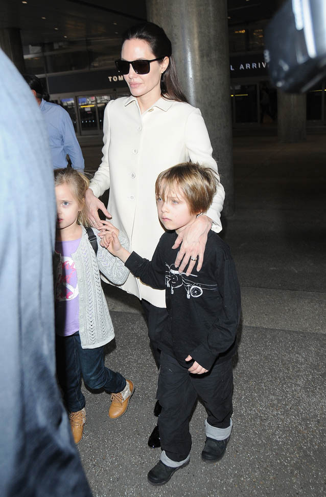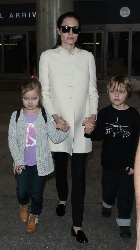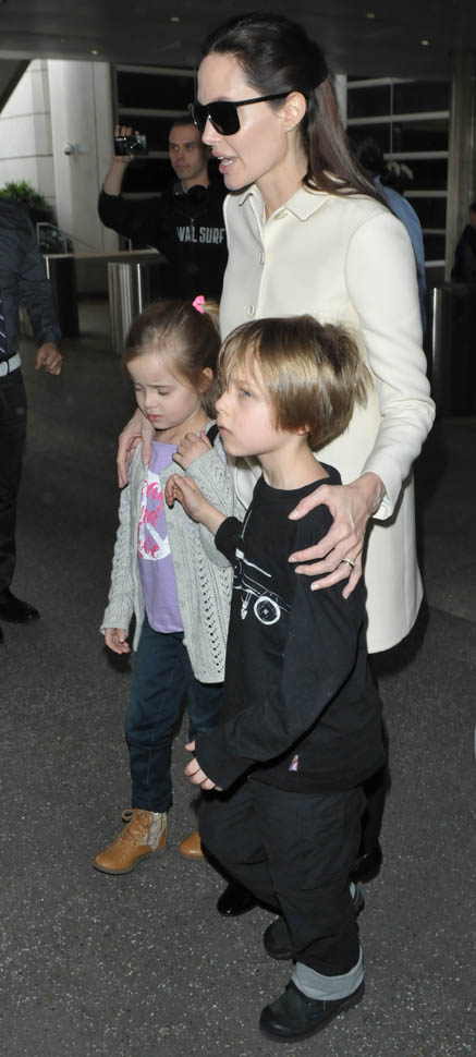 Here’s Angie with Vivs and Knox returning to LA from London yesterday. Oh. So will you be around for Oscar week?