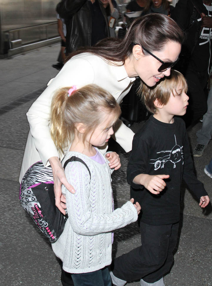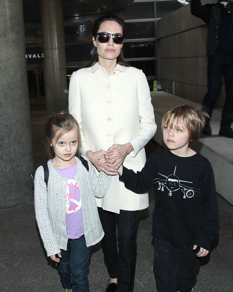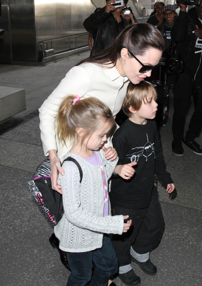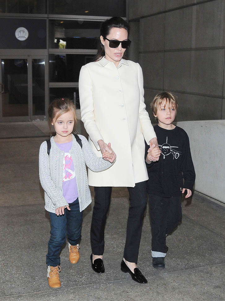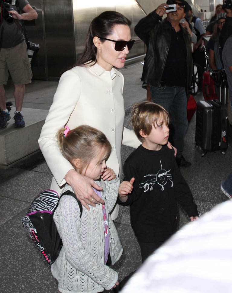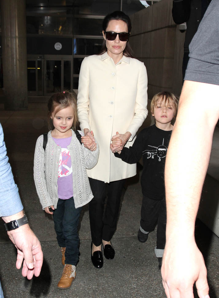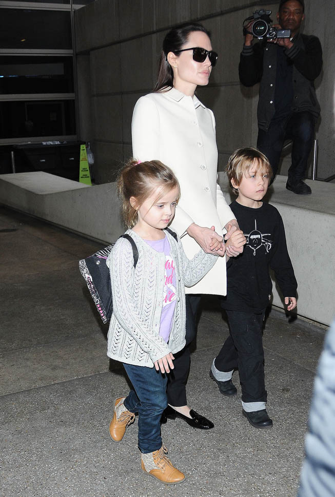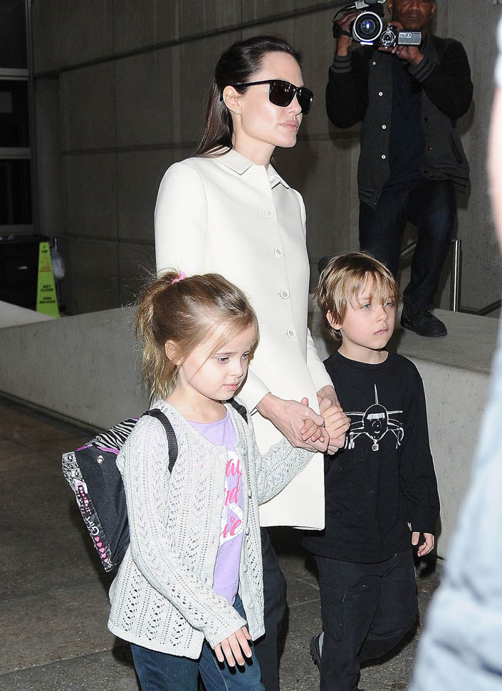 Here’s Angie with Vivs and Knox returning to LA from London yesterday. Oh. So will you be around for Oscar week?