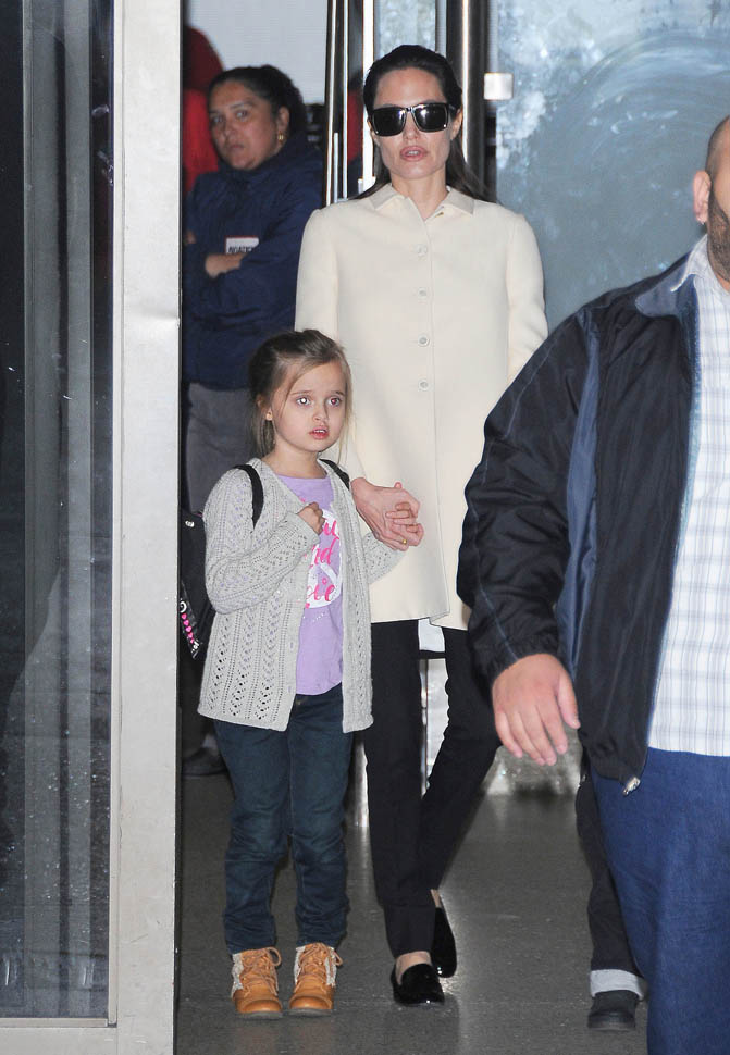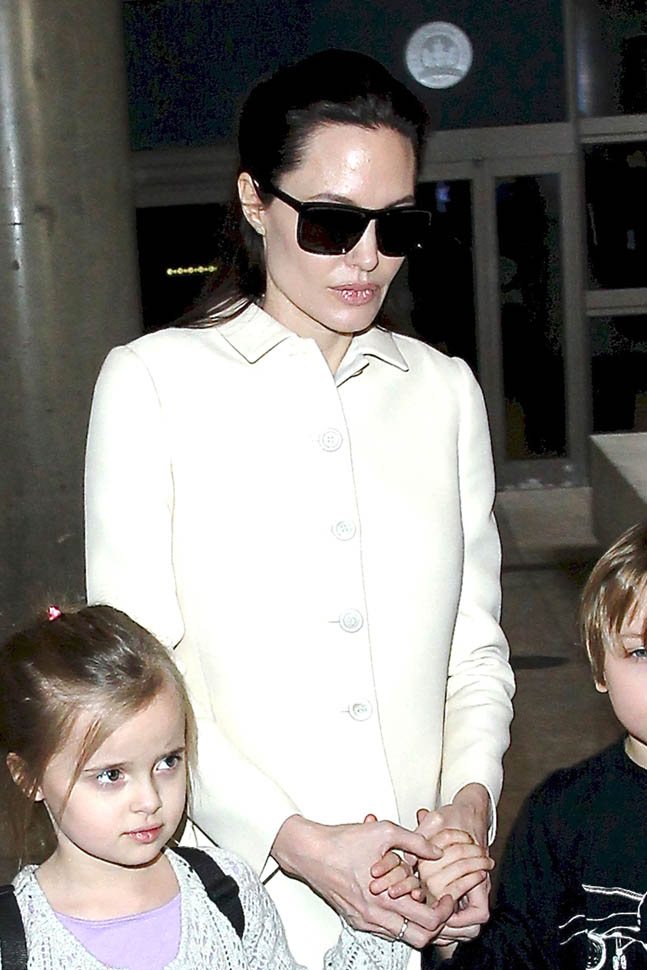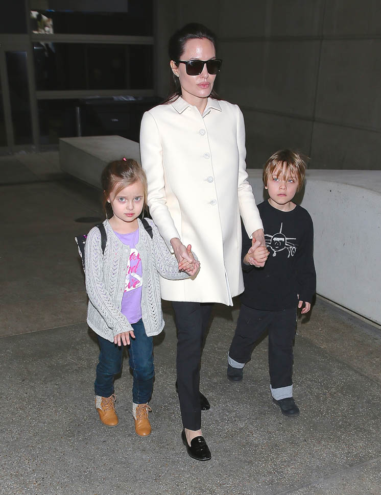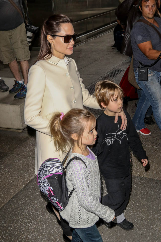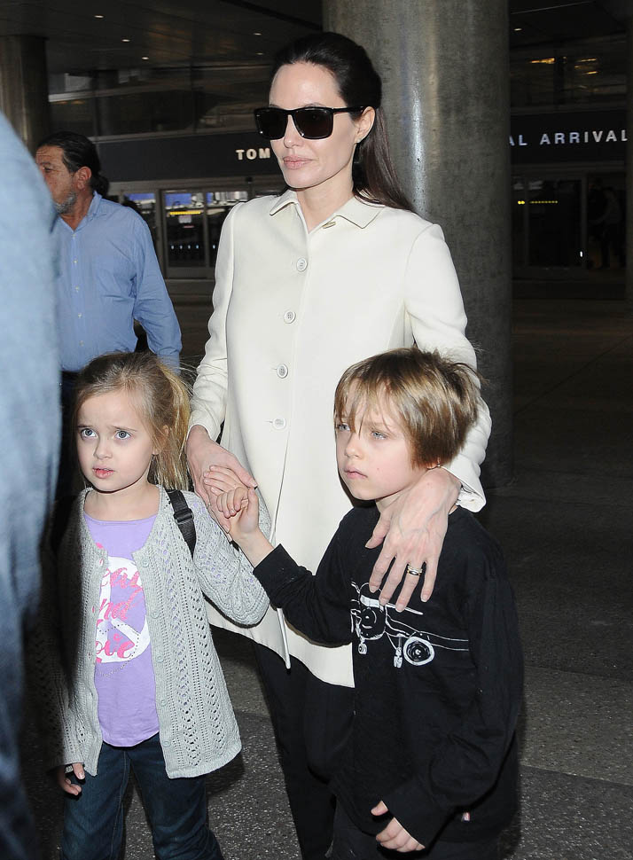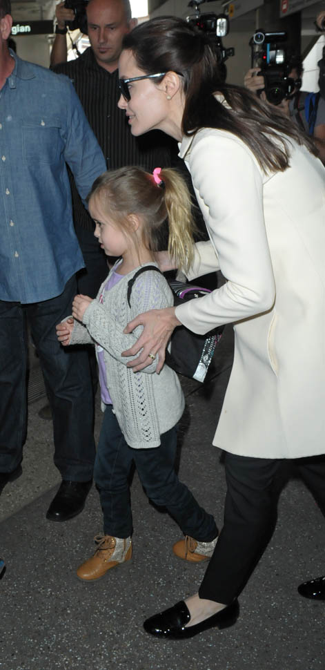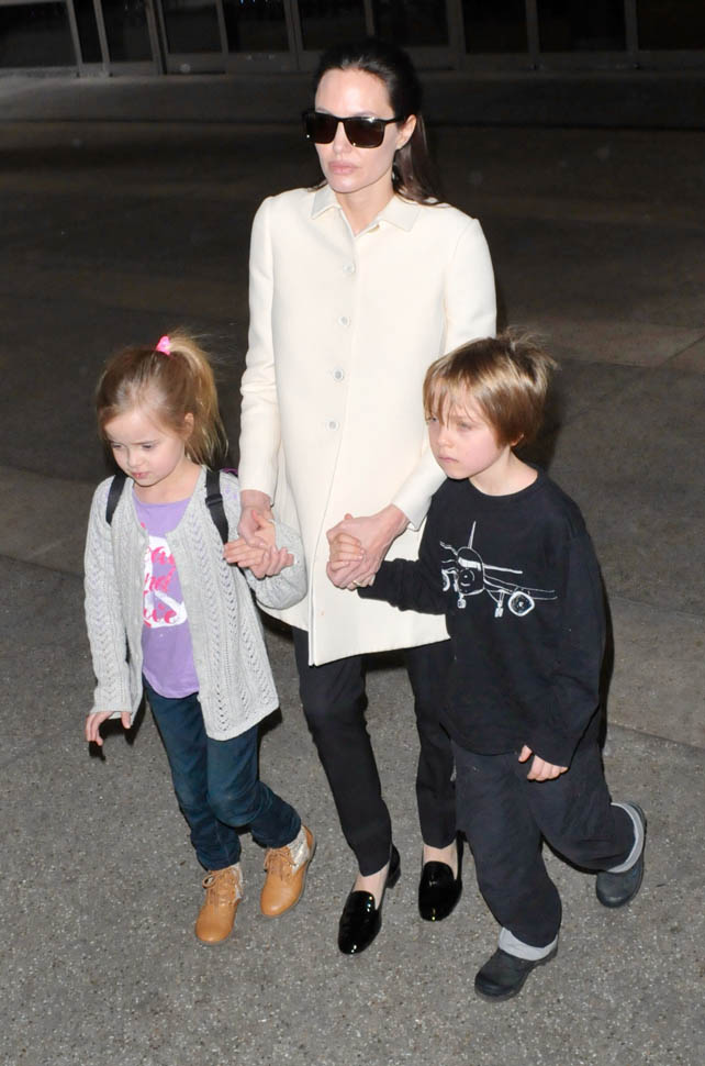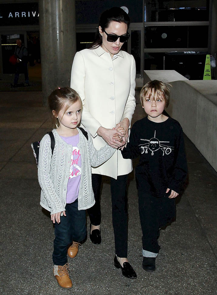 Here’s Angie with Vivs and Knox returning to LA from London yesterday. Oh. So will you be around for Oscar week?