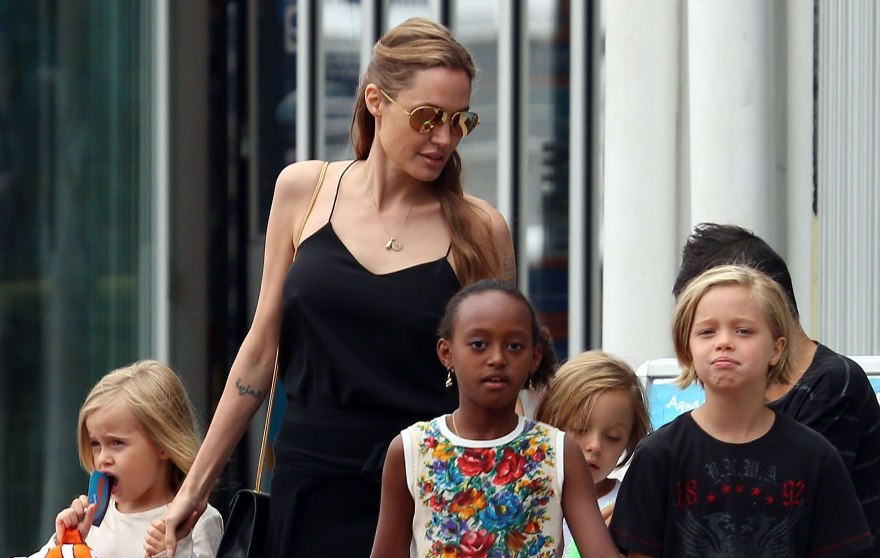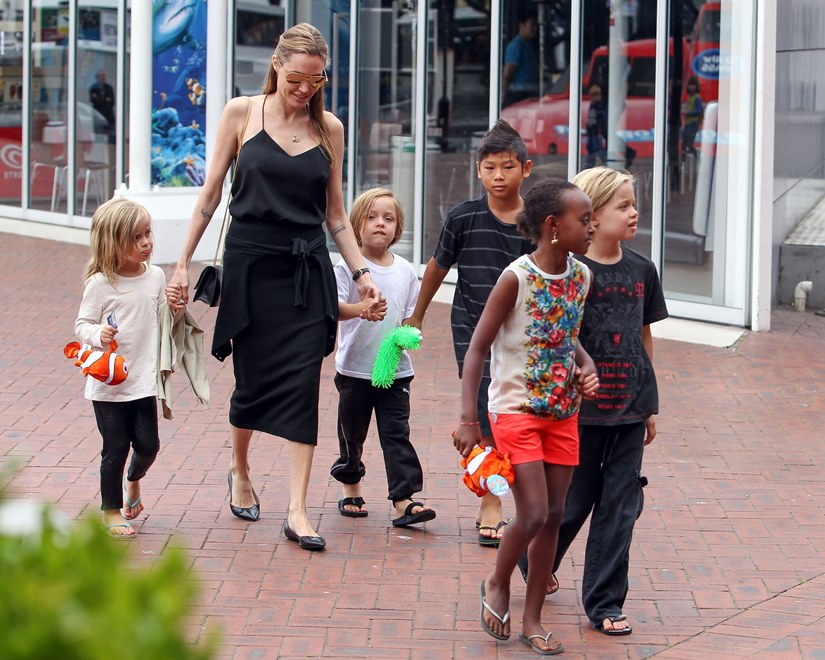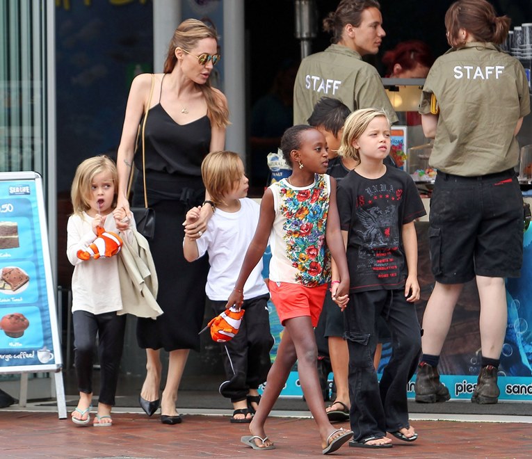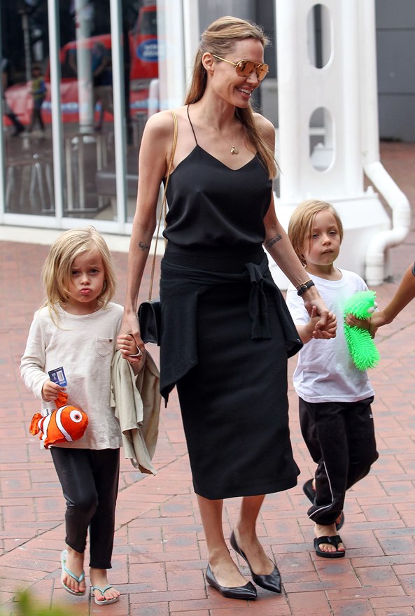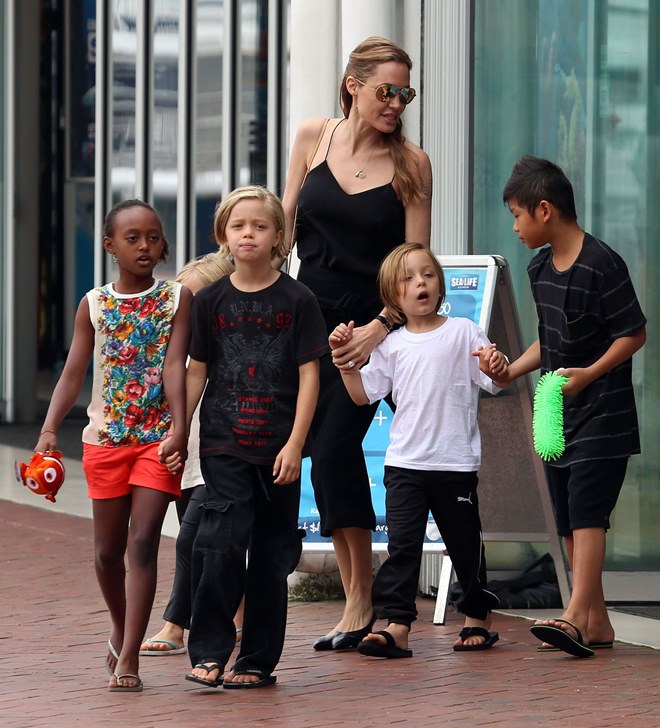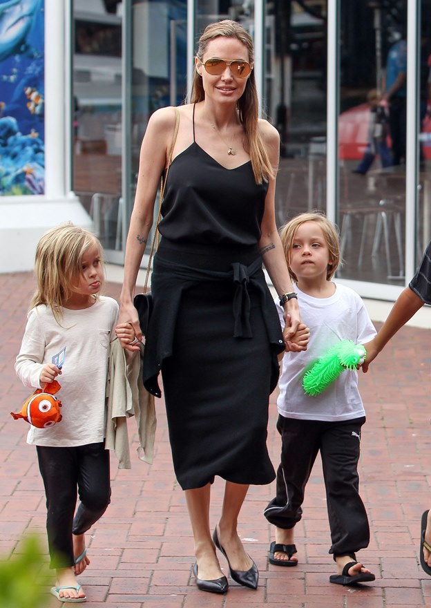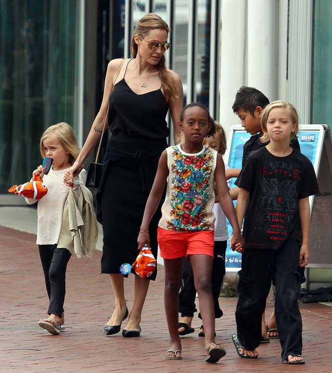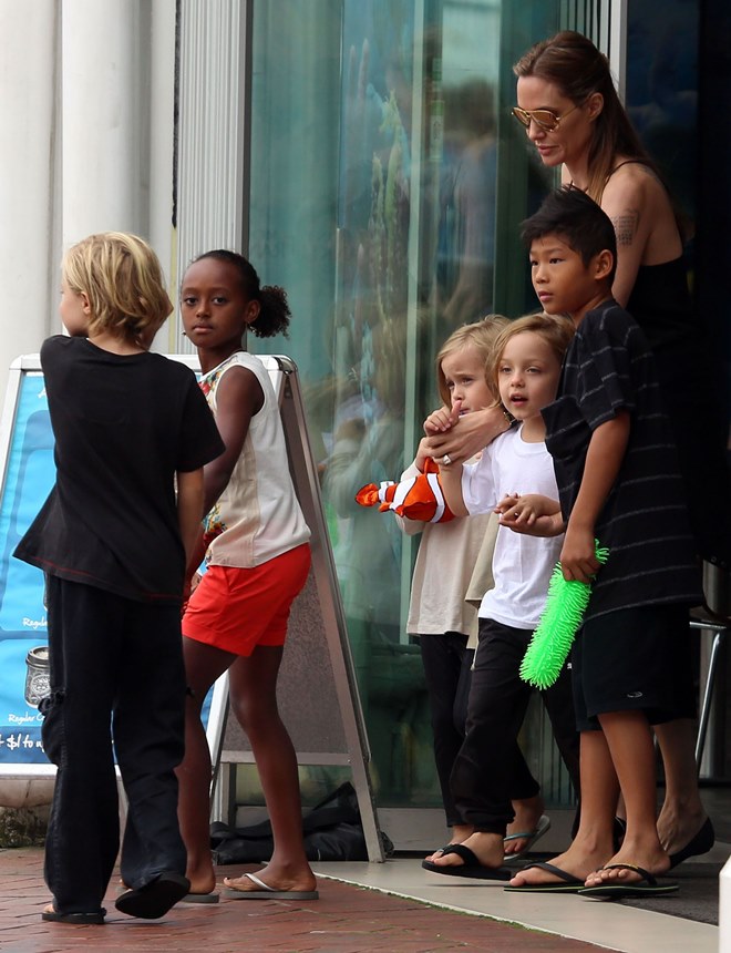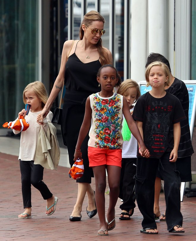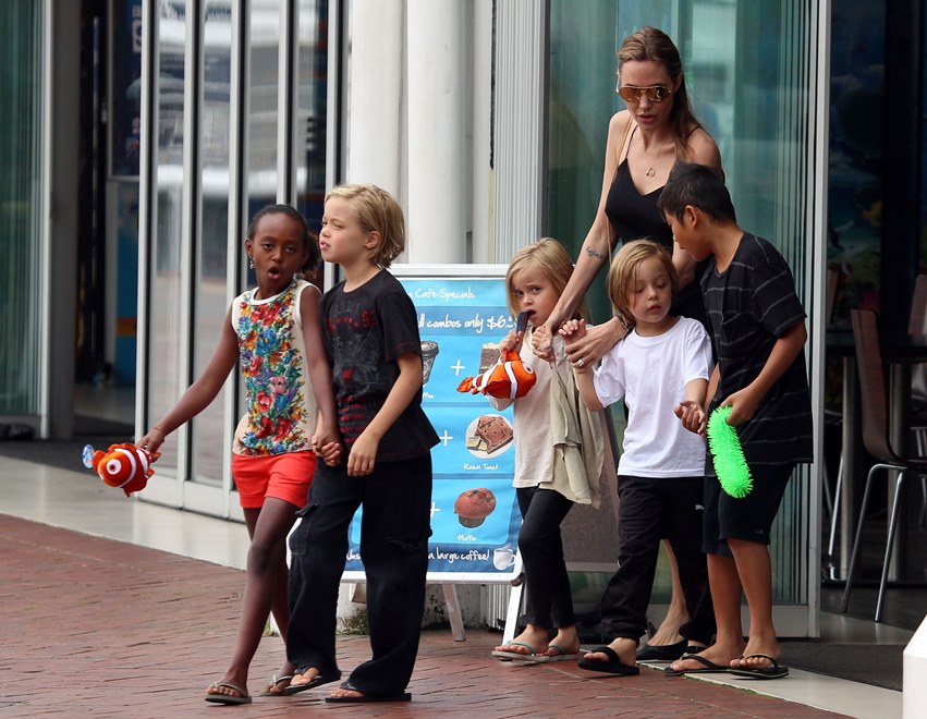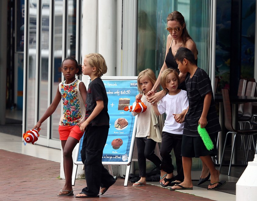 While Brad Pitt was in Toronto supporting 12 Years A Slave this weekend, Angelina Jolie had all the kids with her in Sydney while working on her new film. She took 5 of them to the aquarium. Maddox was missing, evidently needing a break from his younger siblings and their noise. Can you blame him? But I wish I could wear a pair of cargo pants as well as the young Chosen One Shiloh. Little Knox’s shoes appear to be on the proper feet this time. Flip-flops are so much easier to figure out, it’s true.