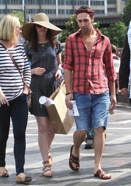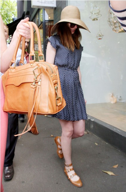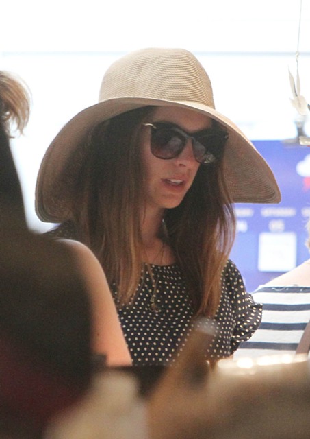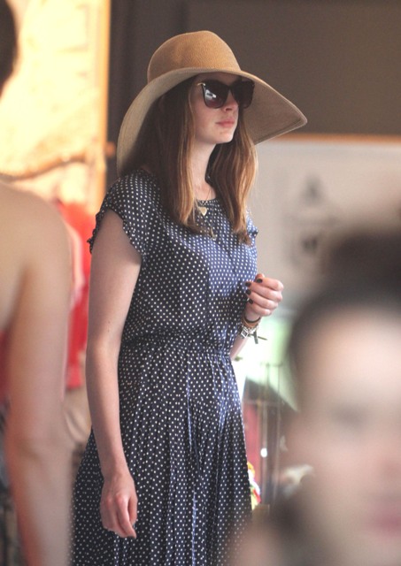 Also...Annie took advantage of her down time to do a little shopping. The floppy hat and the dress are cute, but check out these shoes. They’re a good idea, I agree, yes. But they make her feet look HUGE.