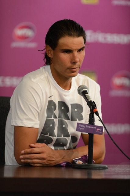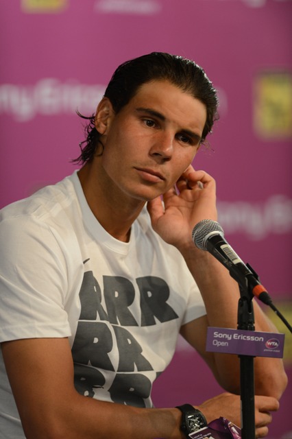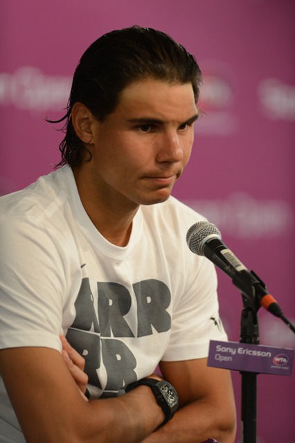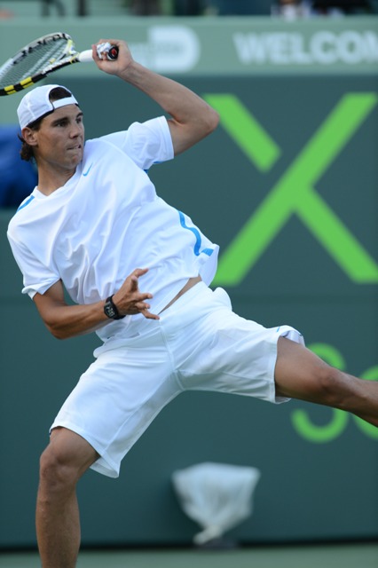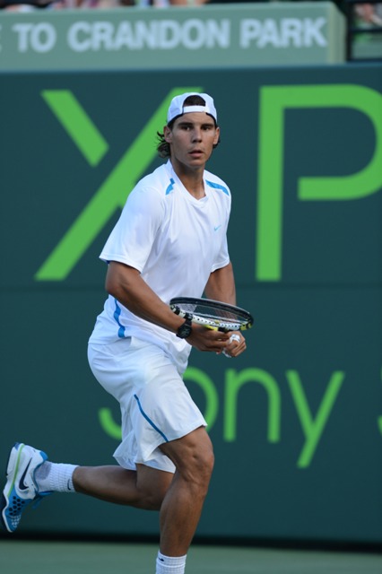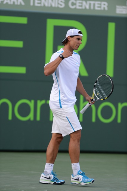 Anyway, Cat loves Rafa. Which means she’ll be watching him this weekend at the Sony Ericsson Open. Here he is during his doubles match; tonight he’s playing Santiago Giraldo on the singles side. Last week’s loss to Federer at BNP Paribas was pretty underwhelming as far as meetings between those two go. Roland Garros starts in 8 weeks. Maybe a lull right now isn’t a bad idea before building towards Paris.