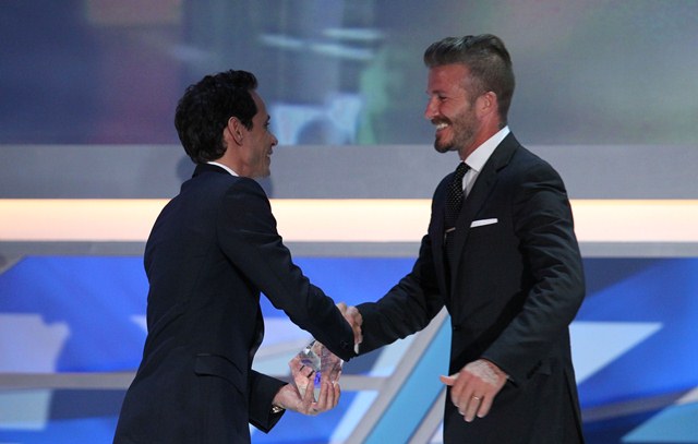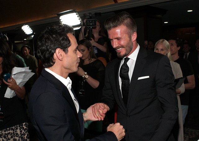 David Beckham was honoured last night in LA at the 27th Anniversary Sports Spectacular. His friend Marc Anthony presented his award. The Beckhams were once tight with both Marc and JLo. It’s been a while since Victoria and JLo have been seen together publicly. Marc kept the Beckhams in the divorce then? It makes sense. What the f-ck would Posh do with Casper Smart? Oh wait. I might actually like to see that double date just for the laughs.