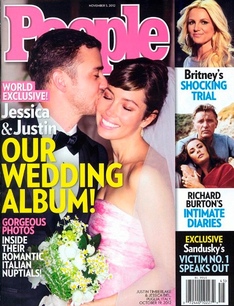 PEOPLE released an alternate cover for his big pink wedding. At least this time his wife was allowed to stand up in the photo. Britney, however, is still prominently positioned in the corner. Obviously JT doesn’t like this one as much. You can only see half his face, his eyes are closed, and his nose looks smushed from the kissing.