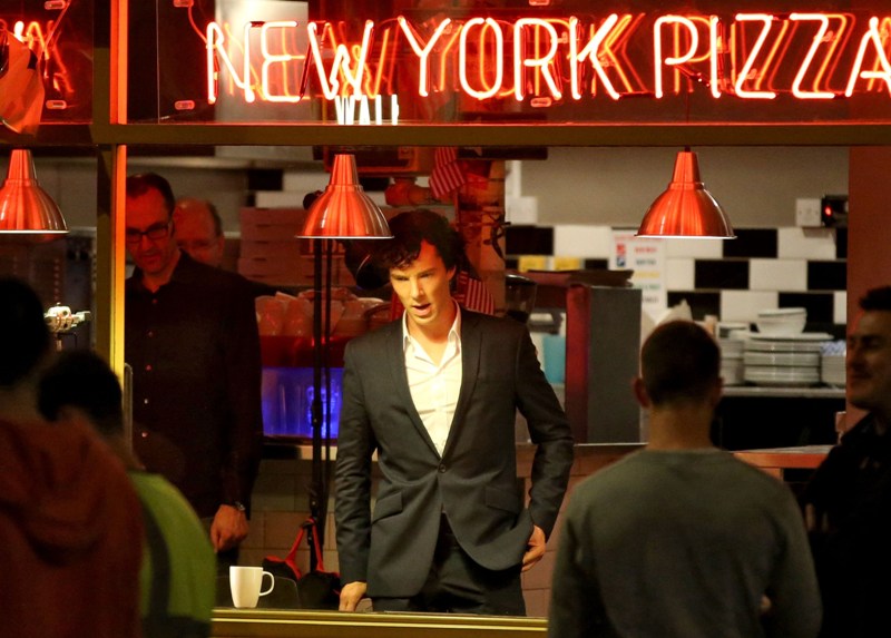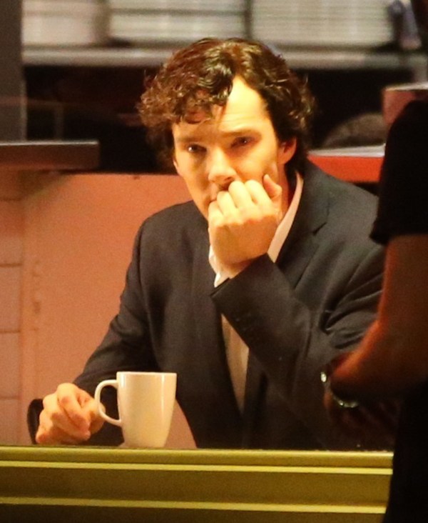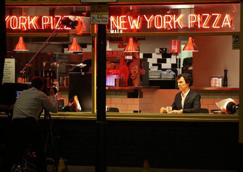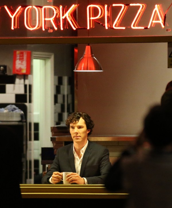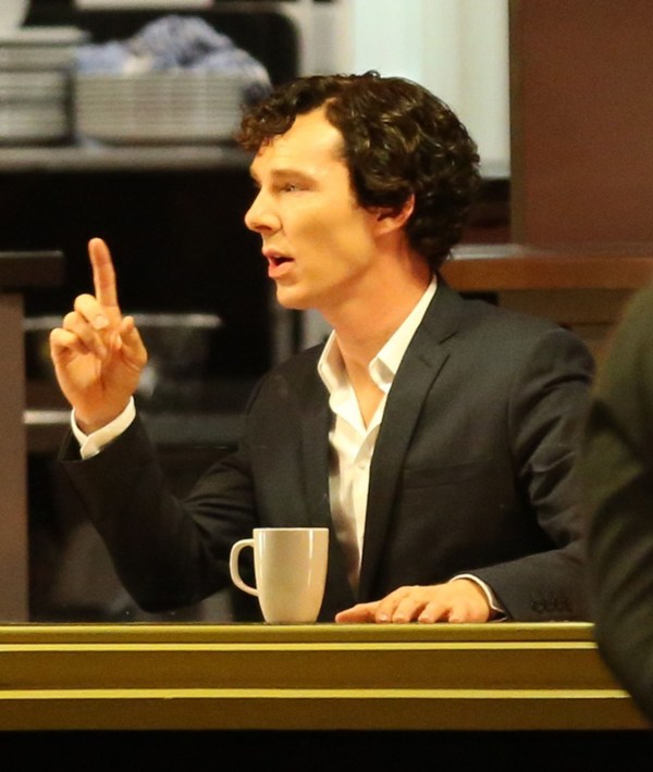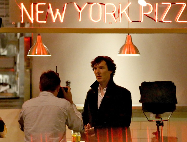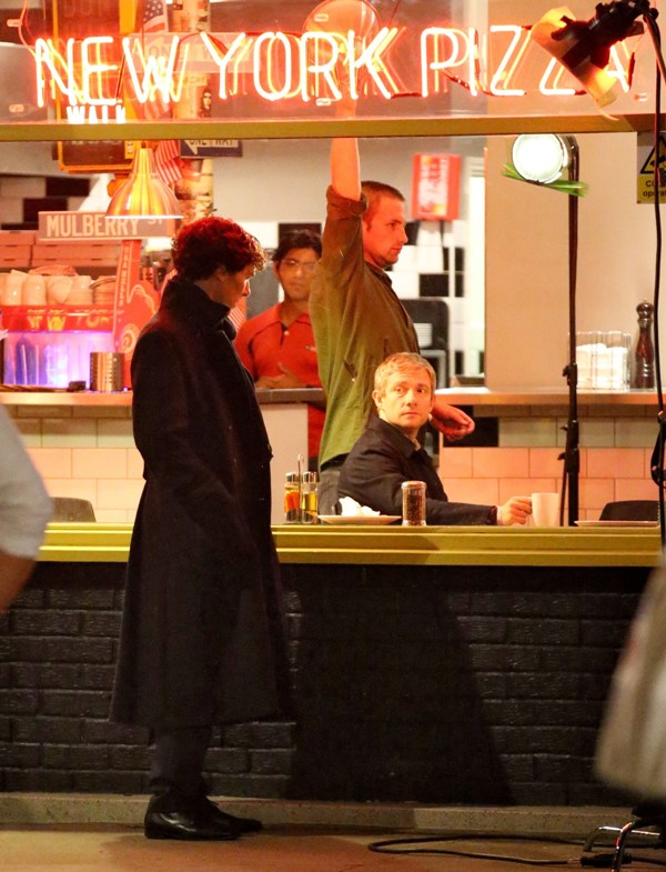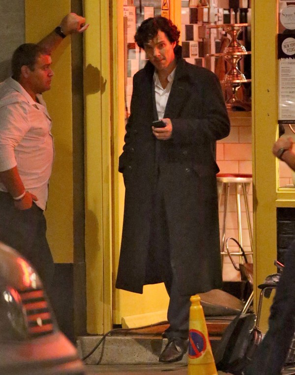 Attached – Cumberbatch shooting Sherlock in London today.