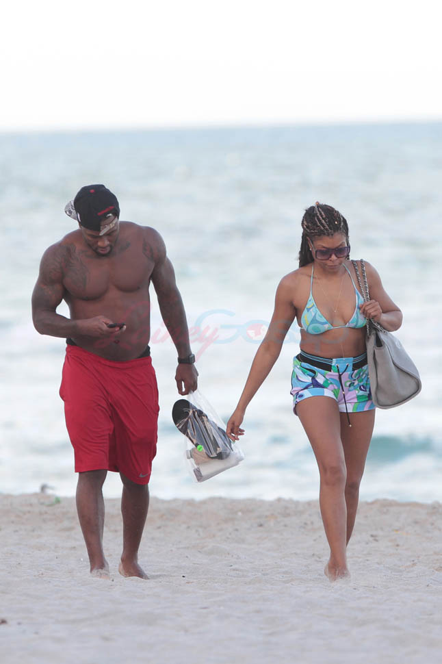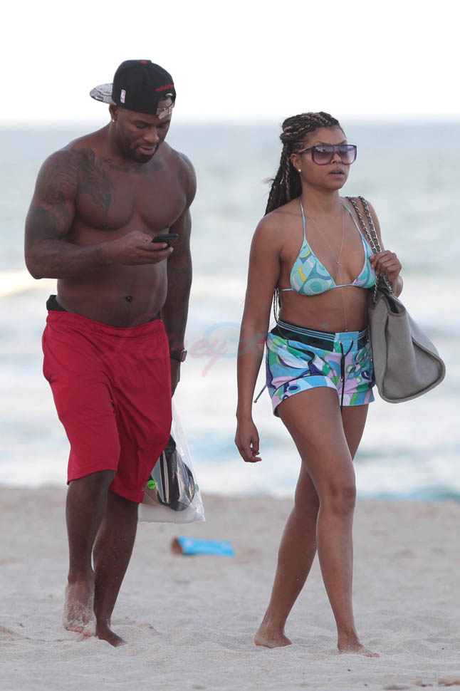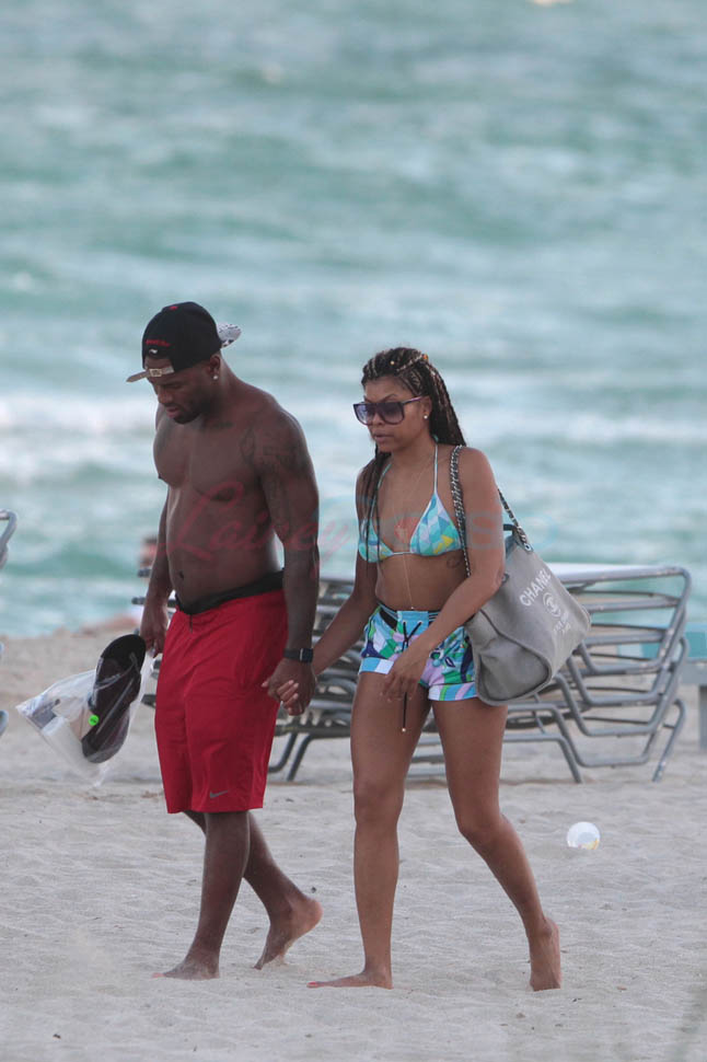 Here’s Taraji, celebrating her big year, in Miami on Monday, holding hands with NFL free agent Kelvin Hayden who is 13 years younger than she is. “Take these cookiieess!”
