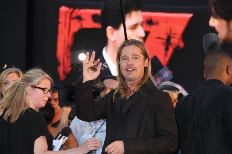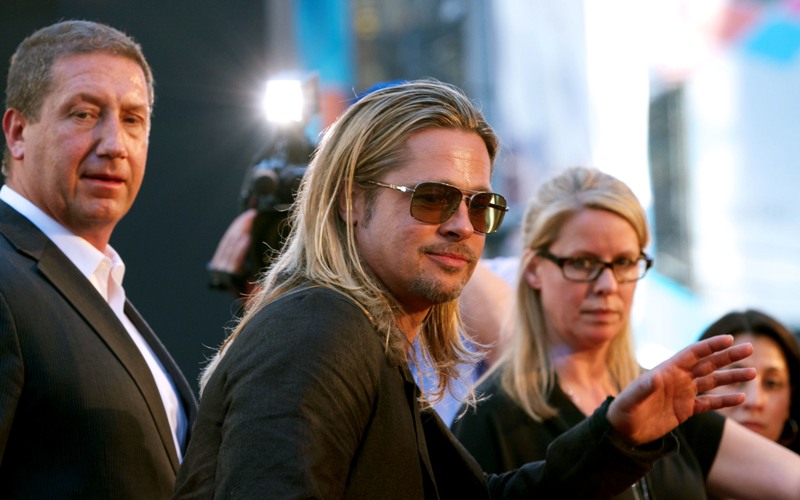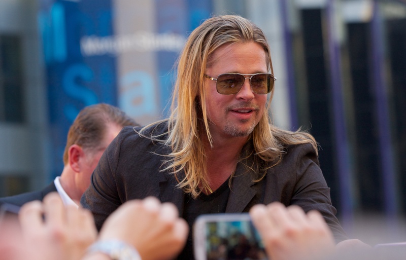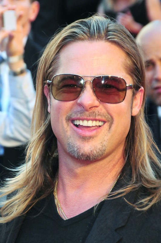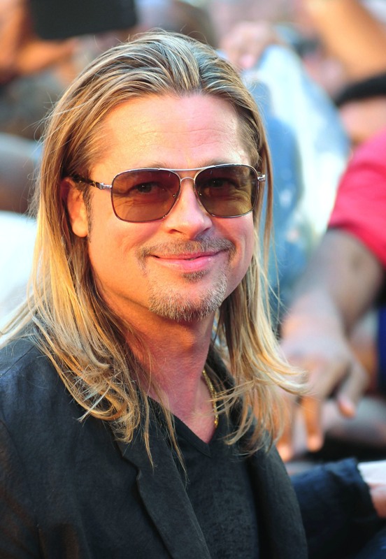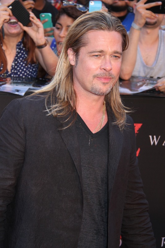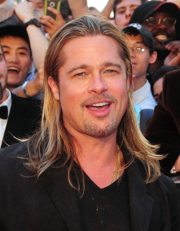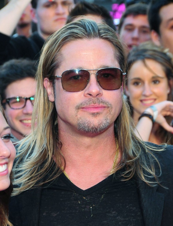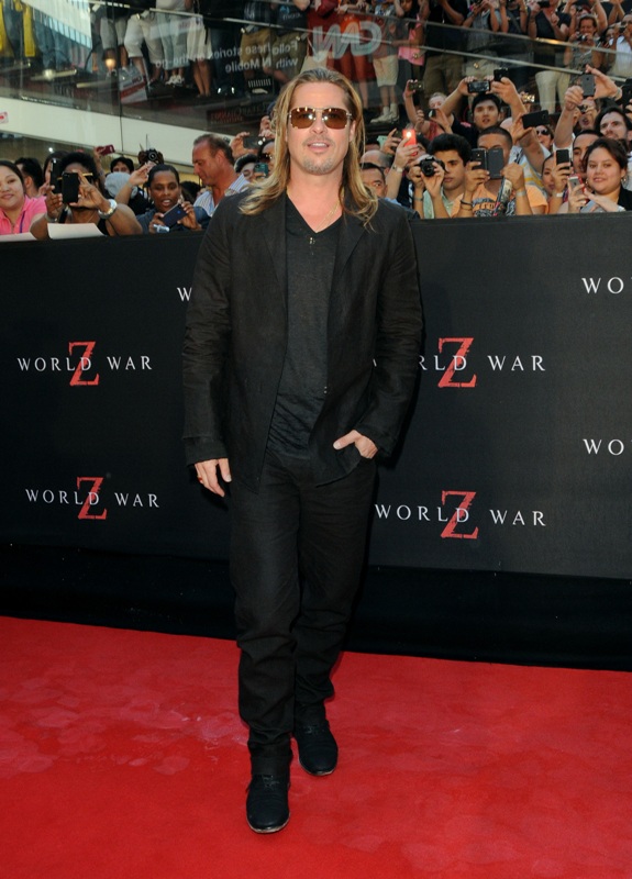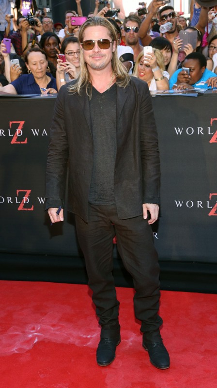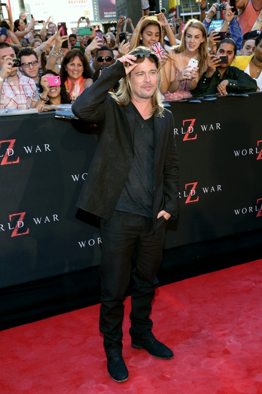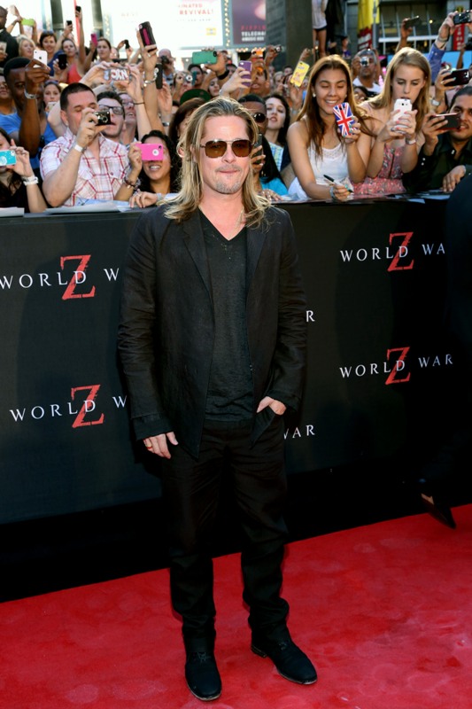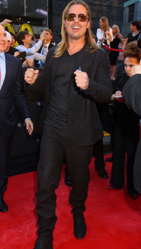 Here’s Brad Pitt last night at the NY premiere of World War Z. We were talking yesterday about Brad Pitt’s Carb Face Hustle and whether or not it’s filler, which is what I think. Because his neck is the same size and his body changes don’t correspond to his face expansion. And no matter how much contouring his makeup artist is trying, the extra anti-aging padding is still there. When you combine that with the long hair, well, the effect is...