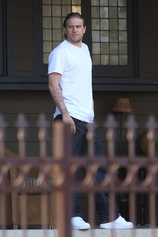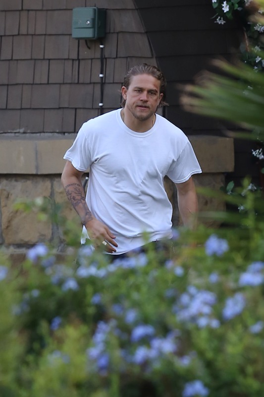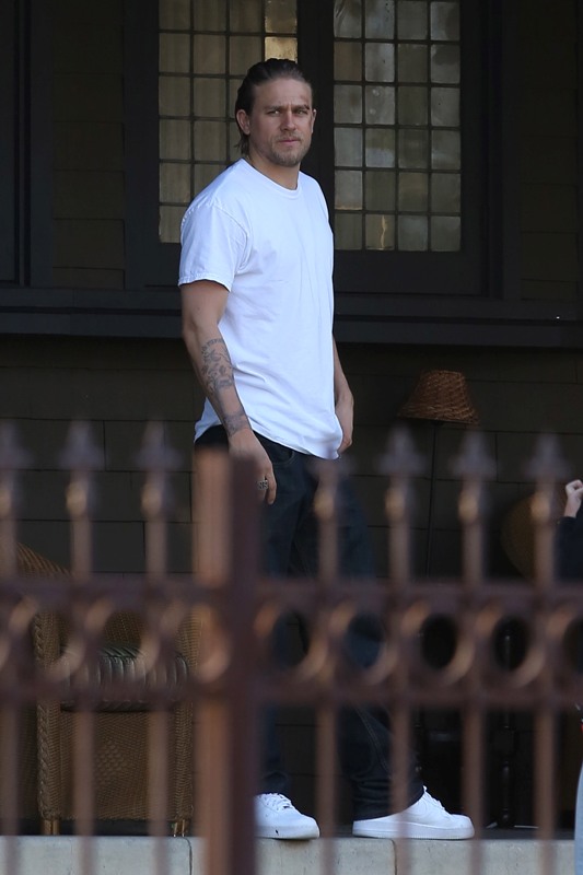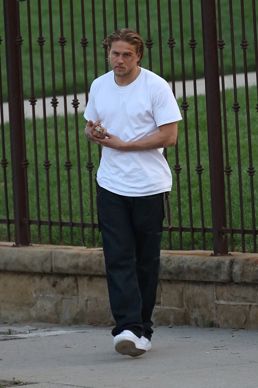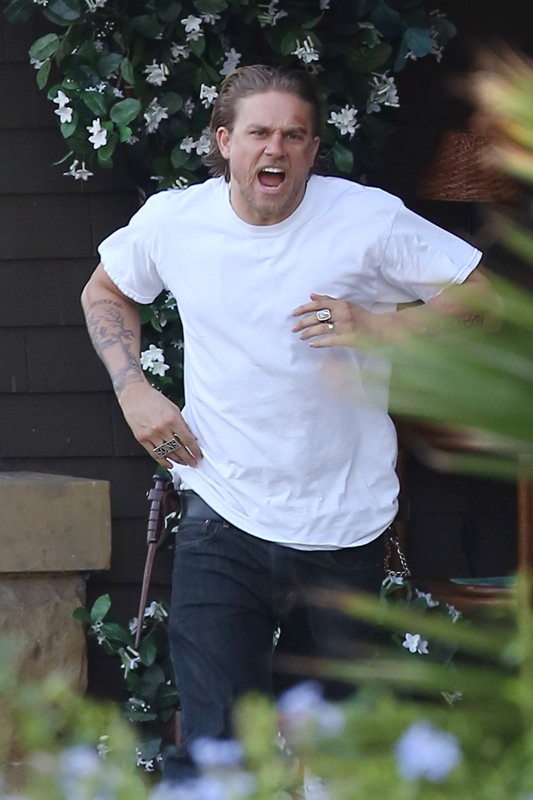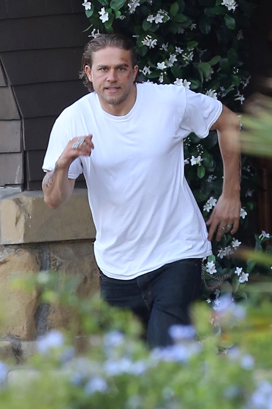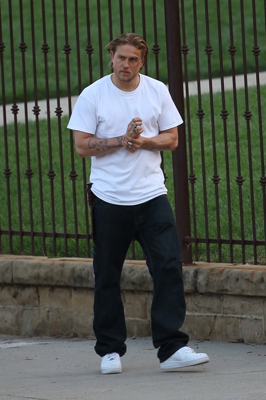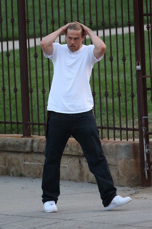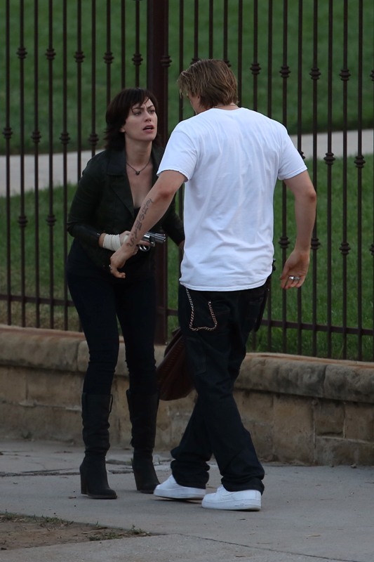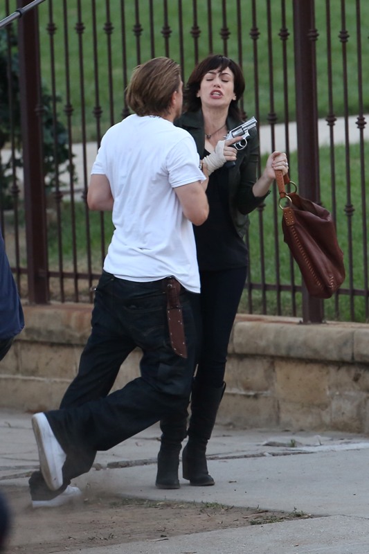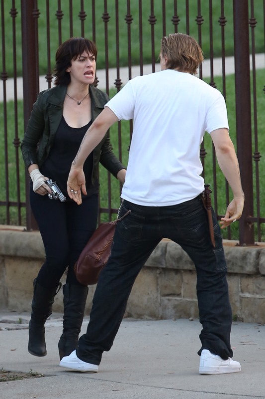 Anyway, here are Maggie Siff and Charlie Hunnam shooting a scene from an upcoming episode. Tara appears to be waving a gun around and Jax is trying to stop her? If I were her I’d shoot HIM. He’s a f-cking idiot.
