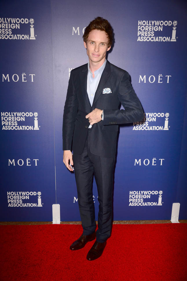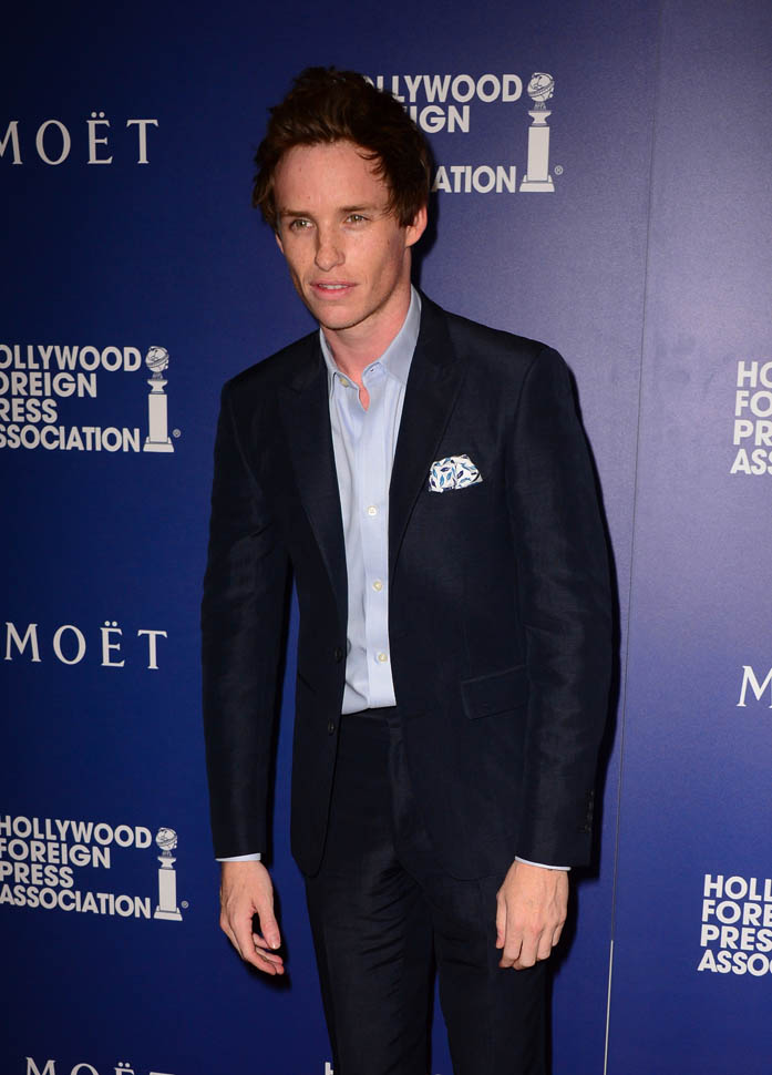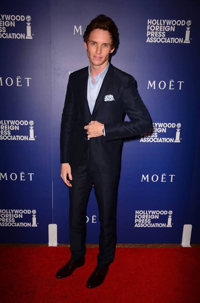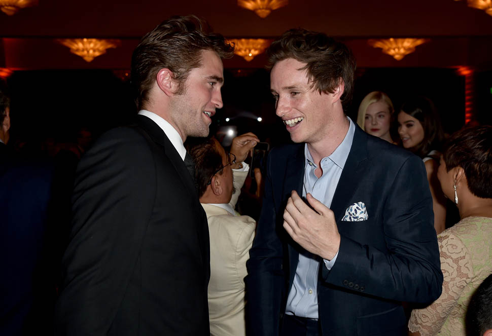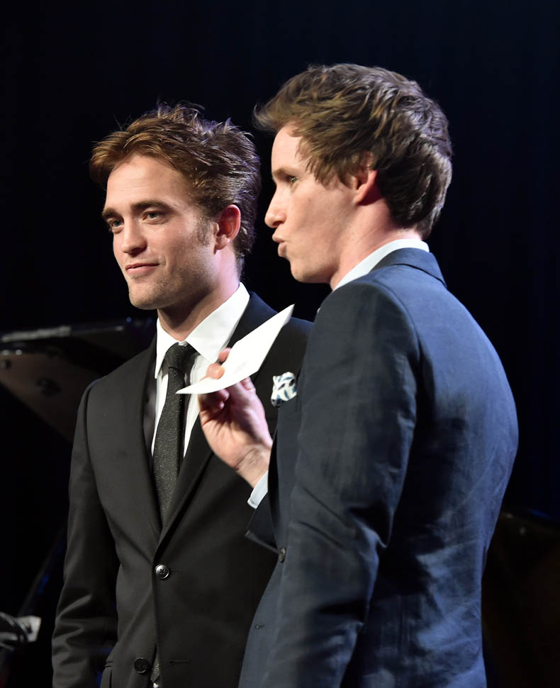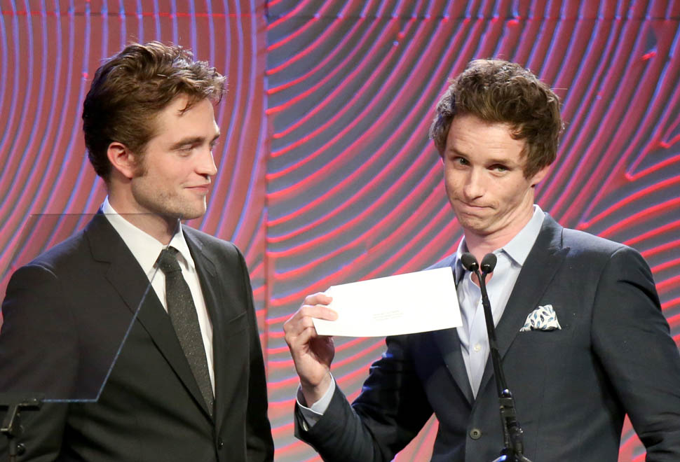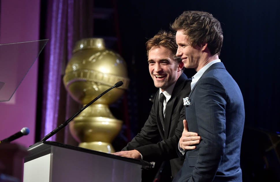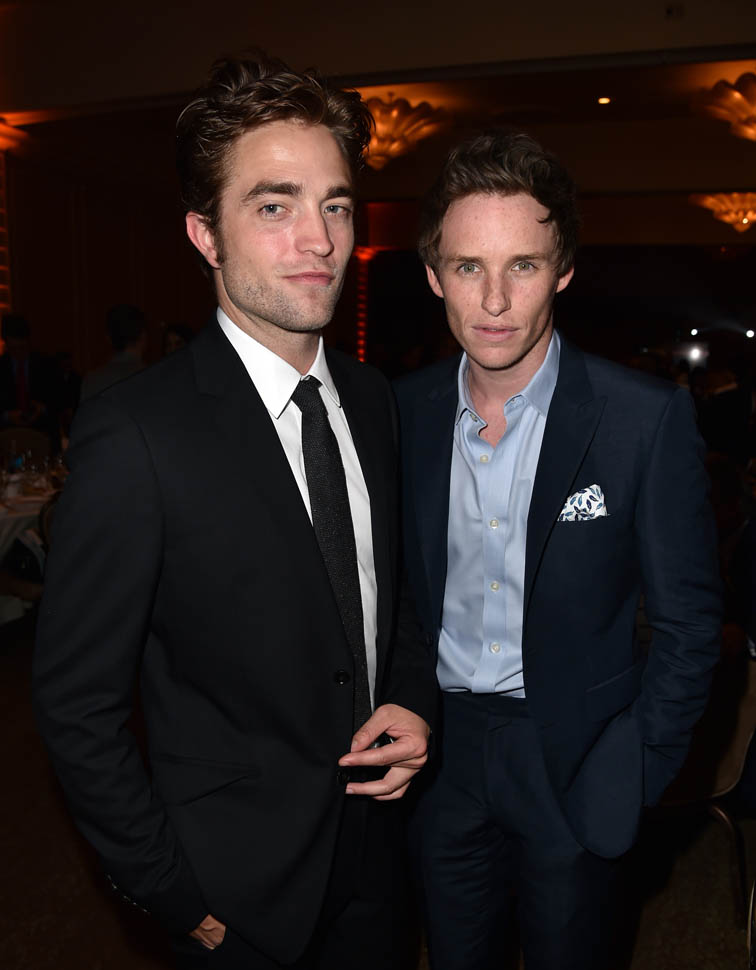 So here are Eddie Redmayne and Robert Pattinson presenting together last night at the HFPA’s grants banquet. Redmayne is hoping for Best Actor consideration for his work in The Theory Of Everything, playing Stephen Hawking. His performance looks amazing. I posted the trailer the other day – click here for a refresher. Pattinson delivered solid work in The Rover and has been very vocal about wanting to be taken seriously as a proper thespian after all that business with Twilight.