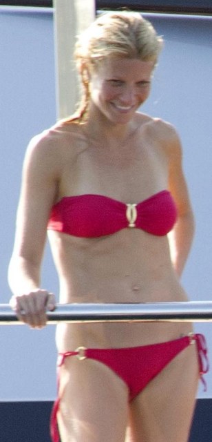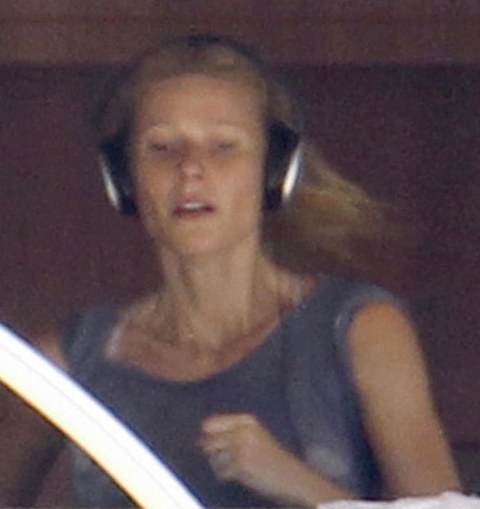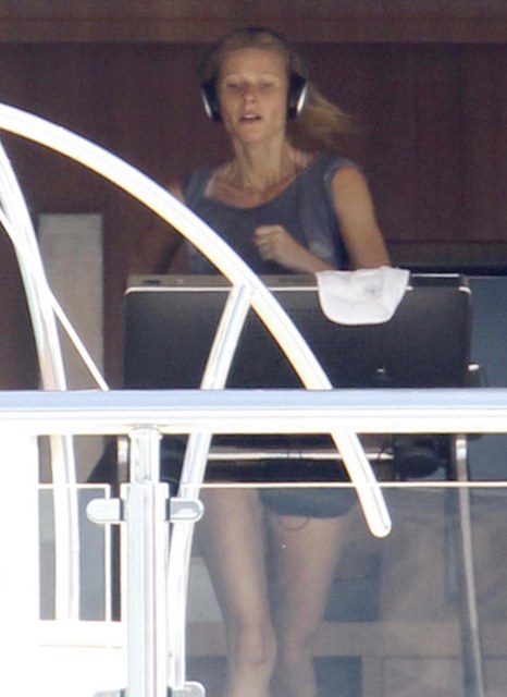 The body, as you can see, is showcased in several bikinis, very very fit. And, I think, it looks healthy. She looks strong. Needless to say, G doesn't take very many days off. She made use of a treadmill on board. Power walk? Apparently Tracy Anderson doesn't believe in running. She says it adds bulk.