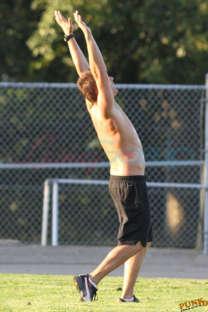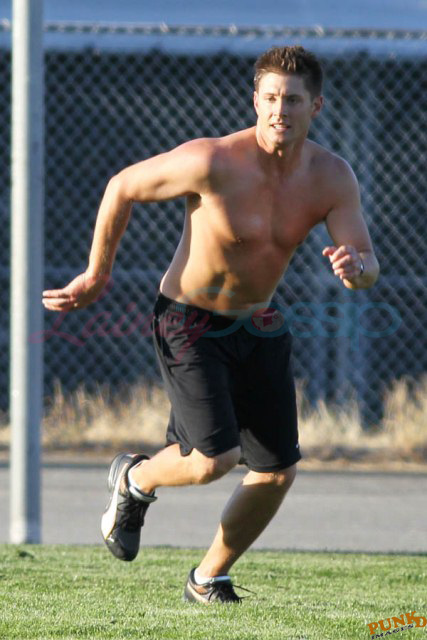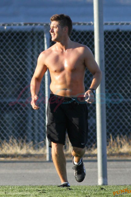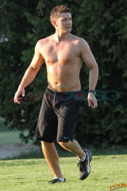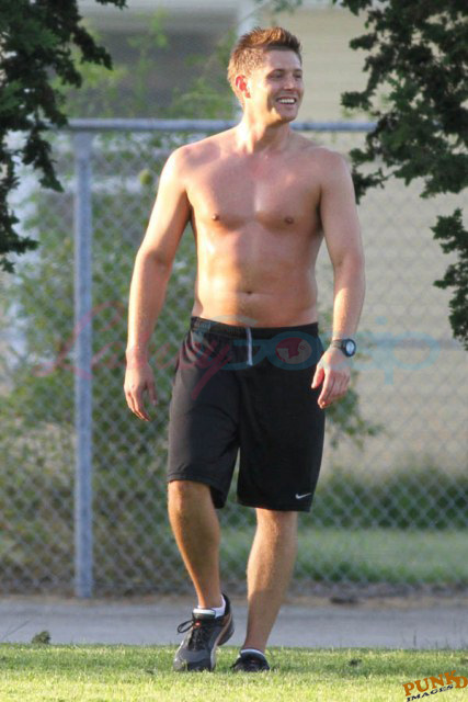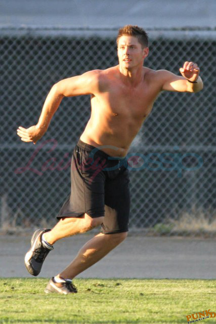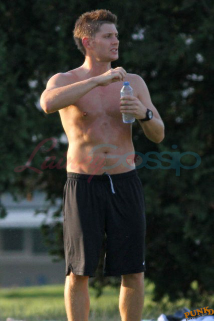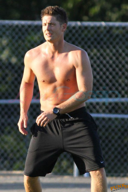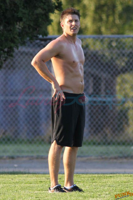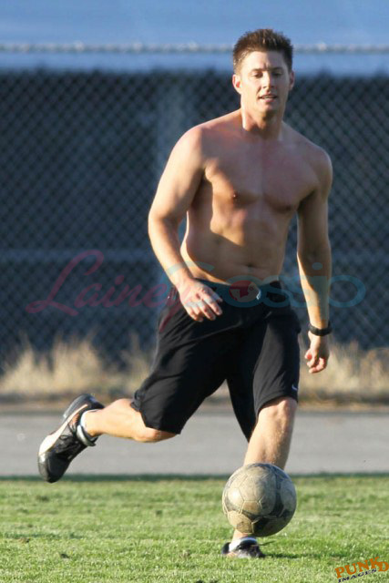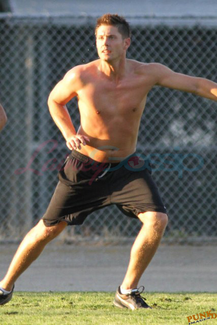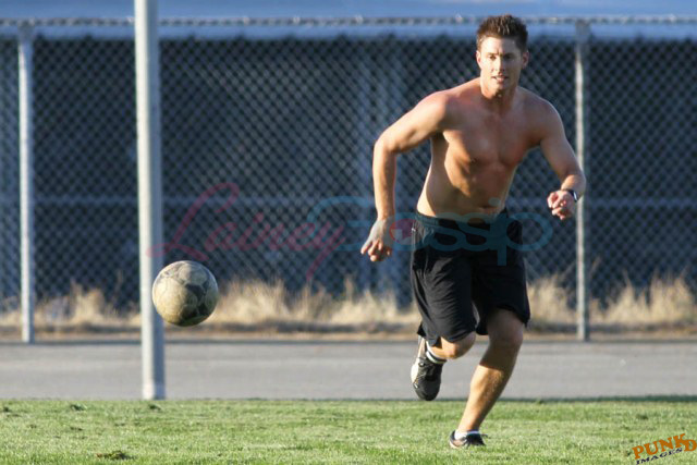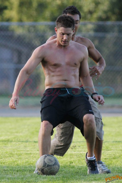 So about those inaccurate weather reports, they originally called for rain on Saturday. Saturday ended up being beautiful, hot enough as you can see here for Supernatural’s Jensen Ackles to go shirtless while playing soccer with the crew.