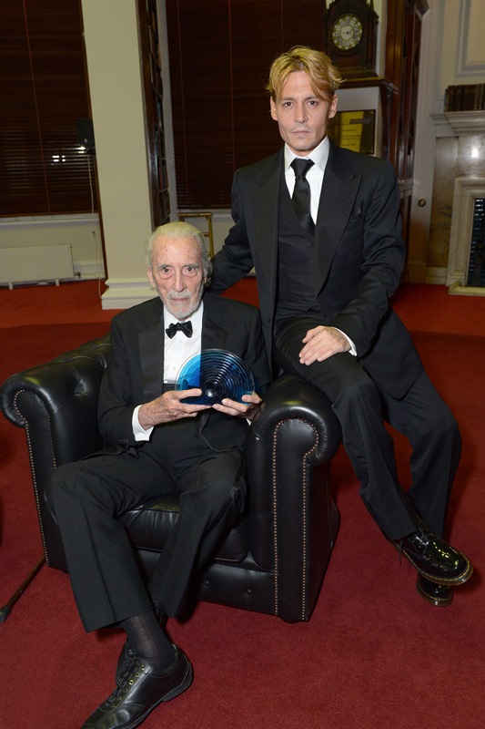 Johnny was in London tonight at the BFI Film Festival to honour Sir Christopher Lee. Now that he’s blonde, I guess he can reduce his scarf, necklace, and ring game. You know, I’ll take the blonde over the scarves, necklaces, and the rings.