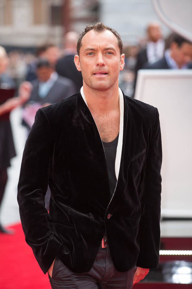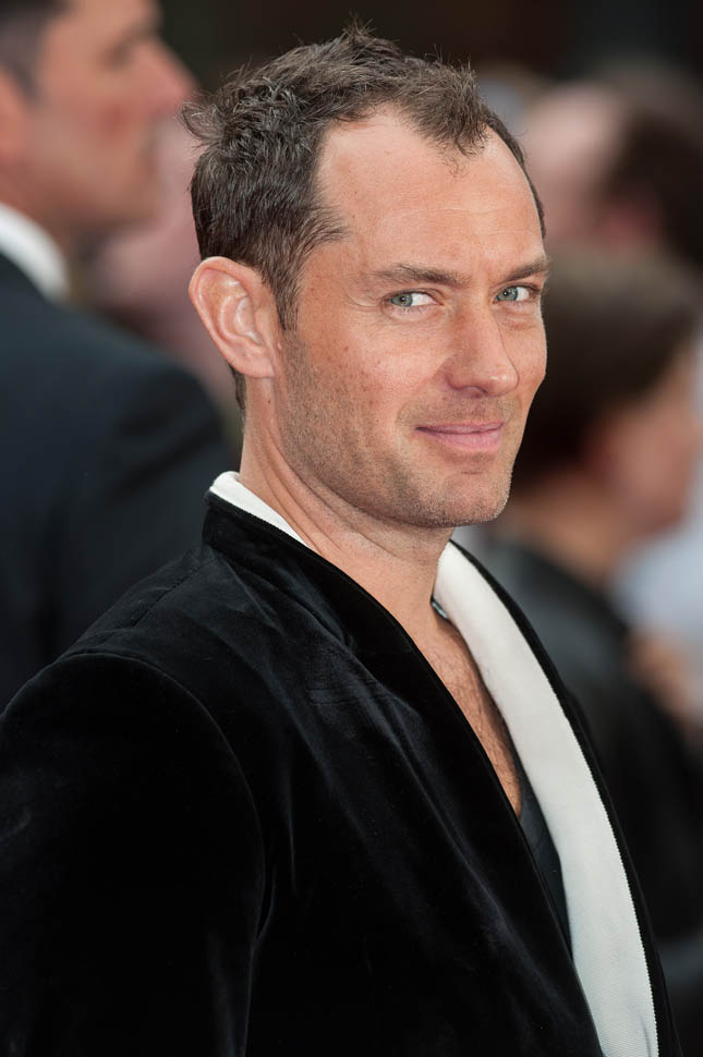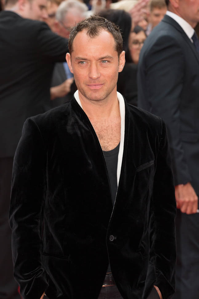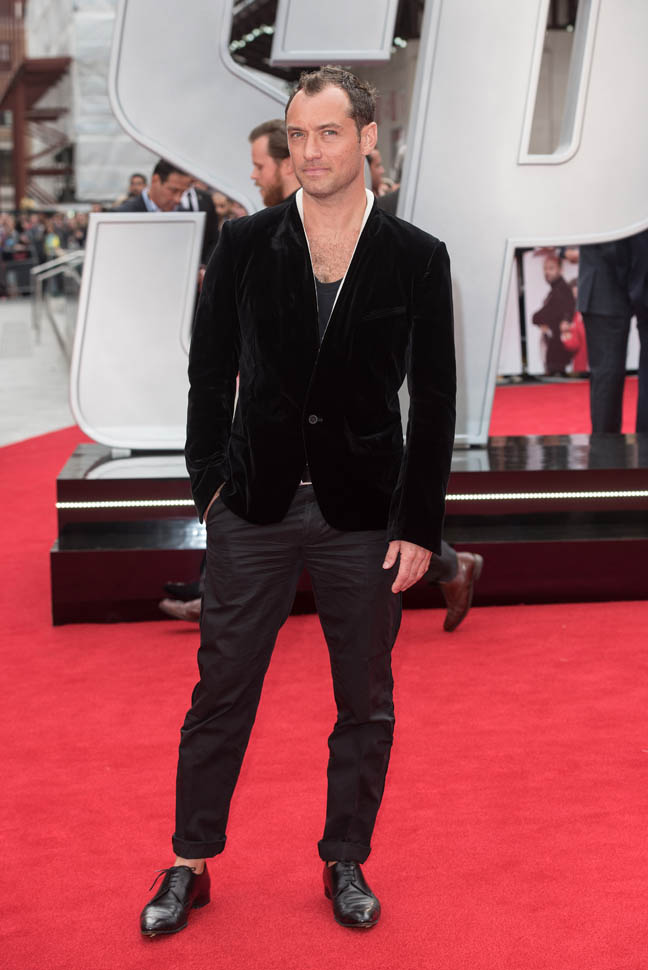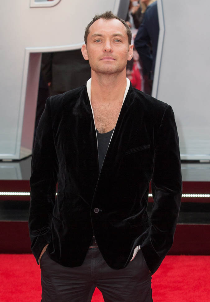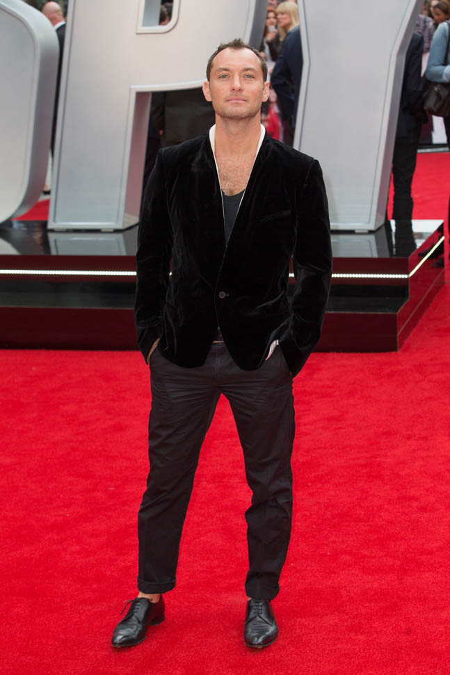 Underneath a white-lined velvet jacket? I don’t understand this. I don’t know that anyone else but Jude thinks this looks good. If I had to guess, I would say he’s compensating. He’s showing you the hair on his chest to make up for what he’s losing on his head. But hey, that doesn’t mean he can’t get work. A white dude in Hollywood can lose his hair and gain weight and it’s never a problem.