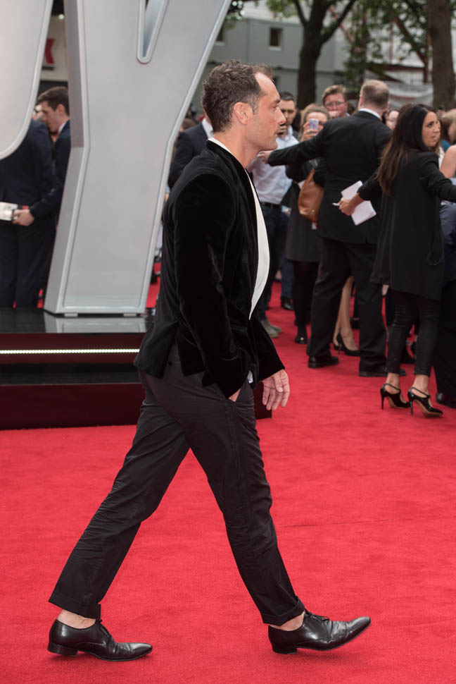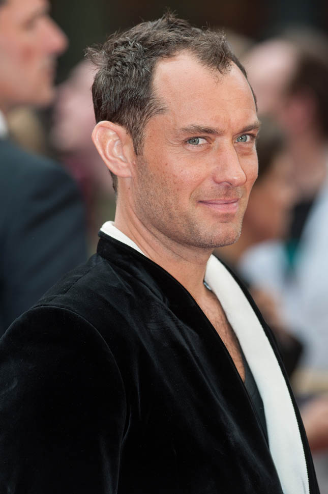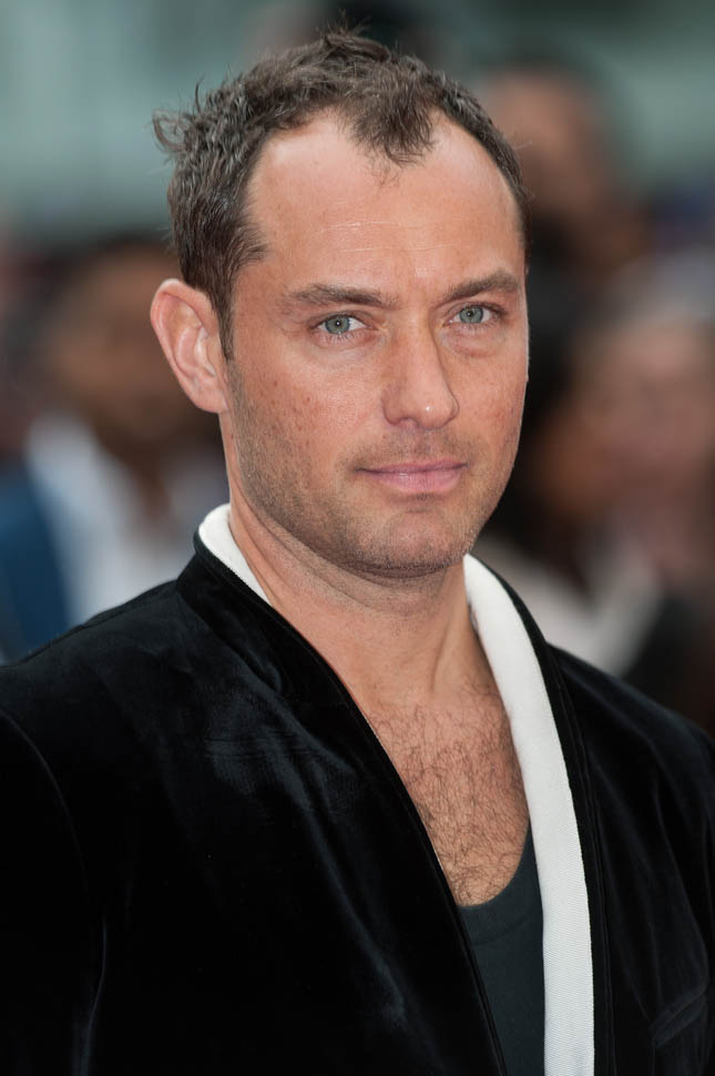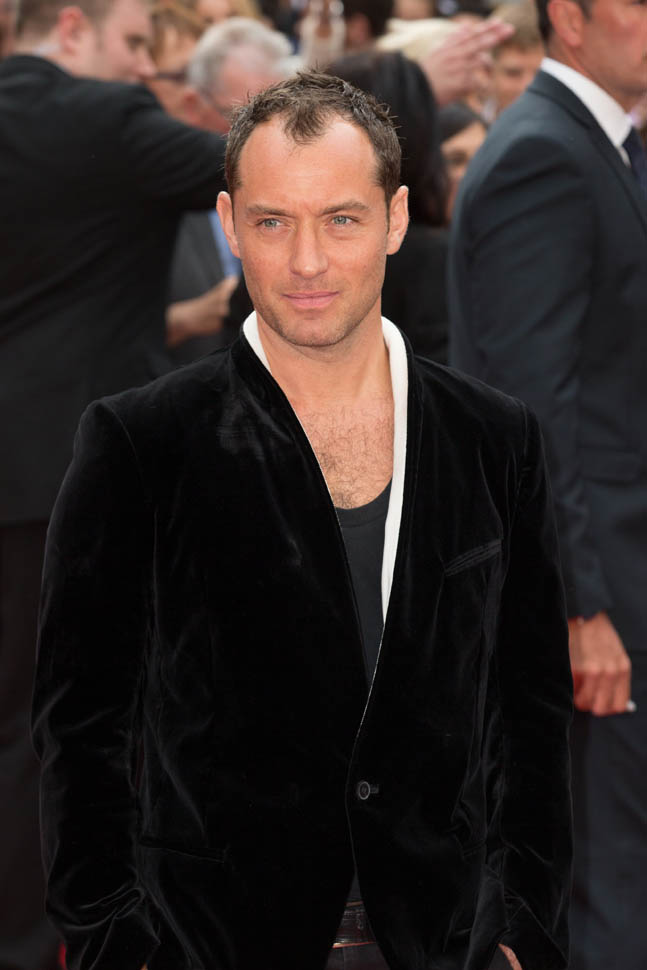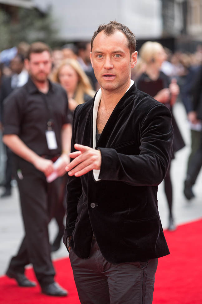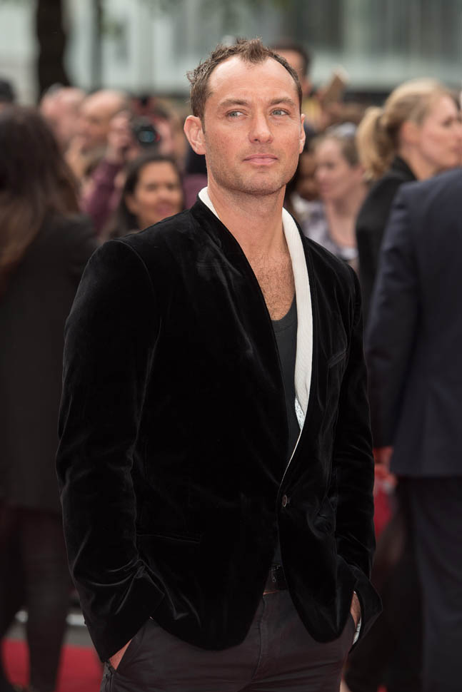 Underneath a white-lined velvet jacket? I don’t understand this. I don’t know that anyone else but Jude thinks this looks good. If I had to guess, I would say he’s compensating. He’s showing you the hair on his chest to make up for what he’s losing on his head. But hey, that doesn’t mean he can’t get work. A white dude in Hollywood can lose his hair and gain weight and it’s never a problem.