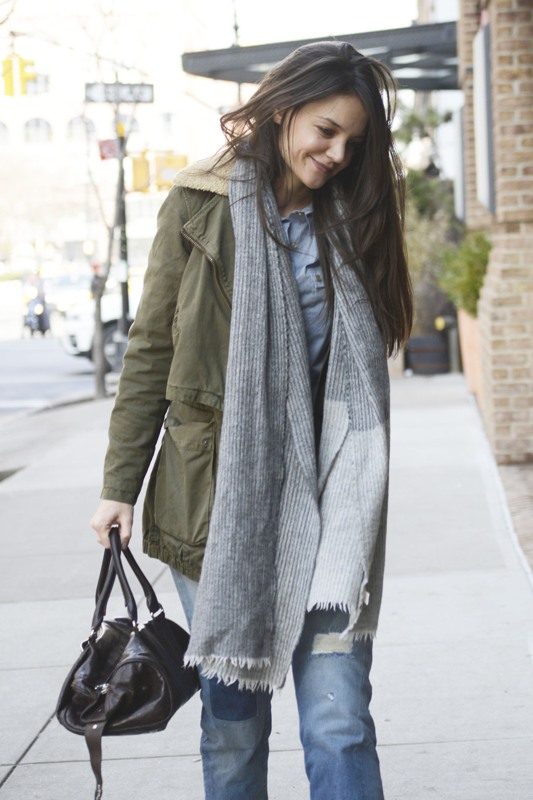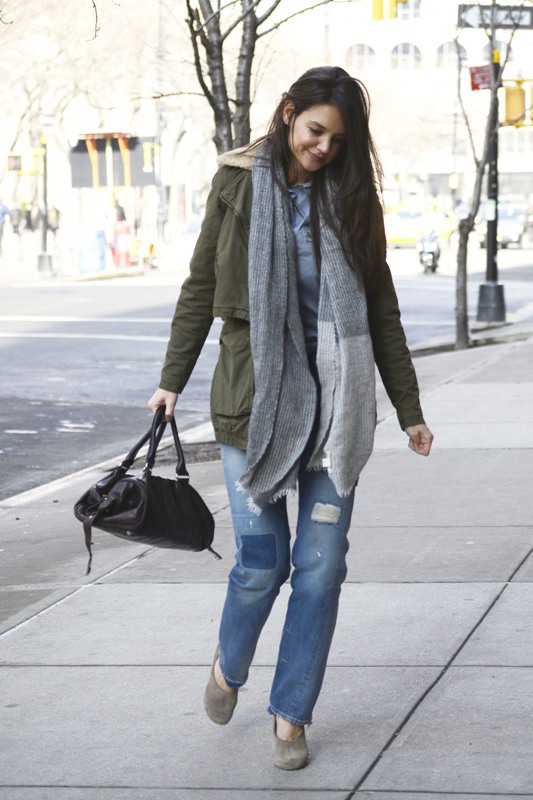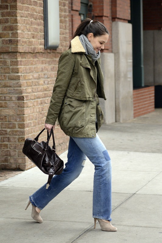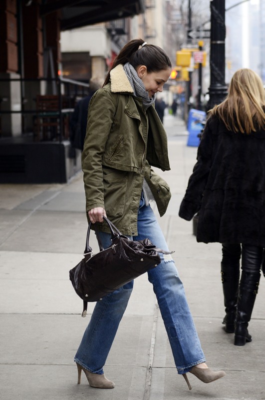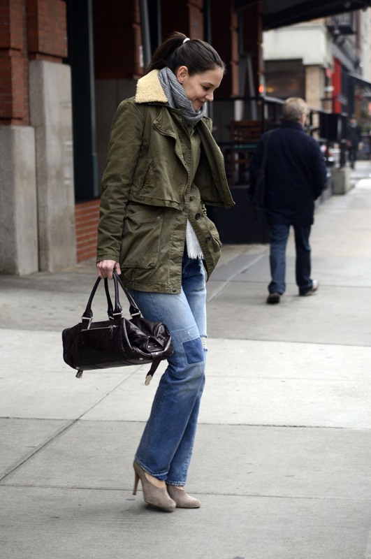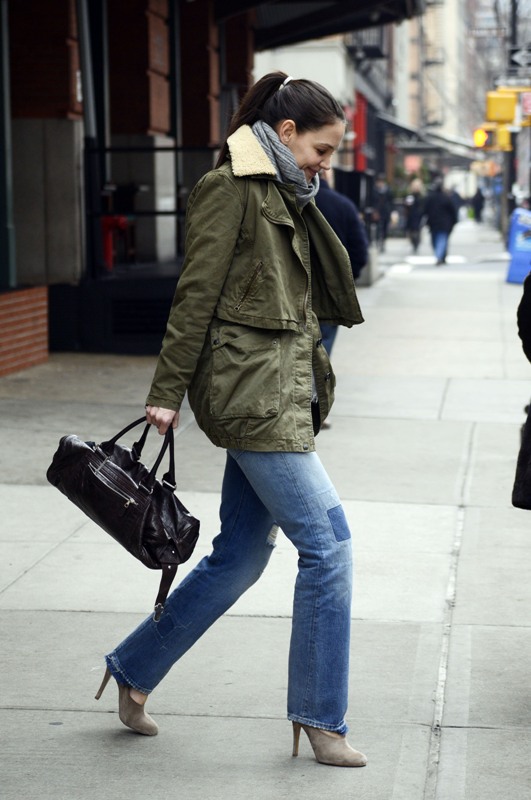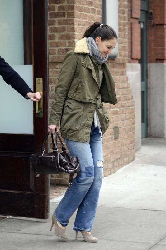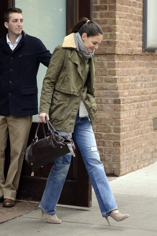 Attached - Katie in New York yesterday making weird denim and footwear choices again.