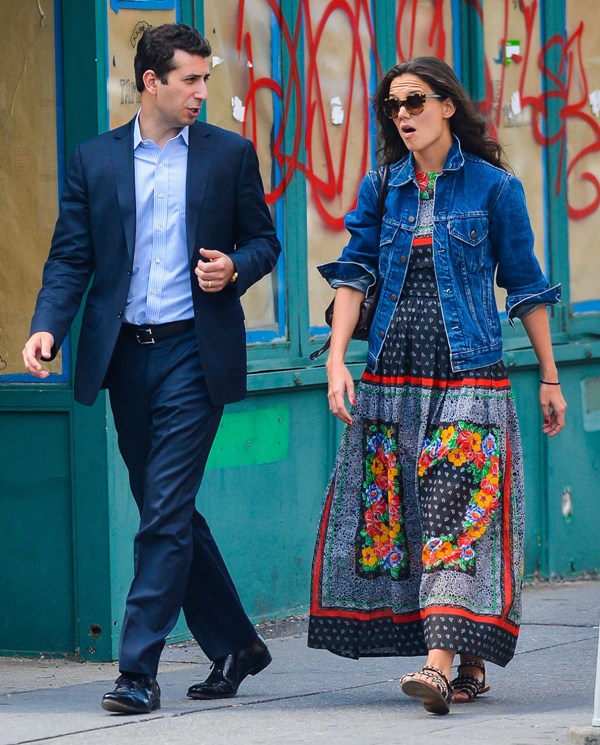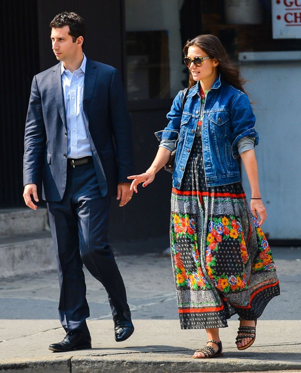 She seems to be celebrating in peasant style. As in dress. Last week she wore this while out with a friend. Two days ago she was in a really cute yellow print skirt. One of the best looks we’ve seen from her in a while. And yesterday, with her agent, she wore a long peasant dress under a denim jacket. It’s a proper peasant phase.