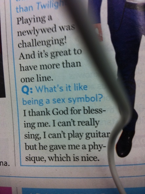 He is more insufferable to me than ever since Comic-Con. And, you know, if I were him I’d be a little more careful about that secret because it’s no longer a secret anymore. Anyway, my friend Scott in New York, seeing that I was sh-tting on Kellan, being the bitchy, encouraging person that he is, sent me a scan from a recent issue of Us Weekly with an interview of Kellan Lutz. This was his note in the email:
