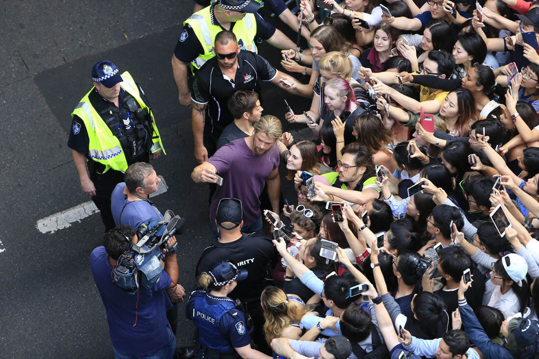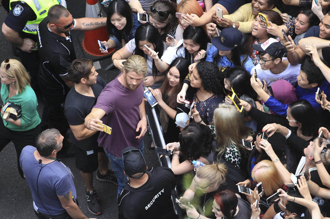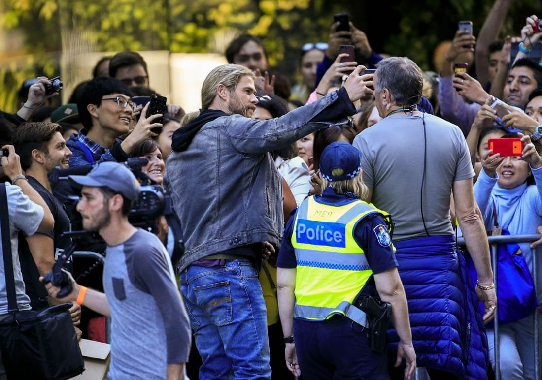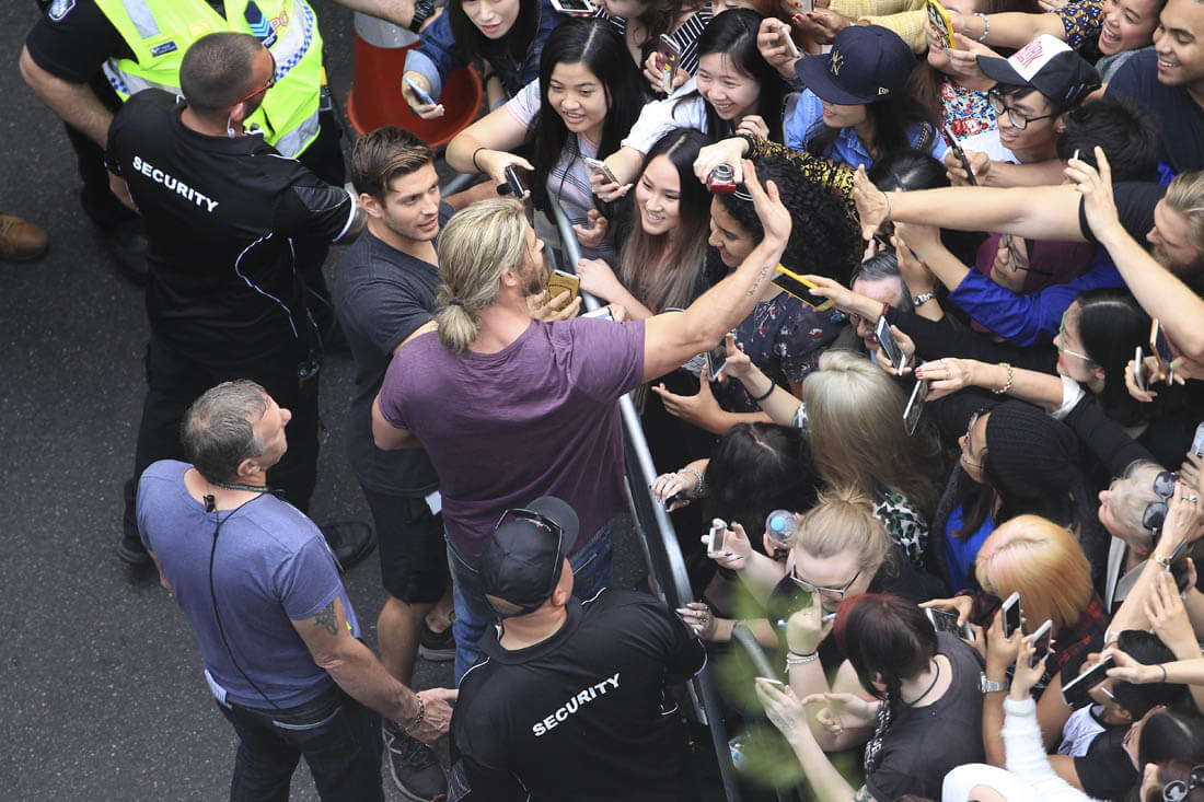 Filming continues in Brisbane for Thor: Ragnorak, which means yet more photos of Thor and Loki walking around in civvies (I love how, in street clothes, Loki always looks like the older sibling). Now that everyone in Australia knows where they’re filming, crowds are gathering to watch the goings-on, and it seems like the cast is being pretty cool with the crowds. The crowds maybe are having some issues—there’s a Fainter!—but Loki’s been away for a while. His super intense fans have bottled up that energy for years.