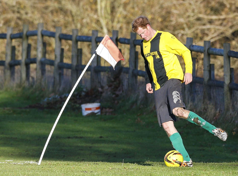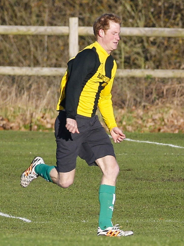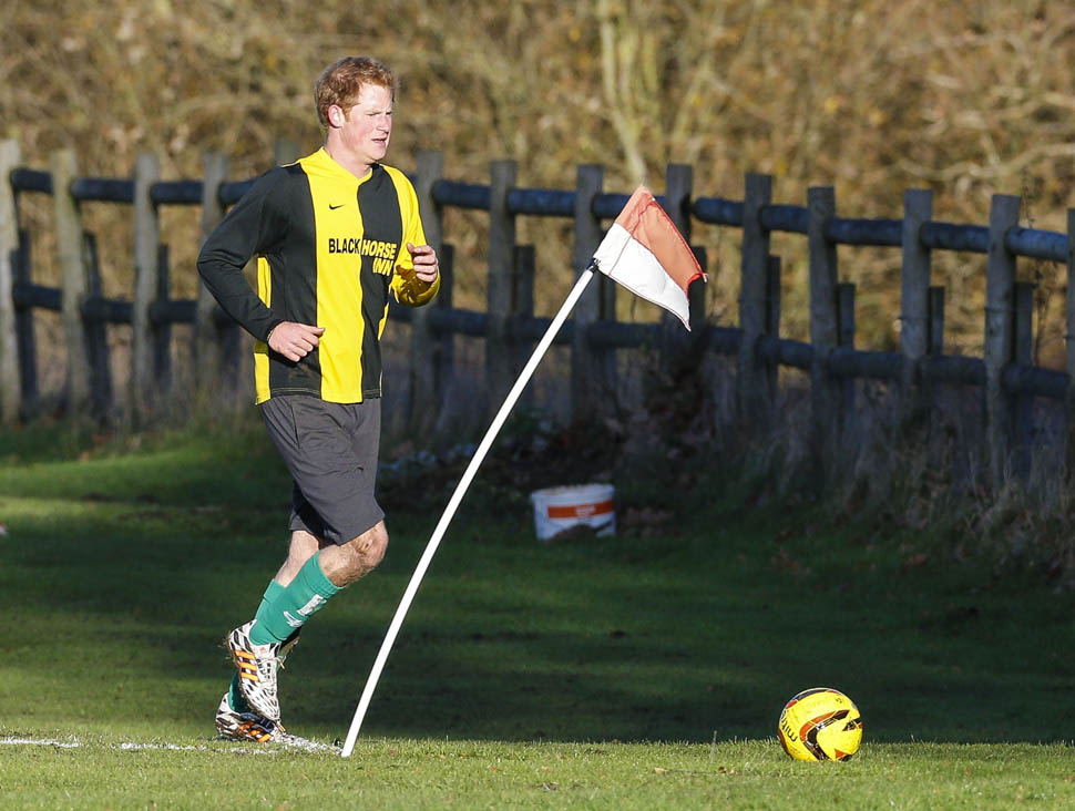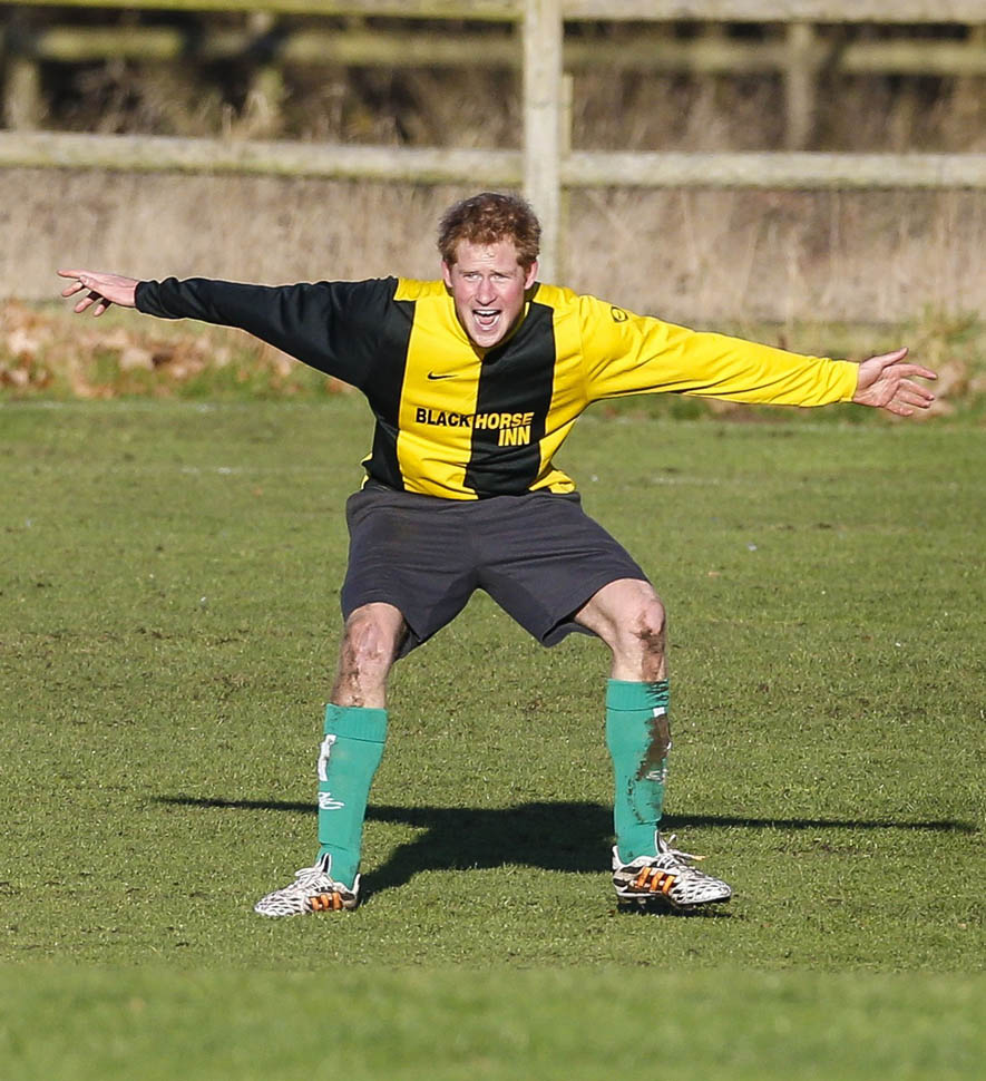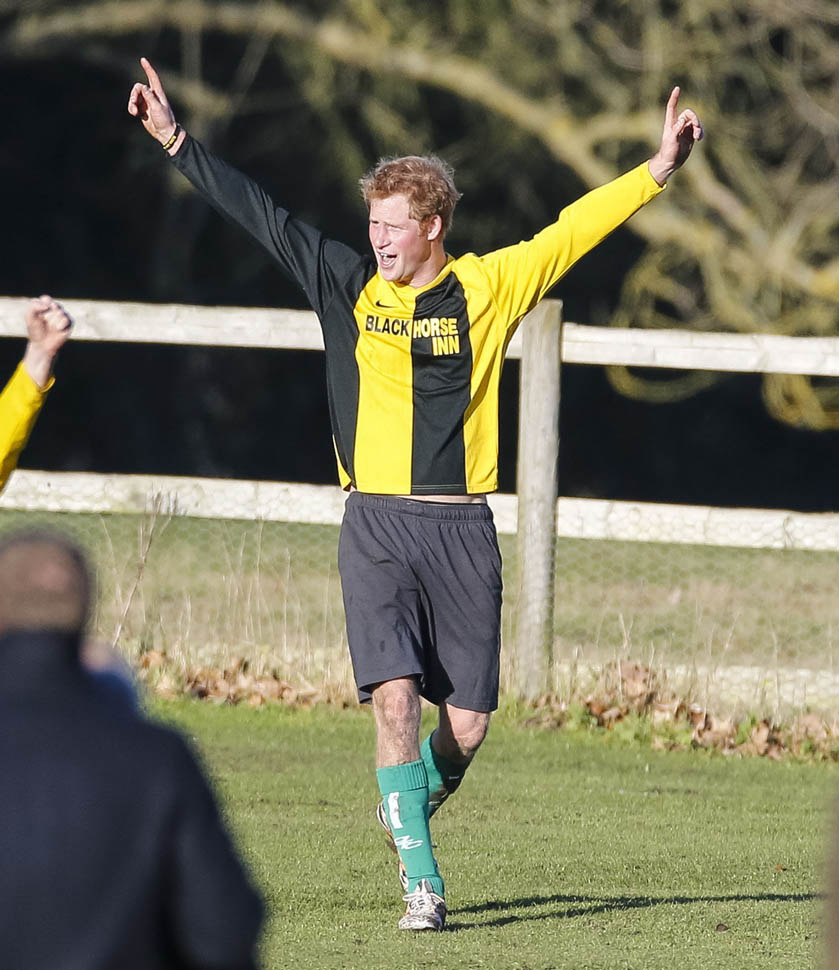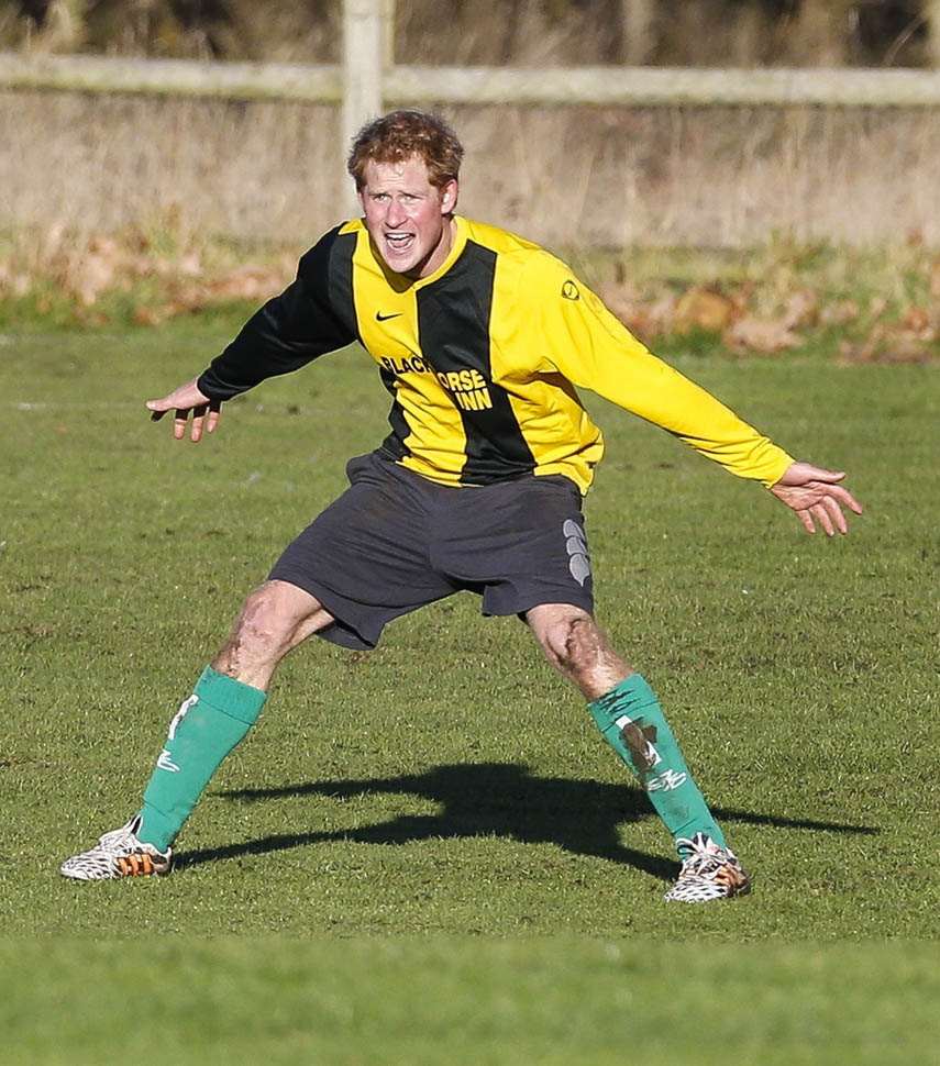 Prince Harry participated in a charity football game today at Sandringham where the Queen and the royal family gather for Christmas every year. He’s animated and sweaty and flushed and contorts his body in various positions and…well…