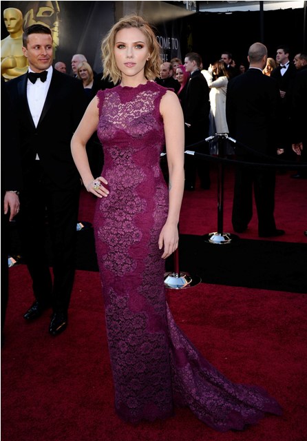 But she’s been doing a lot of lace lately, non? At the Globes it was lace too. For the Oscars, lace again but Scarjo brought it in a lot tighter. I’m not sure it’s my favourite, but there are parts of it I really like. The back, the colour, the fit, her hair, and her ass…