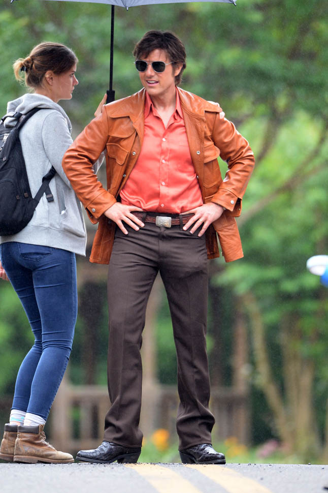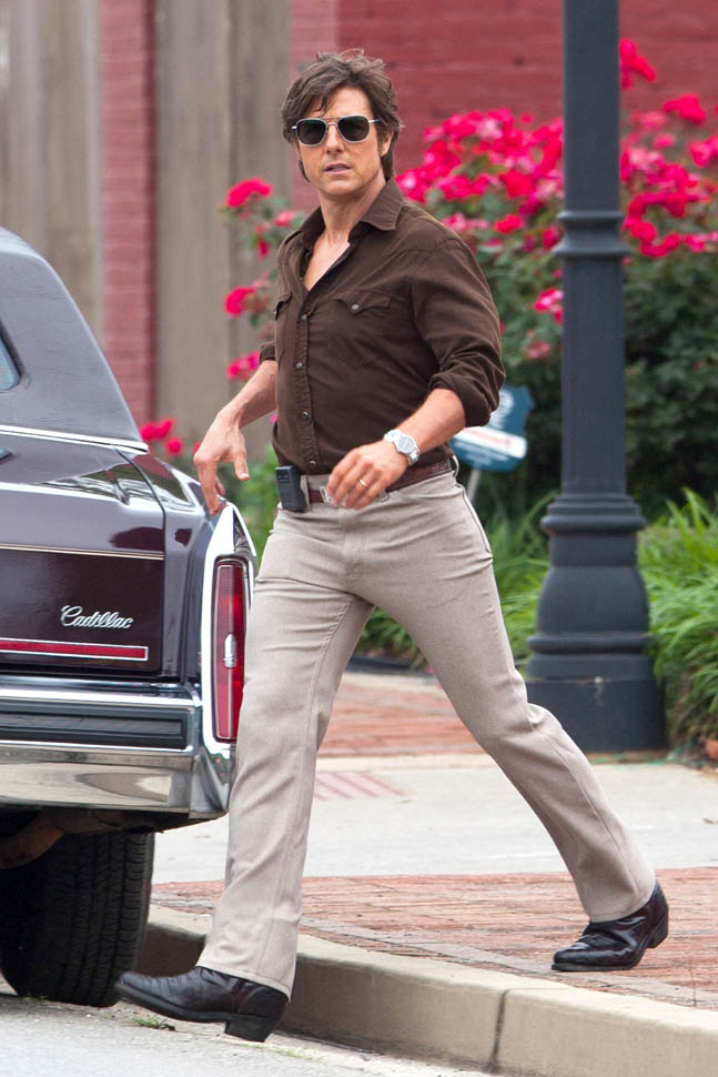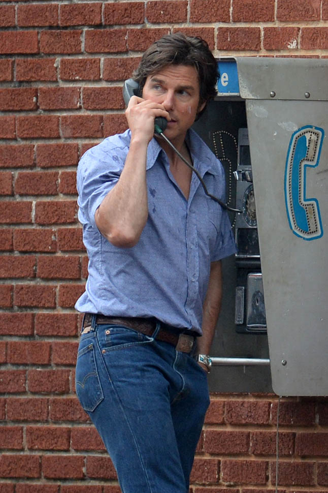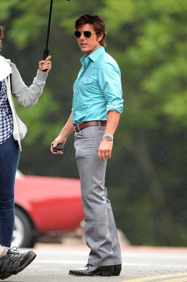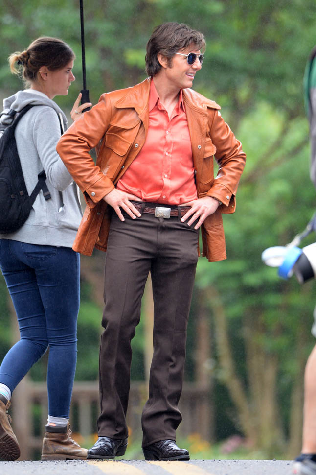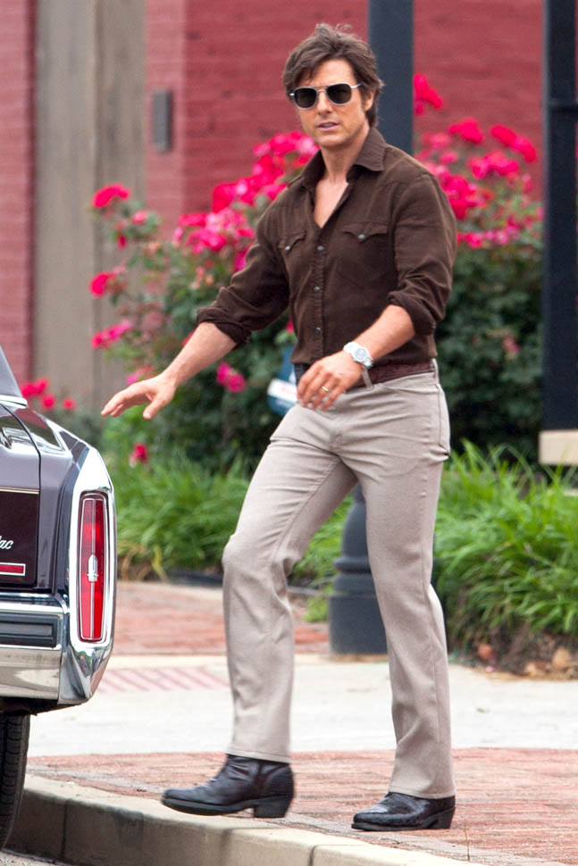 Tom Cruise is trying to make orange his colour in Georgia on the set of Mena today. I’m not sure if he’s also trying, unsuccessfully, to make himself Jon Hamm in the pants. Probably just a handkerchief.