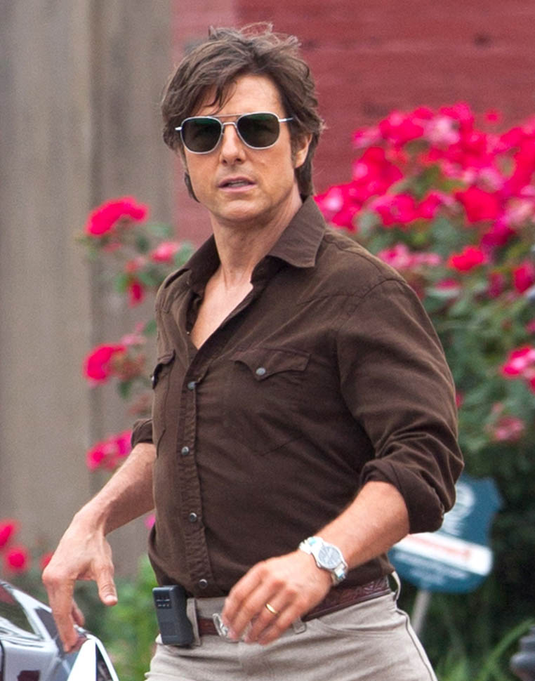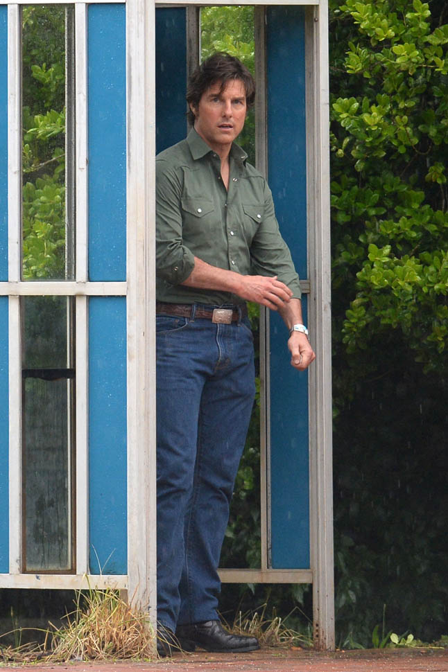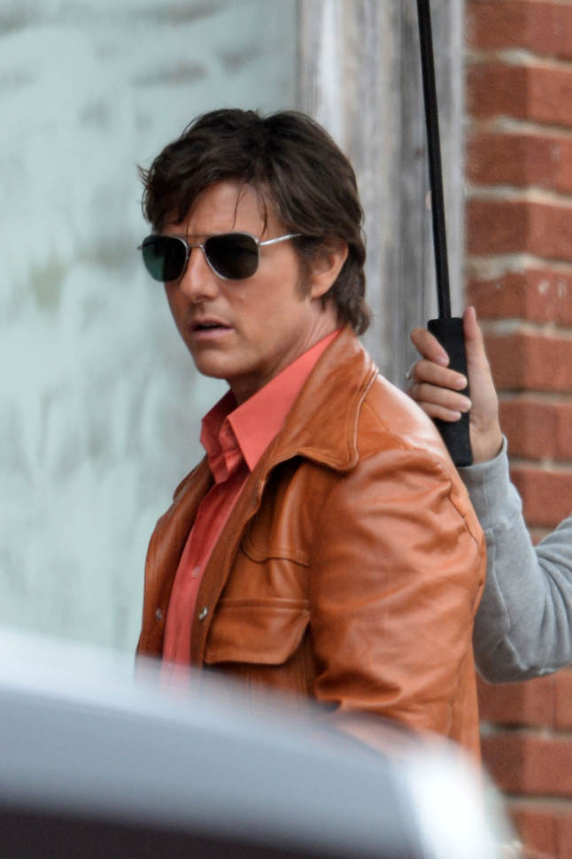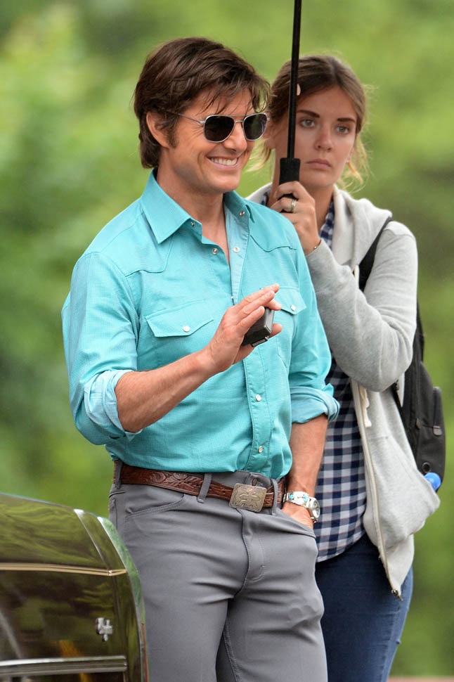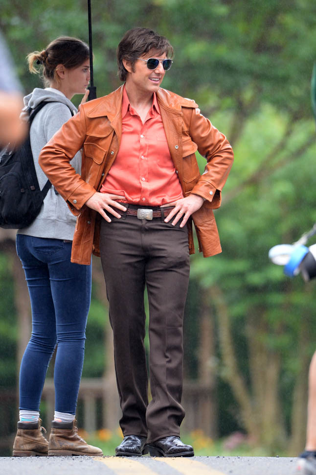 Tom Cruise is trying to make orange his colour in Georgia on the set of Mena today. I’m not sure if he’s also trying, unsuccessfully, to make himself Jon Hamm in the pants. Probably just a handkerchief.