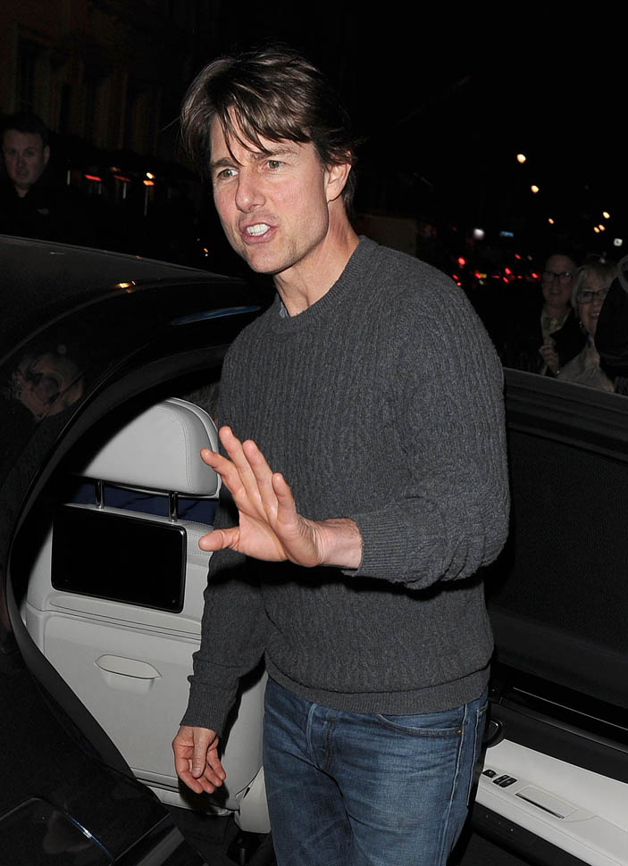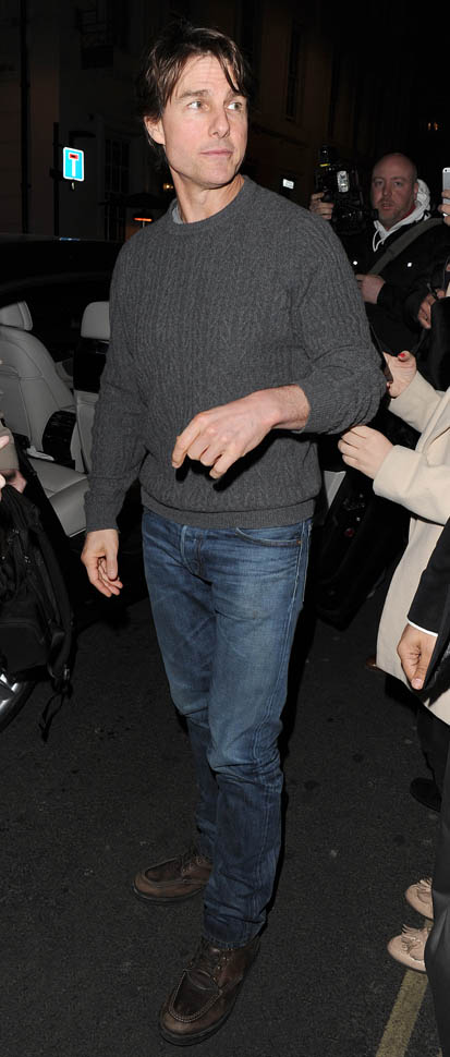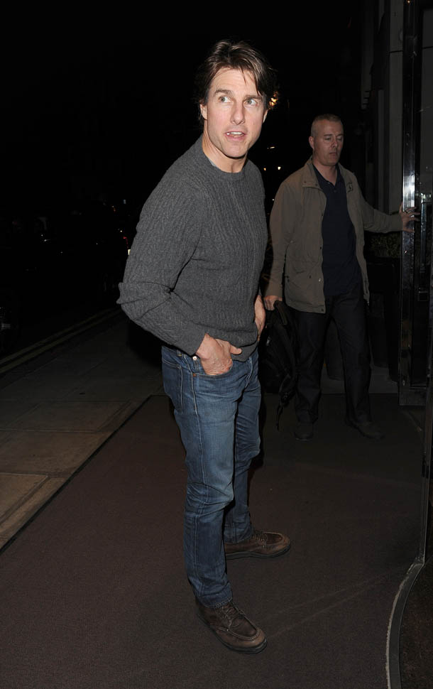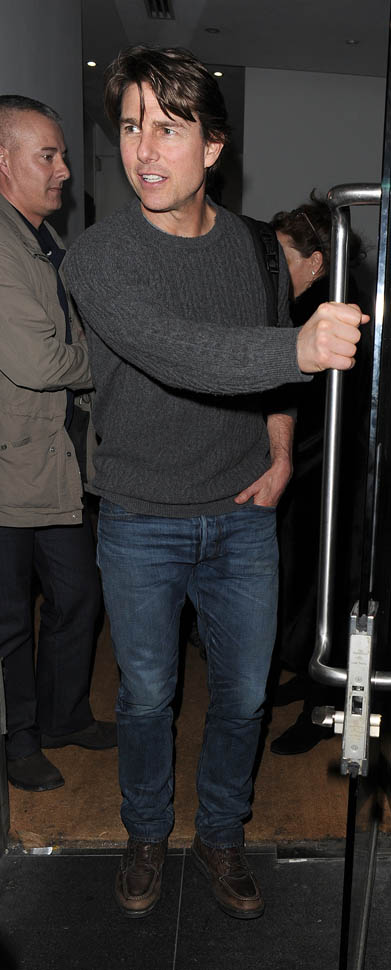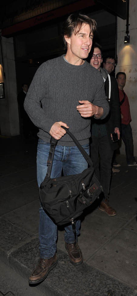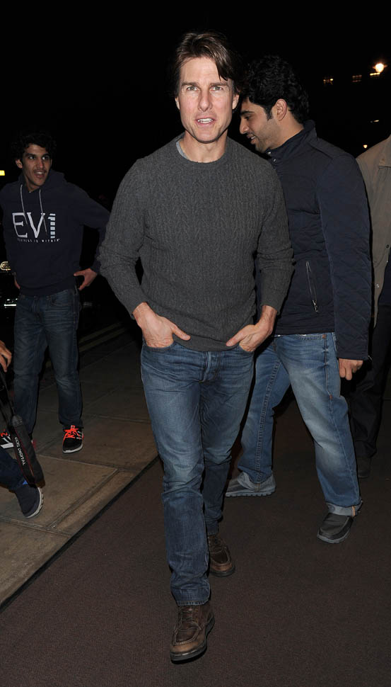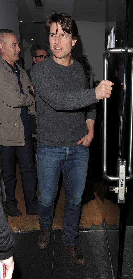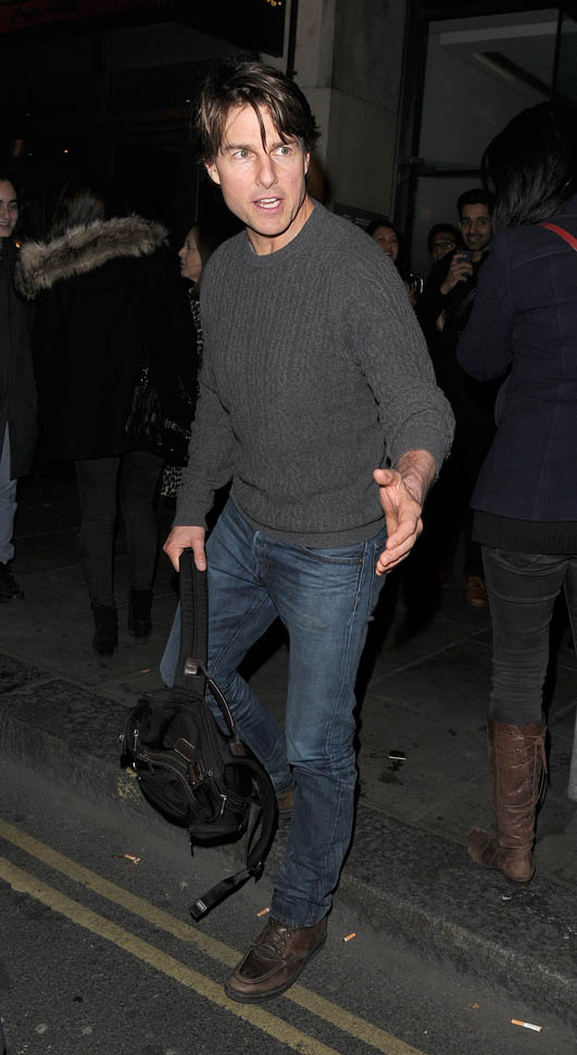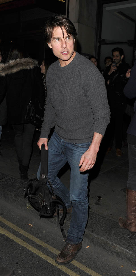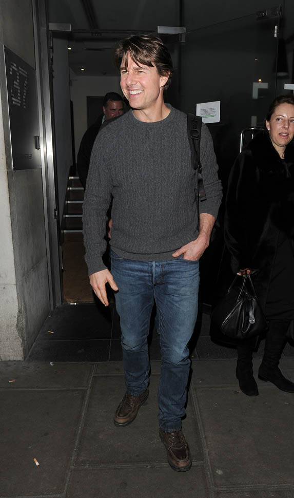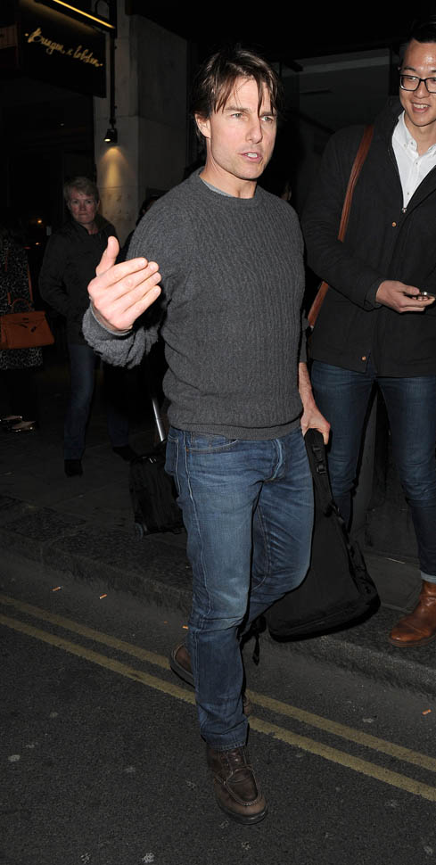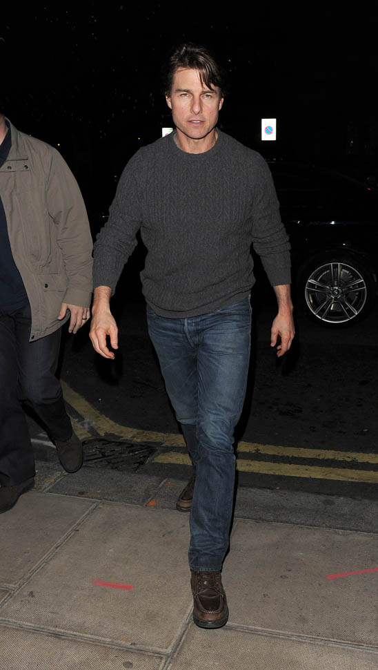 Last night Tom was photographed in London, leaving a production office. Always working. Work is the reason he’s cited in the past for not spending more time with family. But Going Clear has given everyone permission to get publicly suspicious about his devotion to Xenu. US Weekly has it as an inset on their cover this week, calling it an exclusive, with the headline: