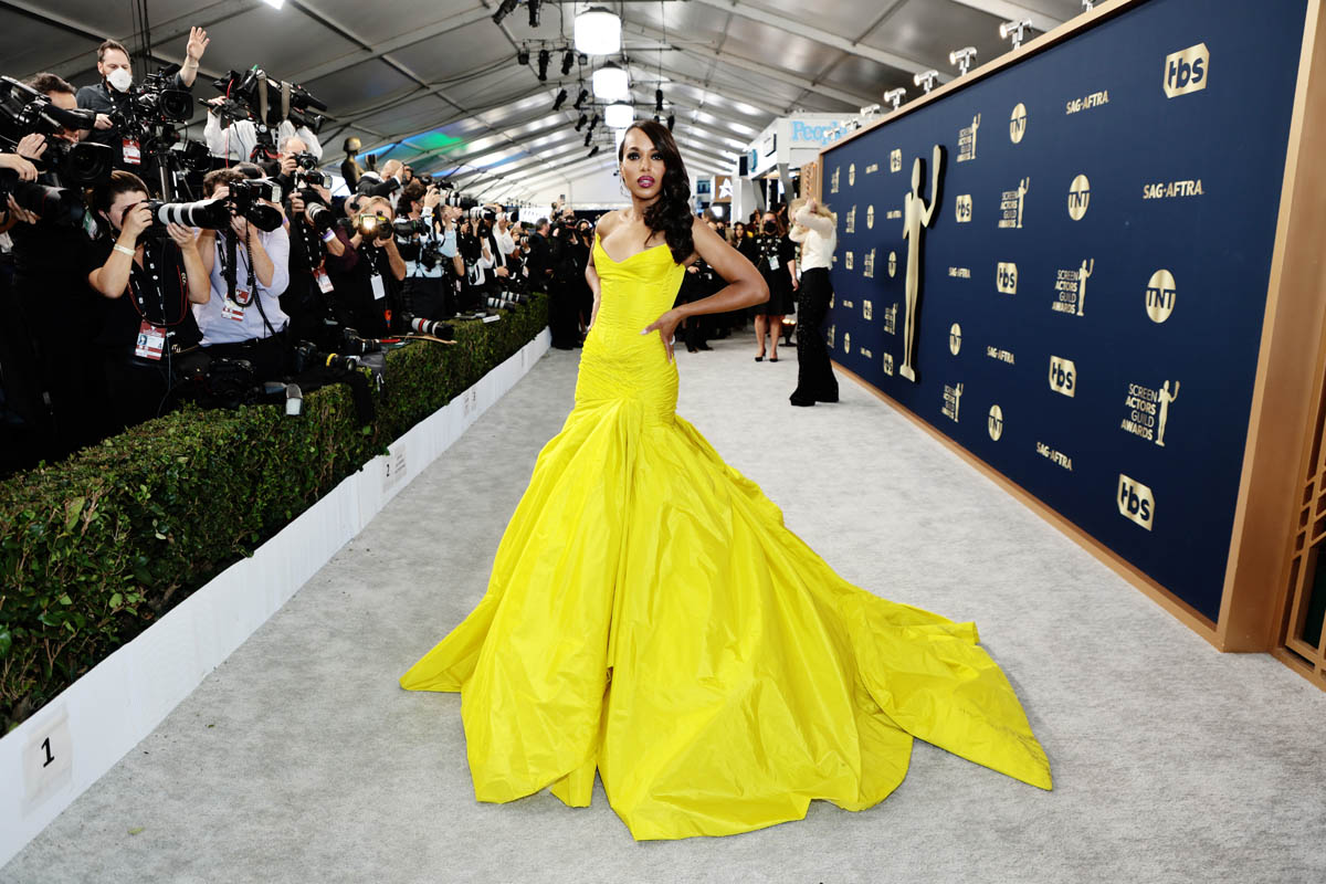 From black taffeta to bright yellow… and this is not typically a material that I love on a red carpet but it’s all in the details and the construction. And also, well, Law Roach. Law Roach isn’t giving you basically prom taffeta. On Kerry it’s a corset and then a dramatic taffeta wrapped skirt so that you’re only getting that taffeta effect from the hips down. And since there are so many different textures incorporated, the visible wrinkle factor is scaled back. Because, of course, Law would have accounted for that. This is spectacular: