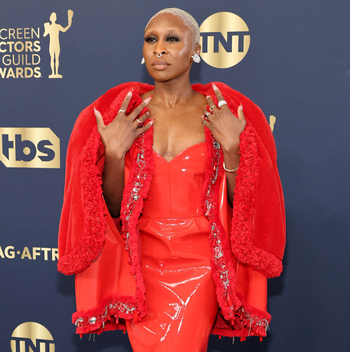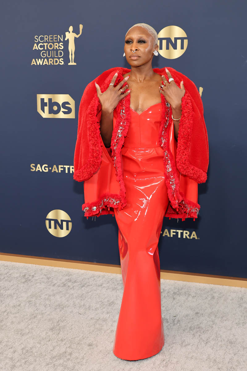 Staying with colour, Cynthia Erivo in red Louis Vuitton – a red strapless latex column dress and I prefer it with the jacket over top but I also appreciate that one of the jacket’s purposes is to set up the reveal. It’s just such a great f-cking jacket with the two tiers and the two materials: