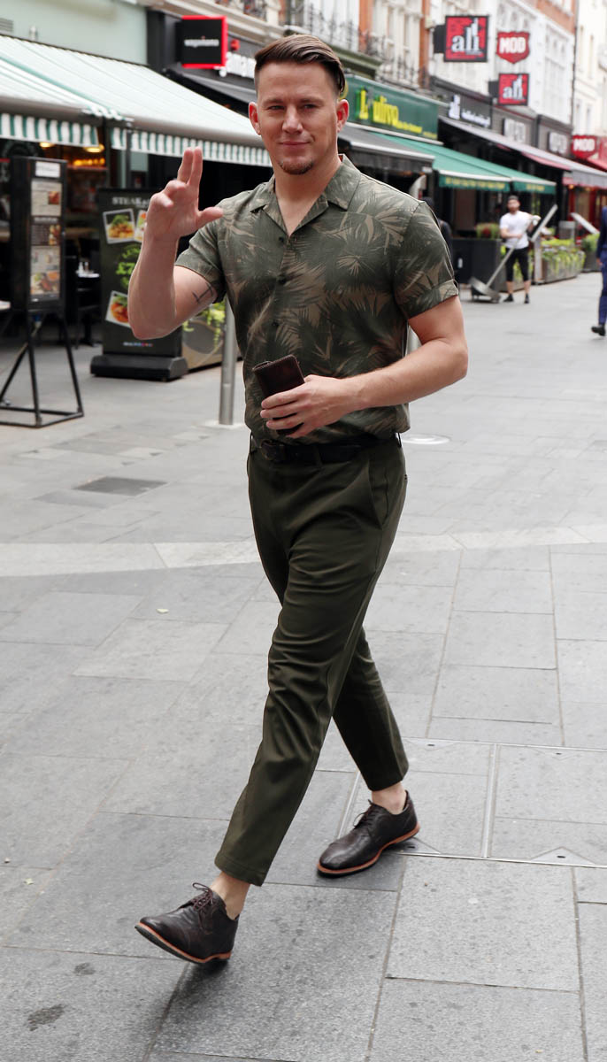 When I looked at these shots of Channing this morning, and these other shots I’ve attached of him today, outside the theatre promoting the show, in a green short sleeve printed top with green pants and black Timberlands, my first thought was…does he look really good? Is this a “post breakup makeover”? I want it to be. People talk a lot about the “post breakup makeover” but it’s almost always about women. It’s not just women. Men too. Allllll the time. Not that Chan needed a makeover, although there have been times when he hasn’t seemed all that fresh. The freshness though is here – clothes fit really well, crisp haircut, no bloat on the face. Am I imagining it or do you see it too?