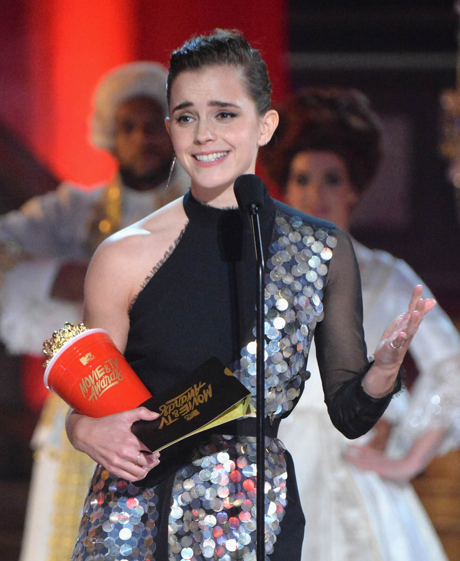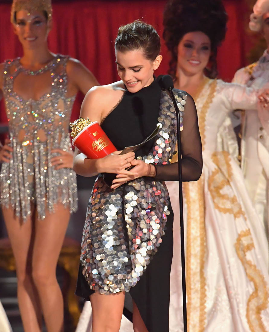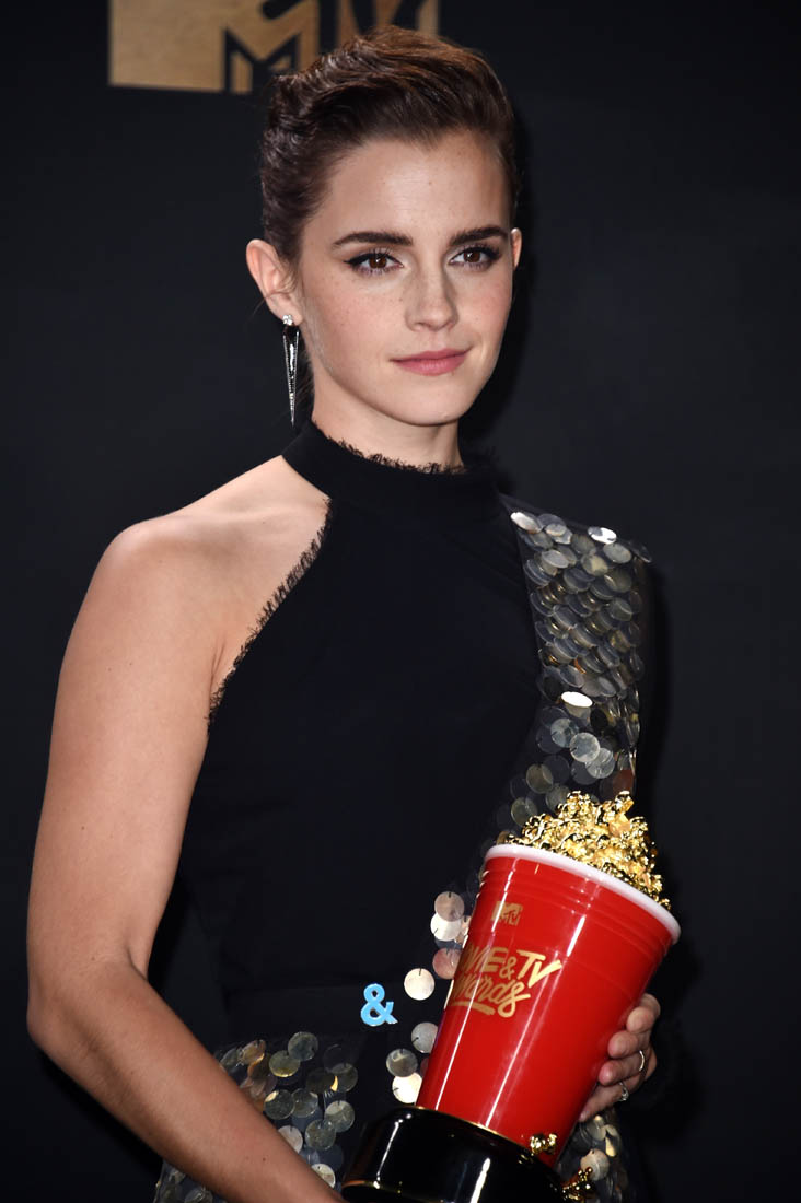 MTV announced a few weeks ago that for the first time in history, the acting categories at the MTV Movie and TV Awards would be based on performance only, not separated by sex. Last night Emma Watson became the first to win the Best Actor in a Movie award. Others nominated in the category: Daniel Kaluuya (Get Out), Hailee Steinfeld (The Edge Of Seventeen), Hugh Jackman (Logan), James McAvoy (Split), and Taraji P Henson (Hidden Figures).