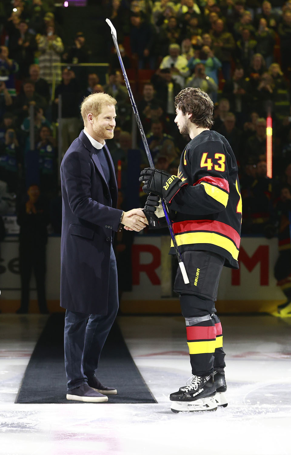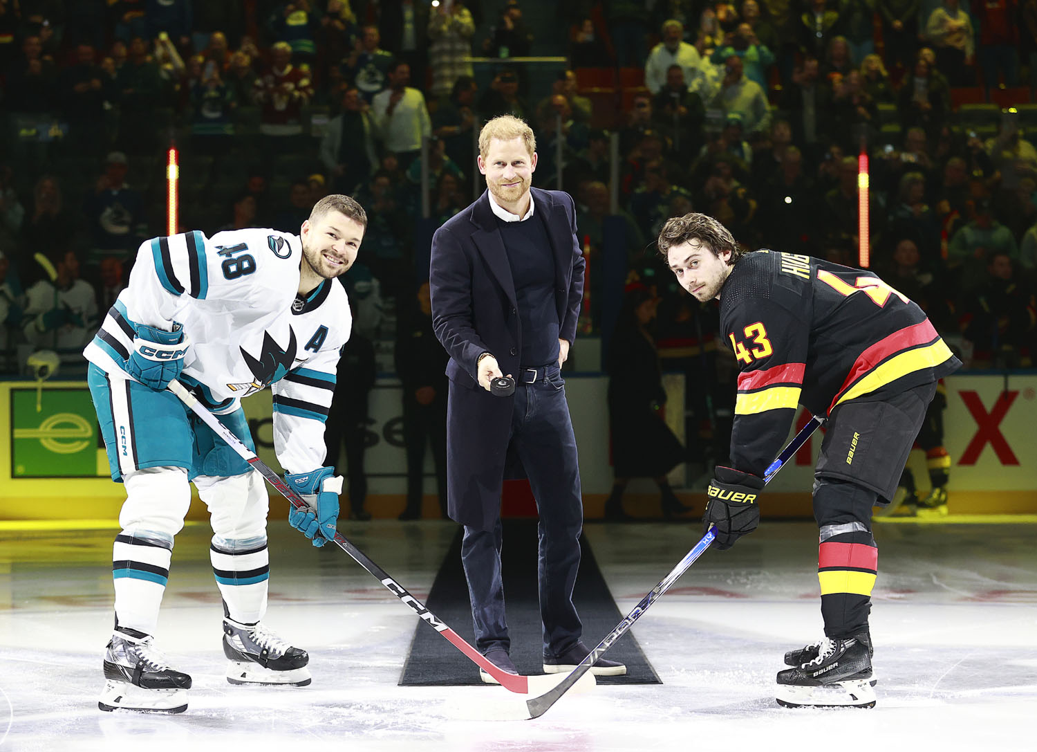 There’s some history here though, and perhaps it’s why Harry and Meghan were at this game in particular? Back in 2002, during a visit to British Columbia, Queen Elizabeth II also dropped the puck, and it was also a game between the Canucks and the Sharks. I imagine it was probably pretty special for Harry to be doing what his grandmother did two decades earlier.