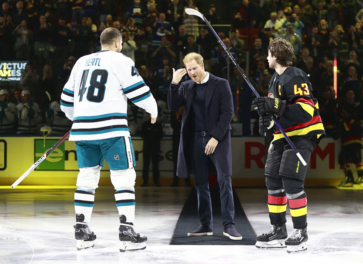 This story is coming to you courtesy of my husband, Jacek, because he actually heard about it before I did. Jacek is from Vancouver, he has the Canucks on google alert, so this was in his feed first. And he’s also the one who told me that Quinn Hughes shared with the media afterwards that he and Tomas Hertl, who were taking the ceremonial faceoff, had to tell Harry to drop the puck, which is why Harry was laughing right after. Basically they told him to “do that hockey”.