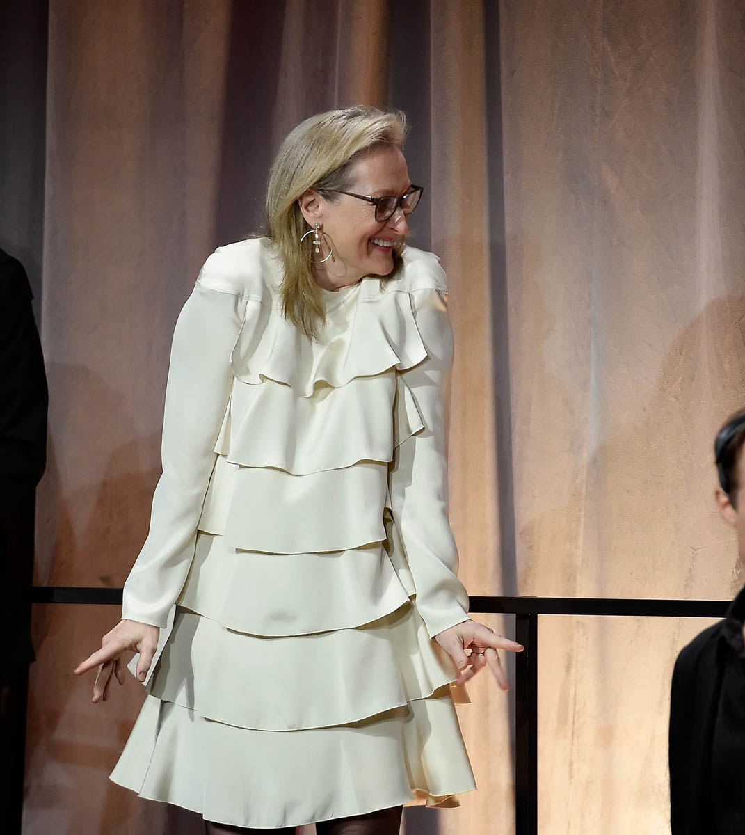 No one there had more nominations than Meryl Streep, of course, and Meryl isn’t bored of it. Meryl showed up in a tiered off-white dress and was pretty cute during the class photo, lifting her arms up in the air in celebration.