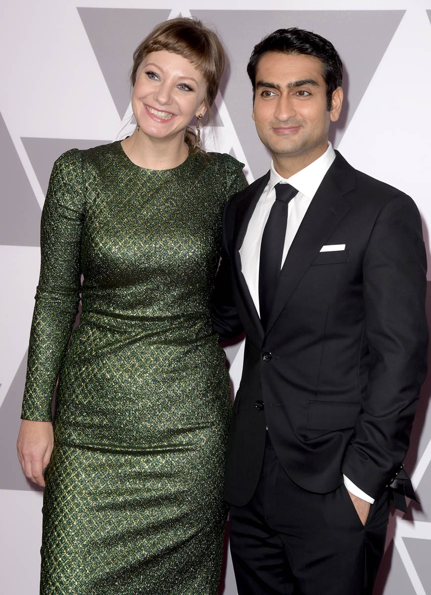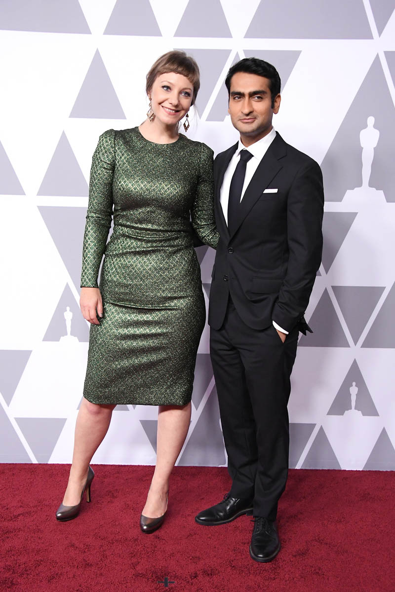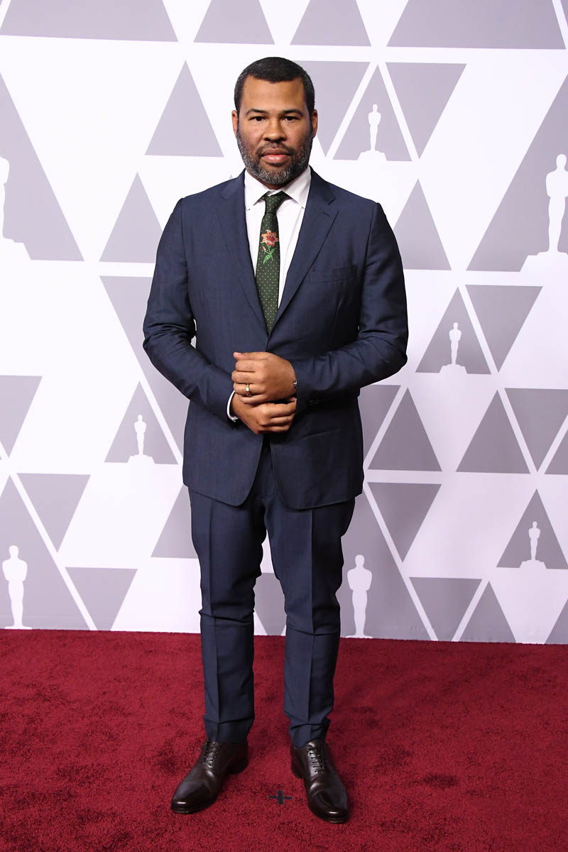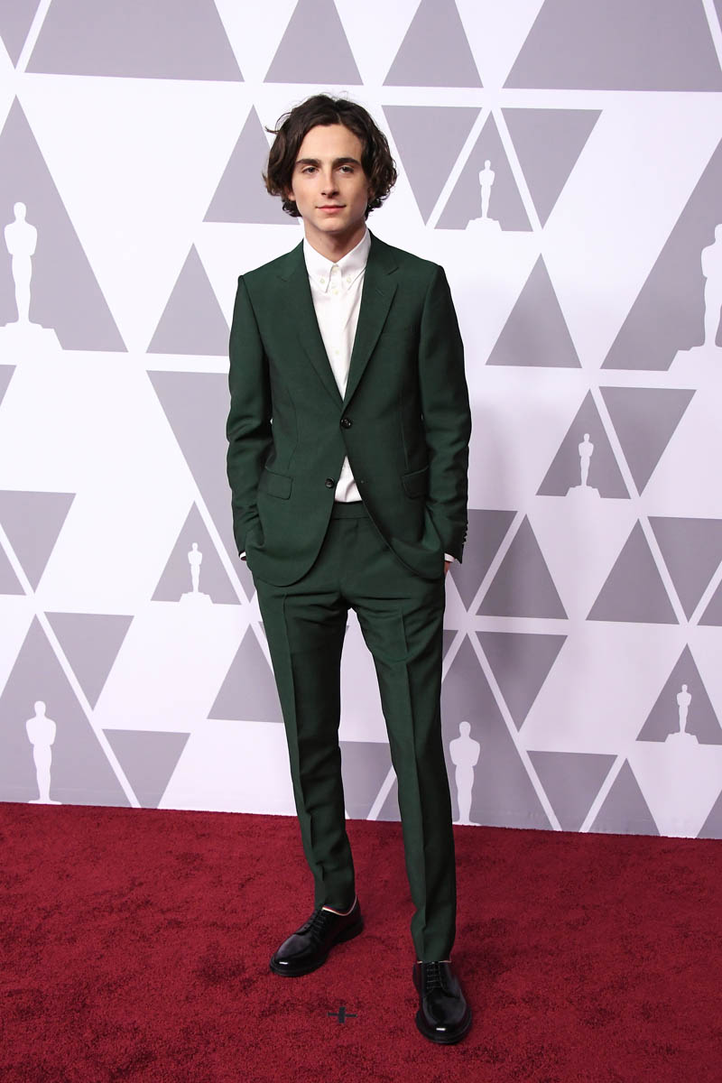 About this class photo – what would you do if you somehow got to be a part of it? As in what would you wear? Specifically the colour? Would you not want to stand out? Or would you want to f-cking stand out? I love that Emily V Gordon chose to stand out. Look how that metallic green pops in the group shot! It doesn’t seem as bright when she and Kumail Nanjiani are at the photo wall but when they’re lit all together like that, you can spot her right away. Same goes for Timothee Chalamet in a green suit. Or, if you want to be more subtle, you can do like Jordan Peele and go with green for the tie only.