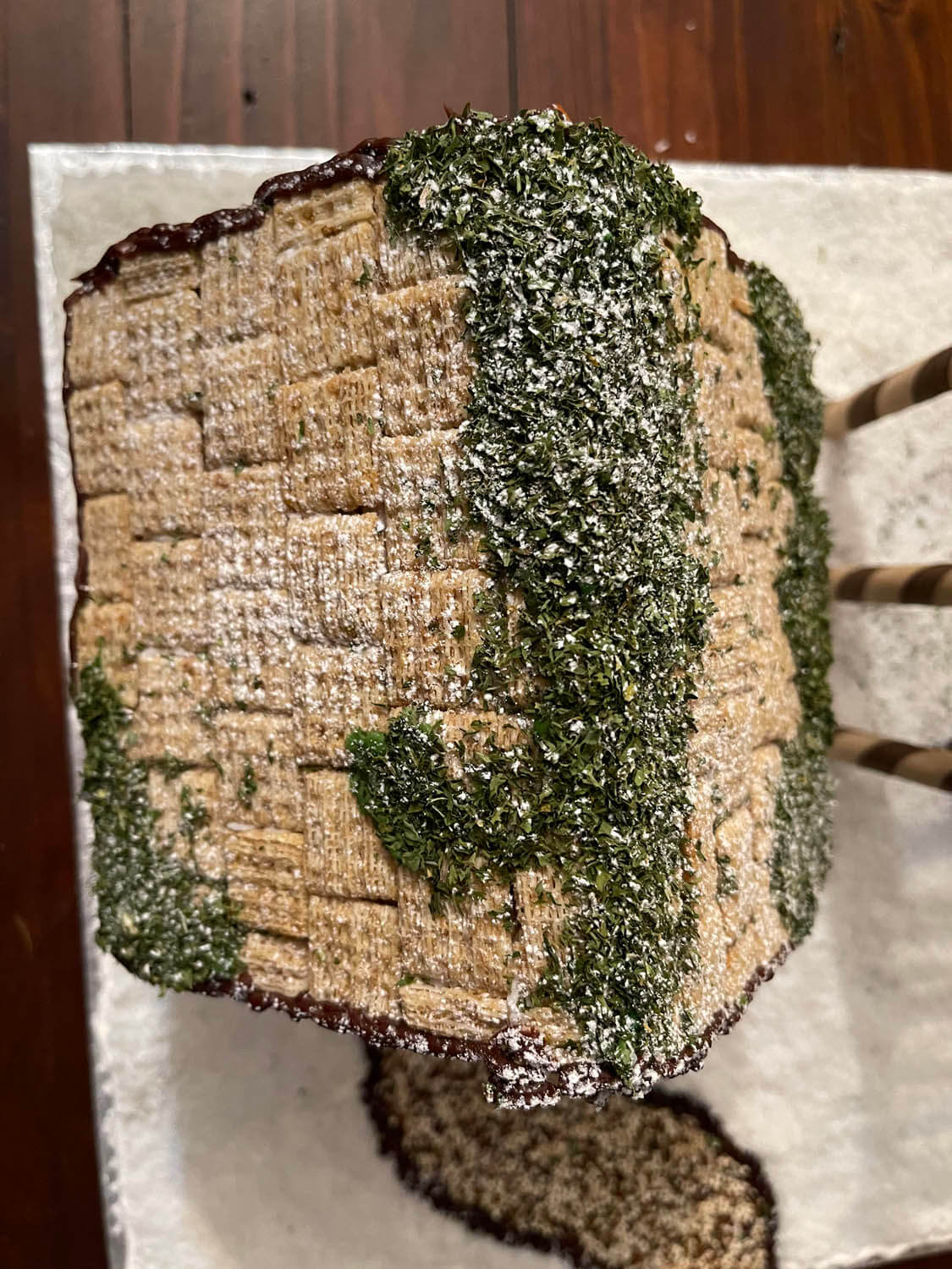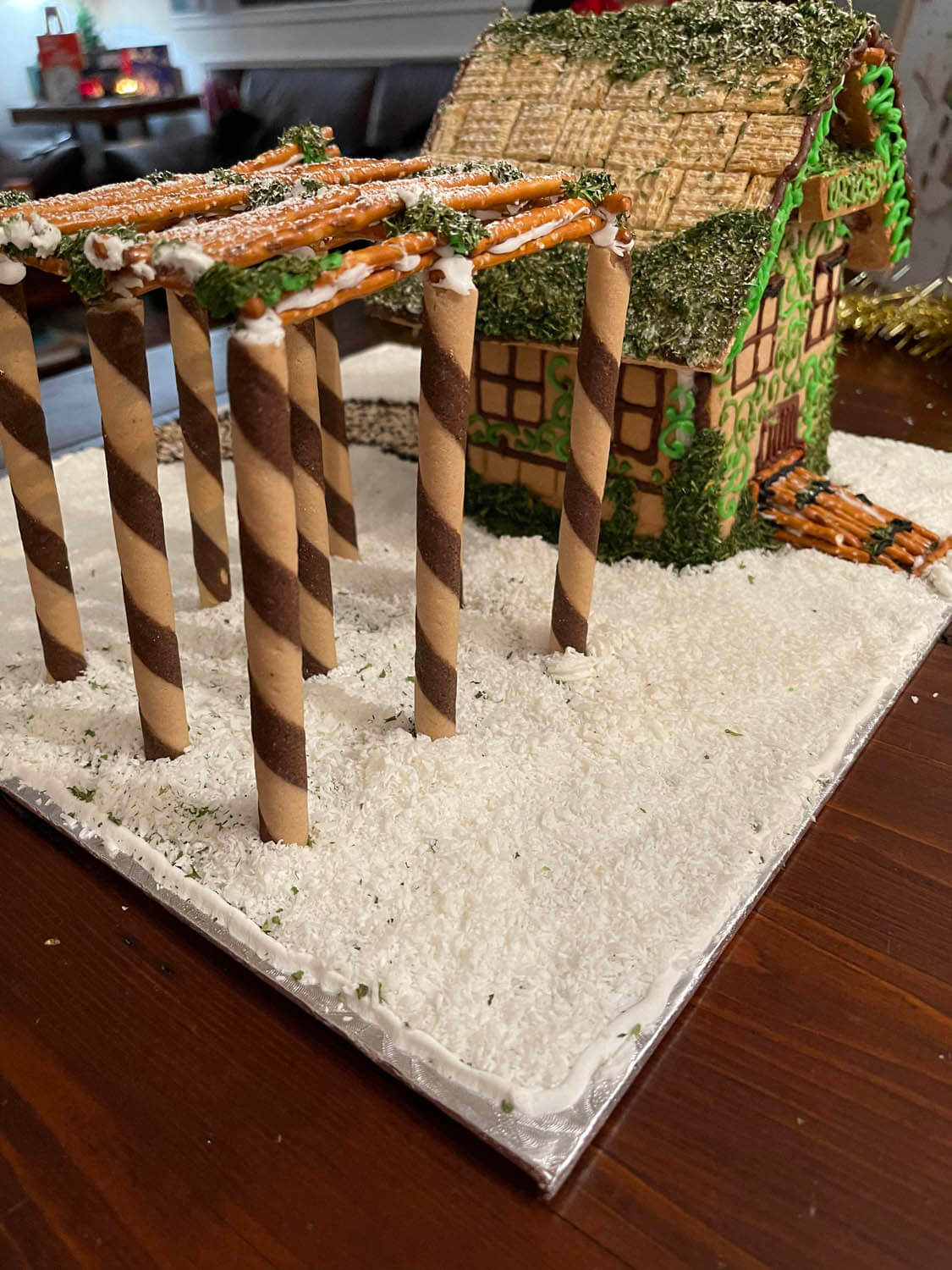 This entry features a quinoa gravel path leading to its cookie front portico. It has 3D window boxes, dried parsley for its namesake moss, a pretzel stick storm cellar door, a mini triscuit roof, a cookie and pretzel pergola, and plenty of piped green icing detail.