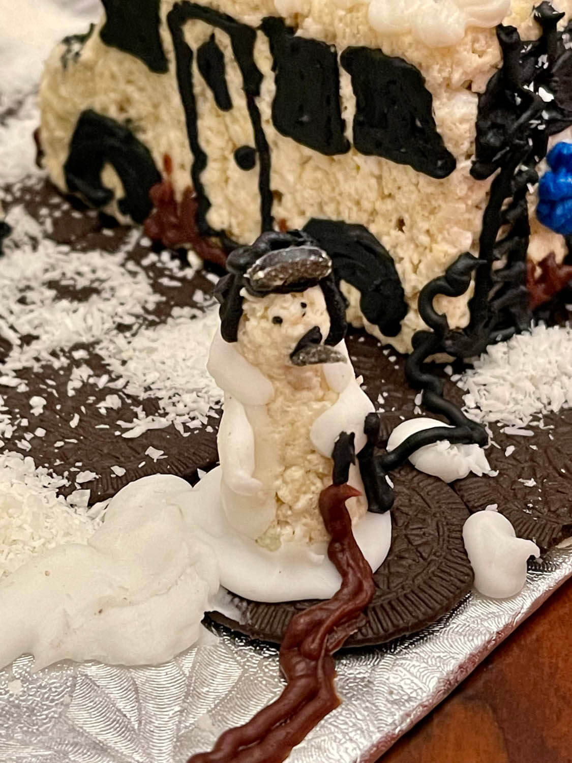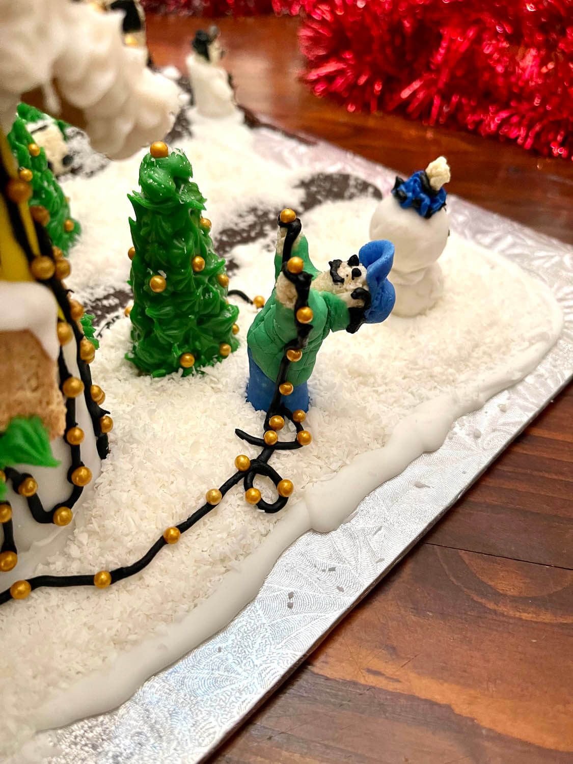 This recreation of the classic Christmas movie features copious piped icing and gold dragee strings of lights, being wrestled with in the front yard by fondant Clark Griswold. Rice Krispie treats were used to build the family station wagon (with a tree too big for the living room) and Cousin Eddy’s RV. Fondant Cousin Eddy services the vehicle in his robe.