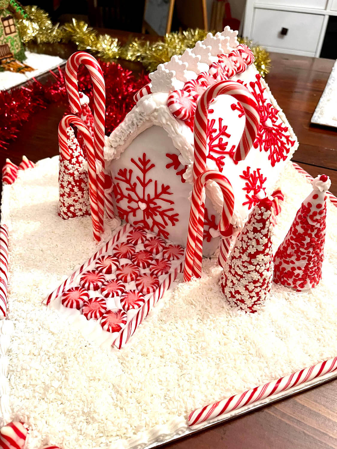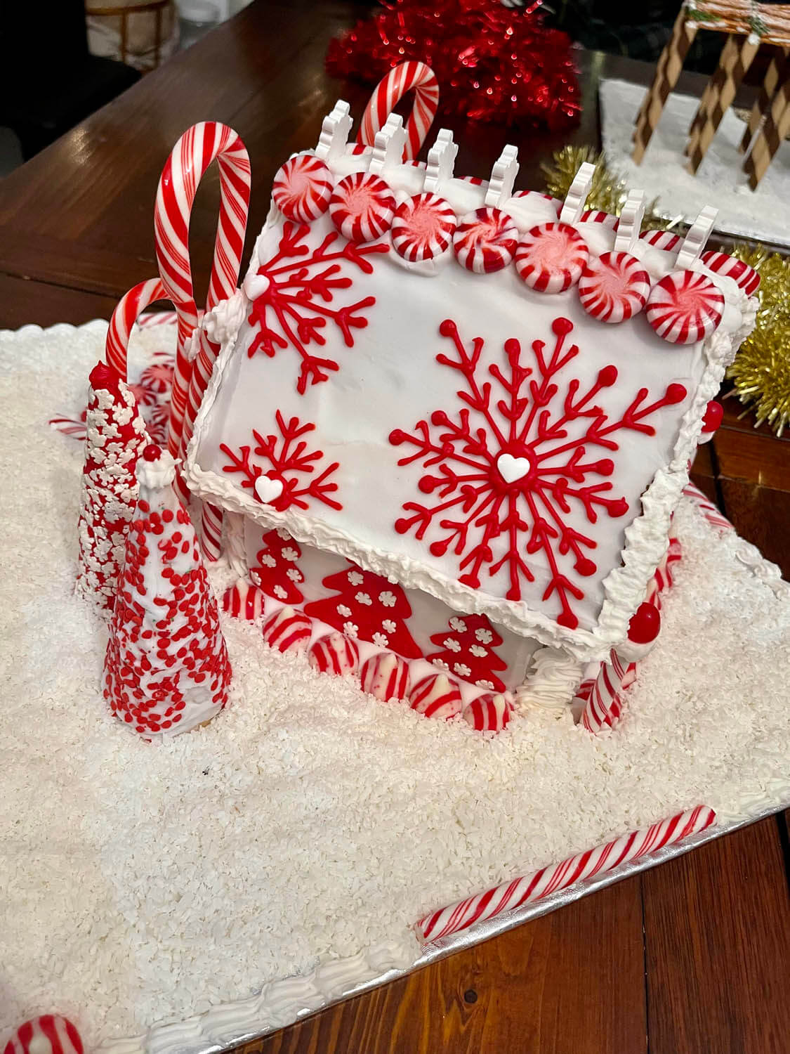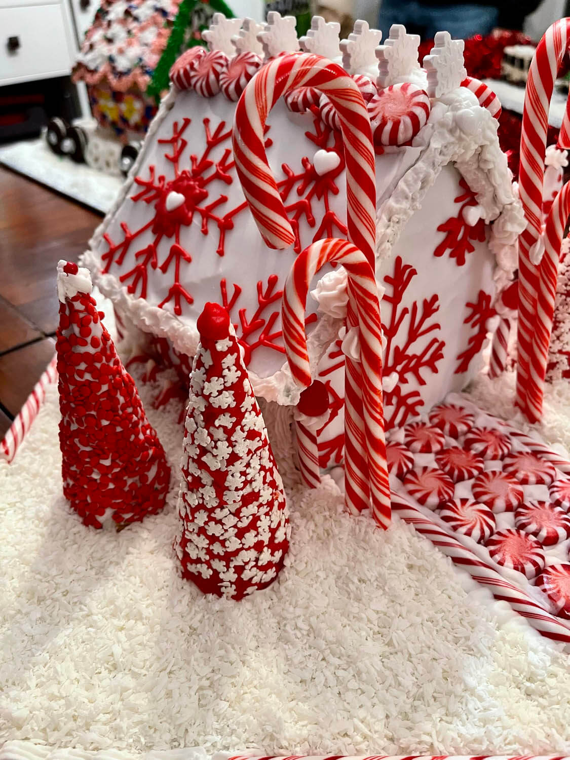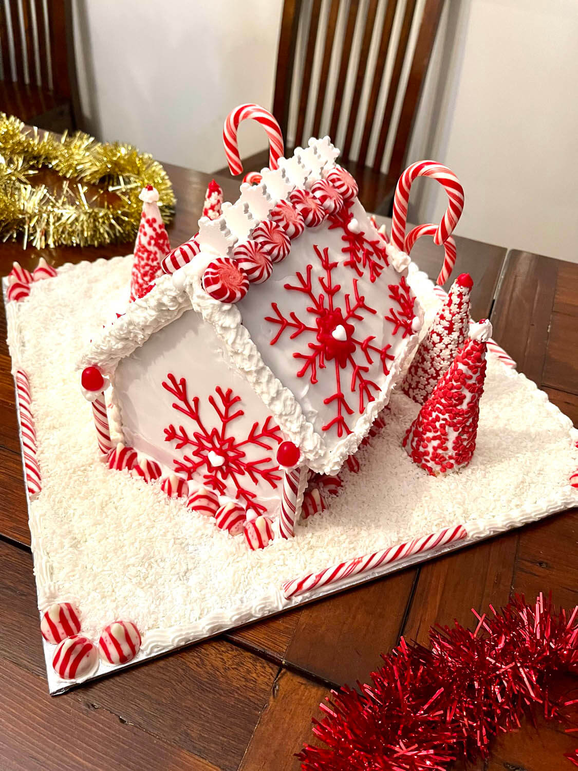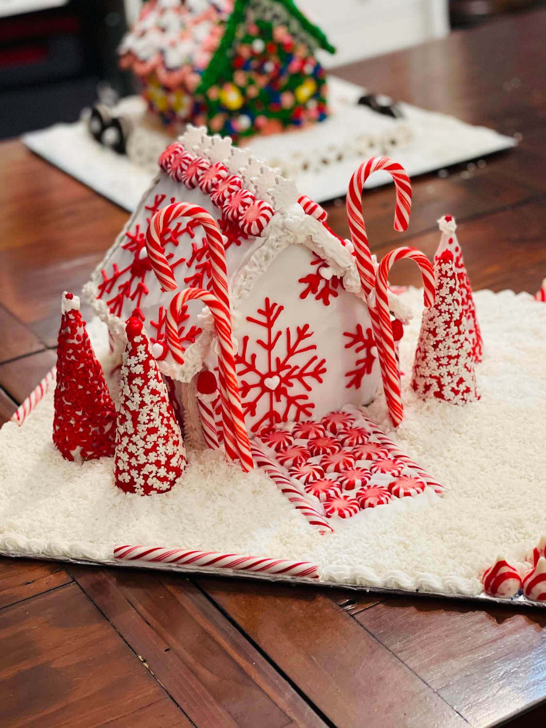 This minty entry was completely covered in white Royal icing before bright red snowflakes were piped on. Candy cane Hershey’s kisses surround the base of the house. The roof’s peak features candy snowflakes and peppermint candies, which also pave the front path. Ice cream cone trees (iced and rolled in sprinkles) and whole candy canes adorn this two-tone submission.