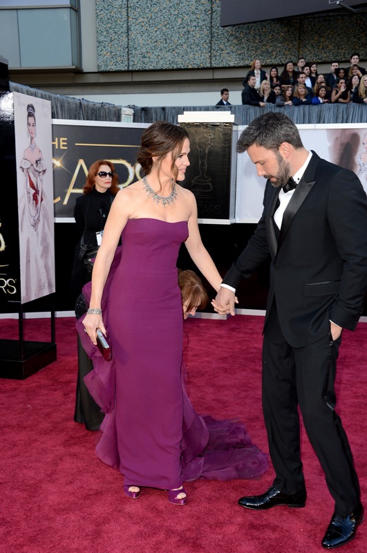 Well, she was FLOTUS 2012/2013. She showed up everywhere, on and off the carpet. She made sure he wore the right clothes, held on to the right child, rotated viewing time for him with each one, and together they saved it for when it mattered most: Here they are, the Afflecks, actually posing side by side for the first time as a married couple, on Oscar night AND of course on the victory lap at the Vanity Fair party.