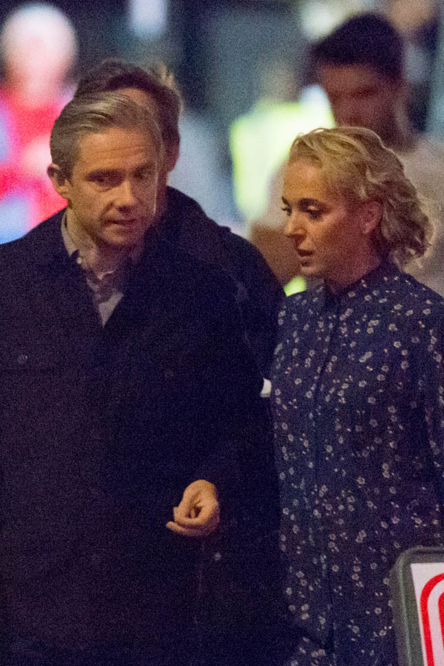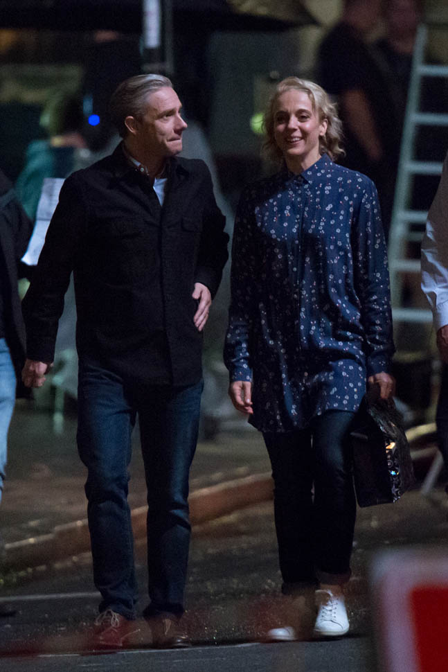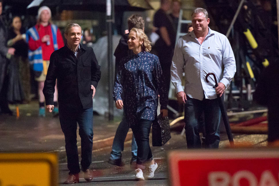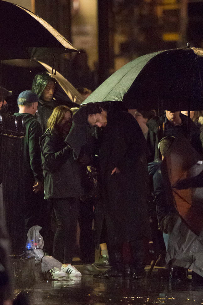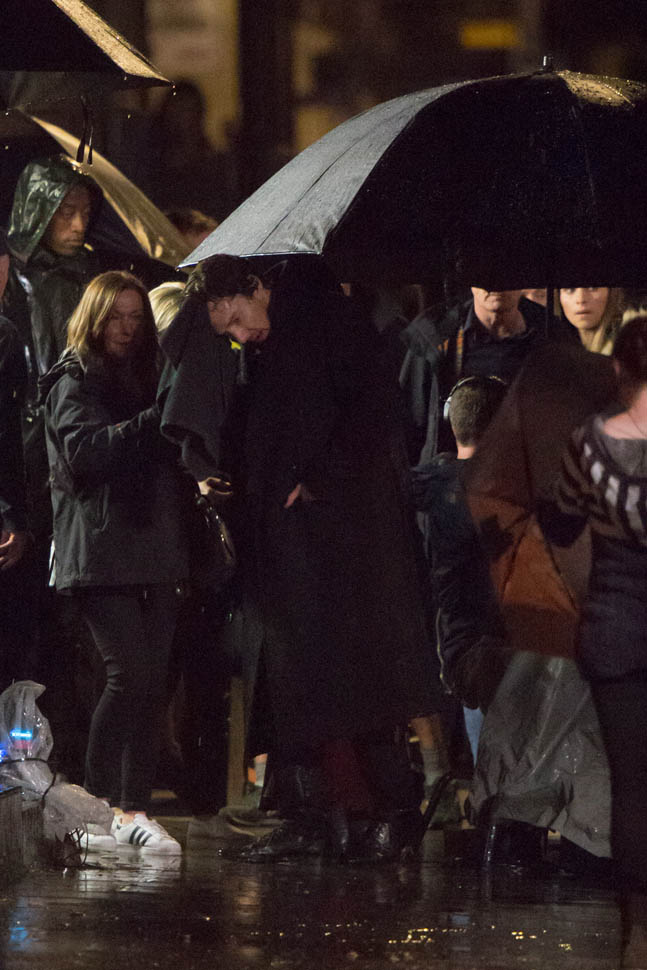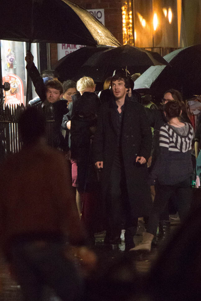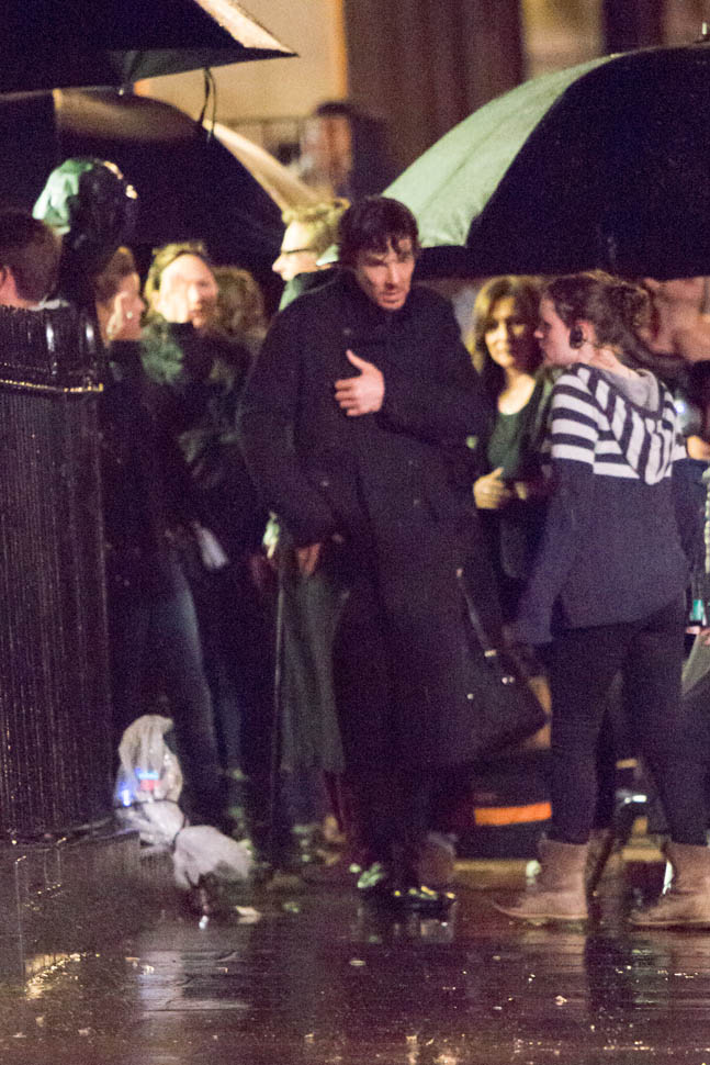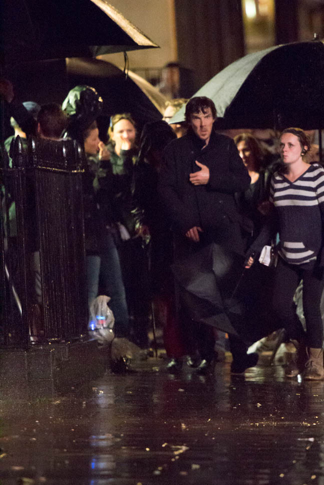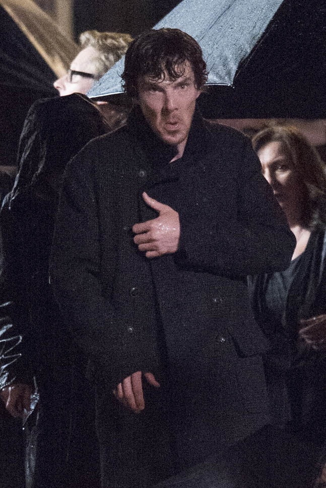 Sherlock series four filming is ongoing in the UK, with the latest round of set pictures showing Martin Freeman, Amanda Abbington, and Benedict Cumberbatch getting drenched in the rain while solving a potentially rain-related mystery. The Batch looks especially Byronic with rain-drenched curls and at what point in his career does he play Colonel Brandon in a remake of Sense and Sensibility? The Ang Lee/Emma Thompson version is flawless, but can we all agree that Cumberbatch would make a great Colonel Brandon anyway? Although he is looking a little scruffy, which is maybe a clue that Sherlock’s relapse plot is ongoing throughout the season. That would be solid—Sherlock needs to get back to actual storytelling and not fan service.