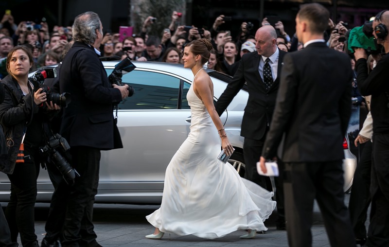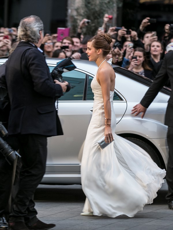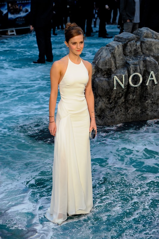 The UK premiere of Noah is happening tonight in London, although if you were just looking at Emma, you’d think it might be her wedding. It’s a very wedding-y dress, especially the top half. And that’s a wedding hair style too, right down to the white pins she’s used to secure the updo. She seems to be very attached to a part whenever she wears her hair up too. It’s always a part. It’s never no part, scraped all the way back. Why is that?