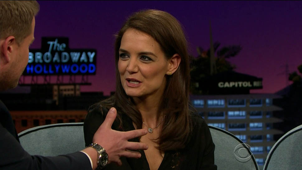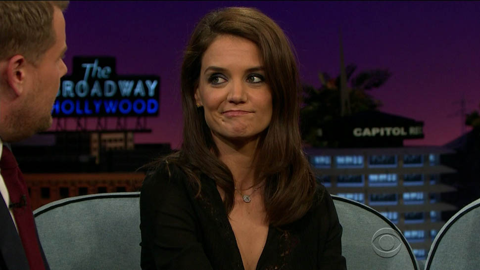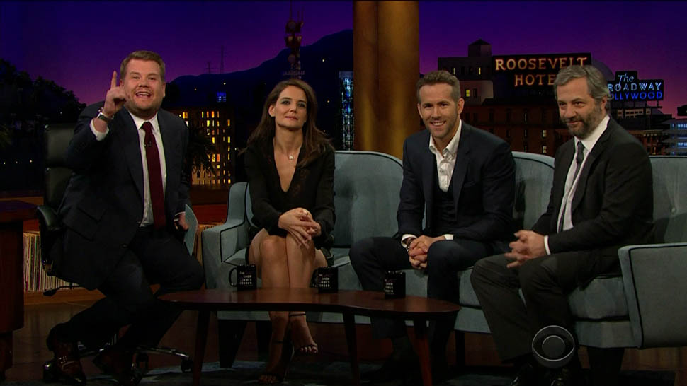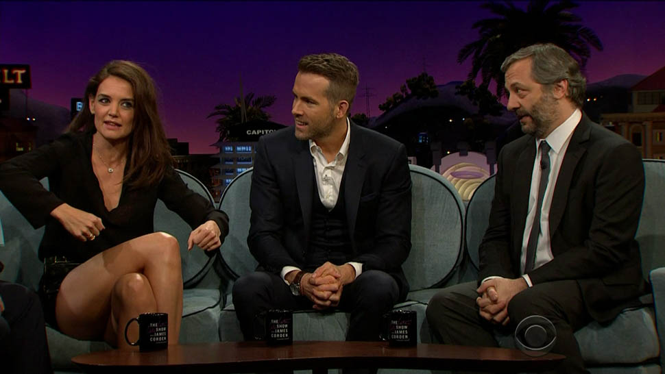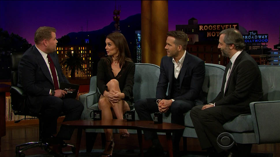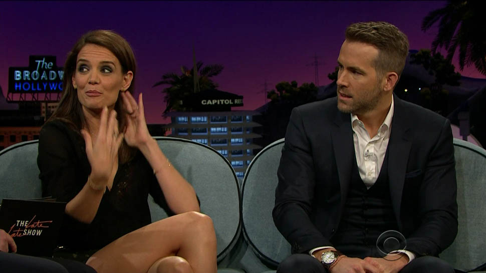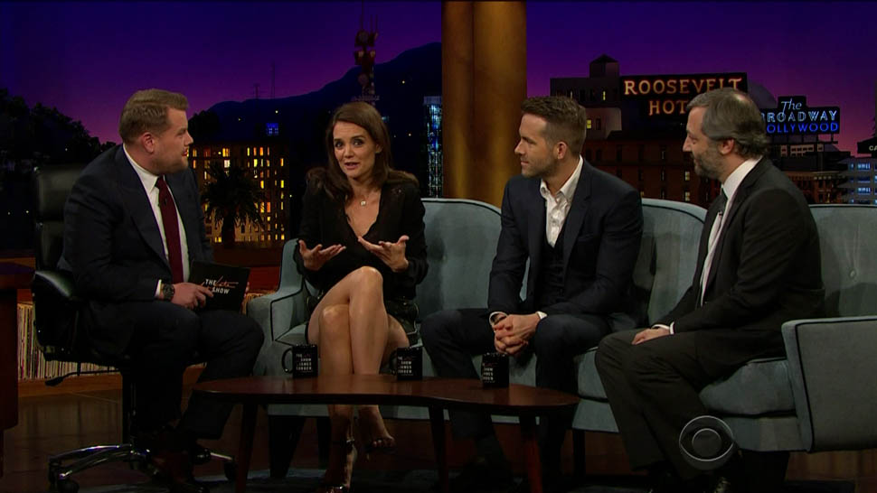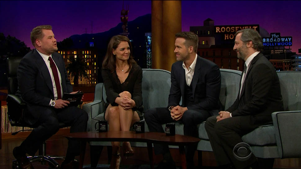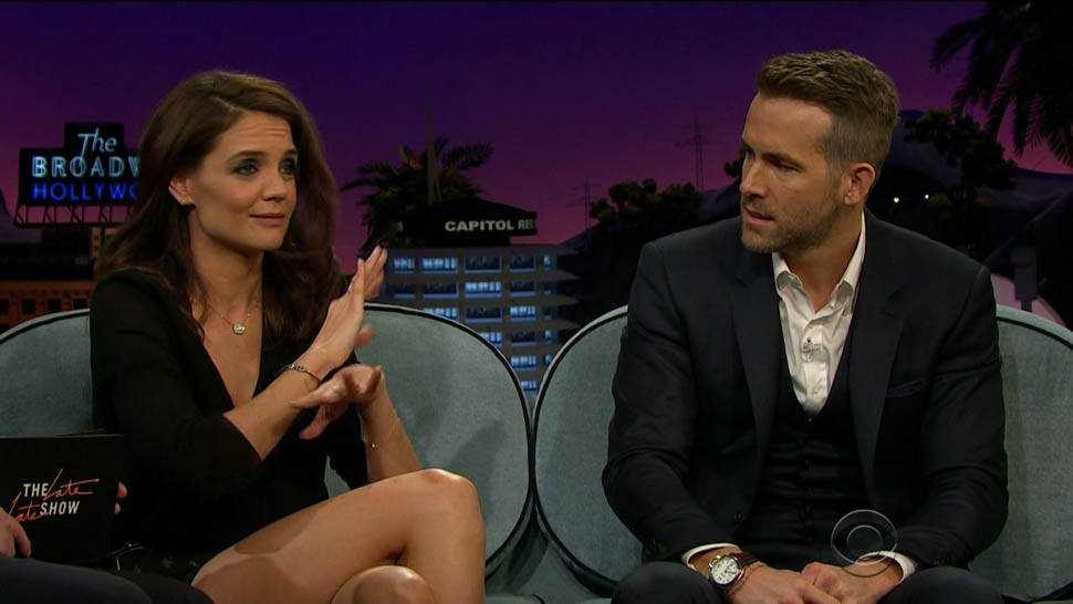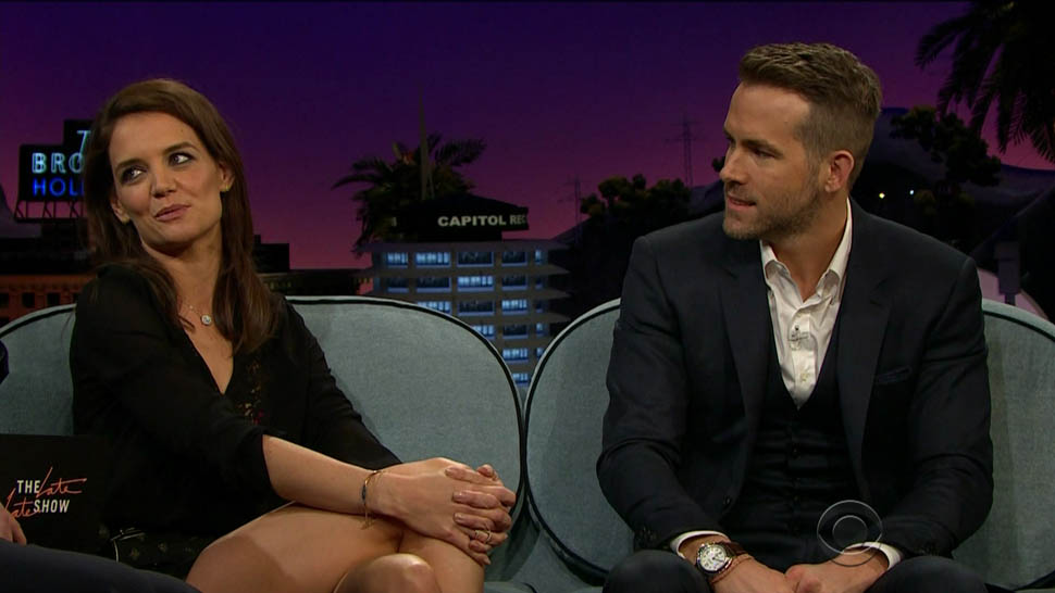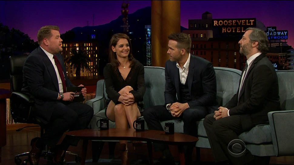 Katie Holmes believes Joshua Jackson was a better kisser than James Van Der Beek, but we wouldn’t know this if not for Ryan Reynolds. Katie and Ryan were both on The Late Late Show with James Corden last night, their second talk show appearance together in around 10 days. Katie is typically shy and cagey so she tried to dodge Corden’s kissing question, and only answered when Ryan talked about how he went to high school with Josh, so he knew the “truth.” In other words, he goaded her into a polite non-answer: