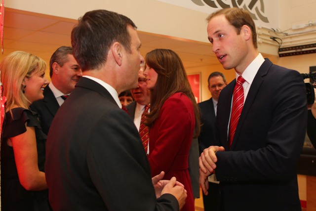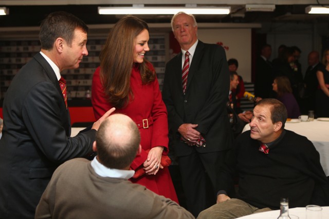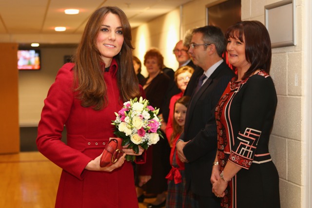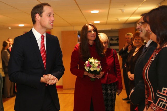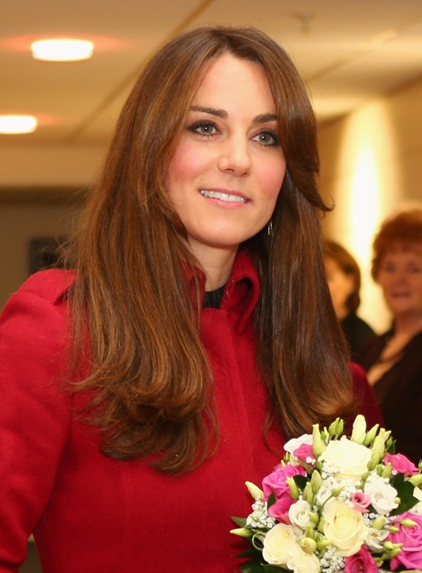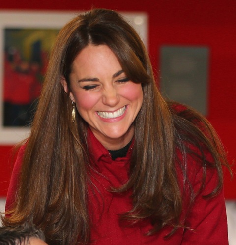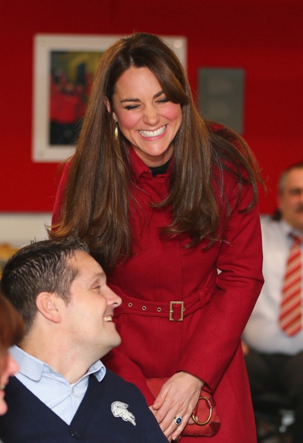 The Cambridges were in Cardiff this weekend supporting the Welsh Rugby Charitable Trust. They met with foundation members and then attended the game against New Zealand. Will wore a red tie, Kate wore a red coat, and her hair straighter than we’ve seen it in a while. I like it better this way, without the curls at the end and the layers framing her face. Somehow it makes her seem younger.